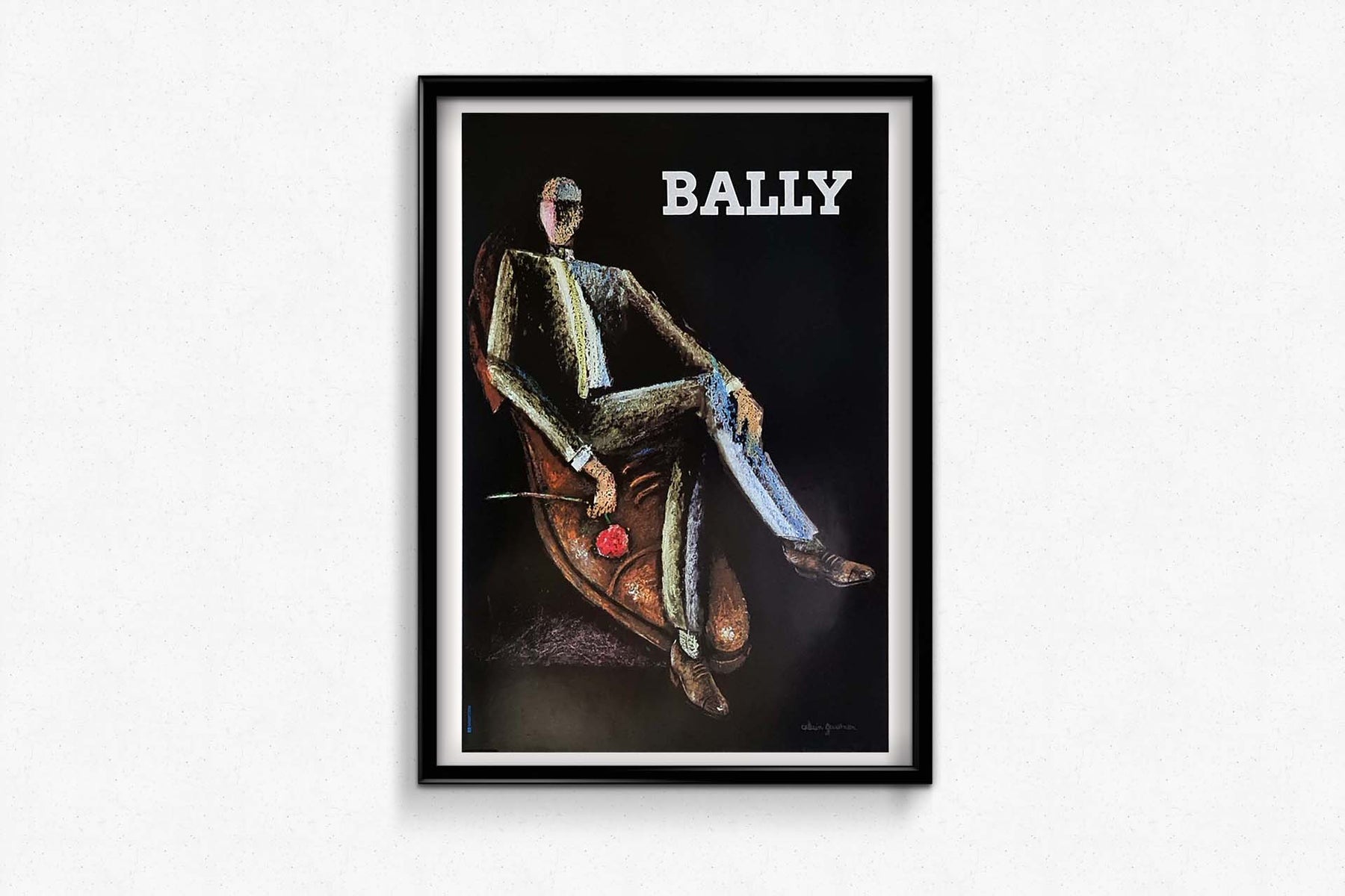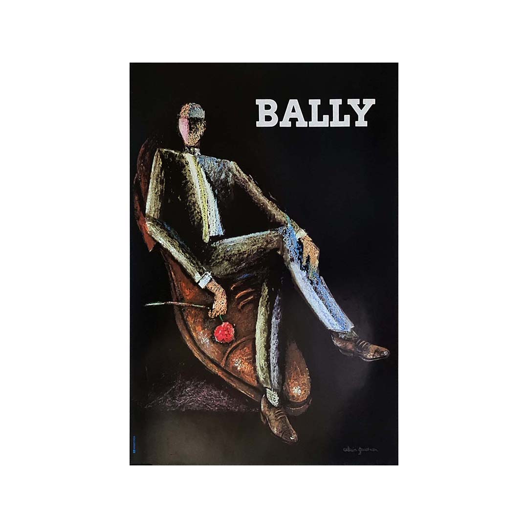 Magnifique affiche originale d'Alain Gauthier pour les chaussures pour hommes Bally. Bally est une entreprise fondée sous le nom de Bally & Co en 1851 par Carl Franz Bally (1821-1899) et son frère Fritz, dans la cave de la maison familiale à Schönenwerd (Soleil), en Suisse. Bally est principalement connue comme marque de chaussures, bien qu'elle propose également une gamme de prêt-à-porter et d'accessoires. Bally collabore avec des artistes tels qu'Otto Baumberger, Pierre Gauchat, Bernard Villemot, Hugo Laubi, Lise Berset et Alain Gauthier pour la création de ses affiches publicitaires.