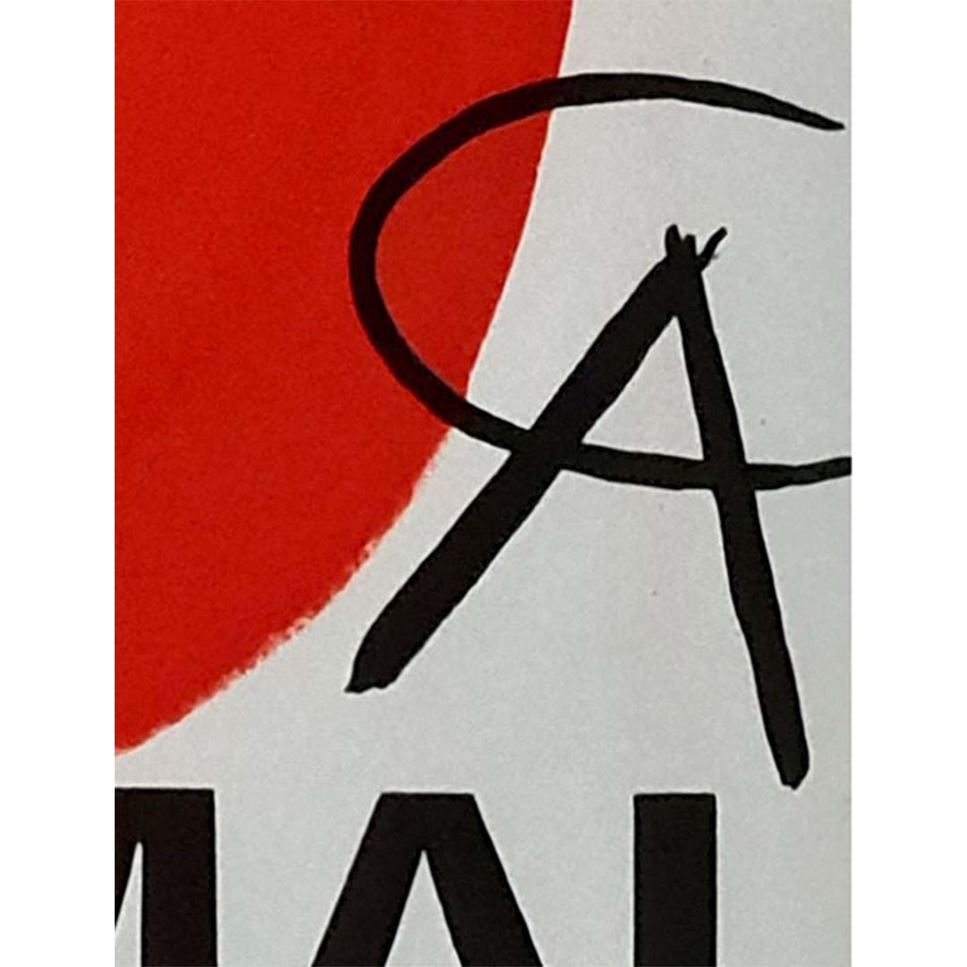Le langage visuel inimitable de Calder domine la composition : des formes organiques et abstraites, aux riches aplats de rouge, de noir et de bleu, semblent flotter sur la page, évoquant ses célèbres mobiles et sculptures. Avec une mise en page asymétrique saisissante et un fond blanc minimaliste, l’affiche incarne la clarté énergique et l’équilibre qui caractérisent l’œuvre de maturité de Calder. Sa signature distinctive « CA » apparaît en gras en bas à droite, confirmant qu’il en est l’auteur.