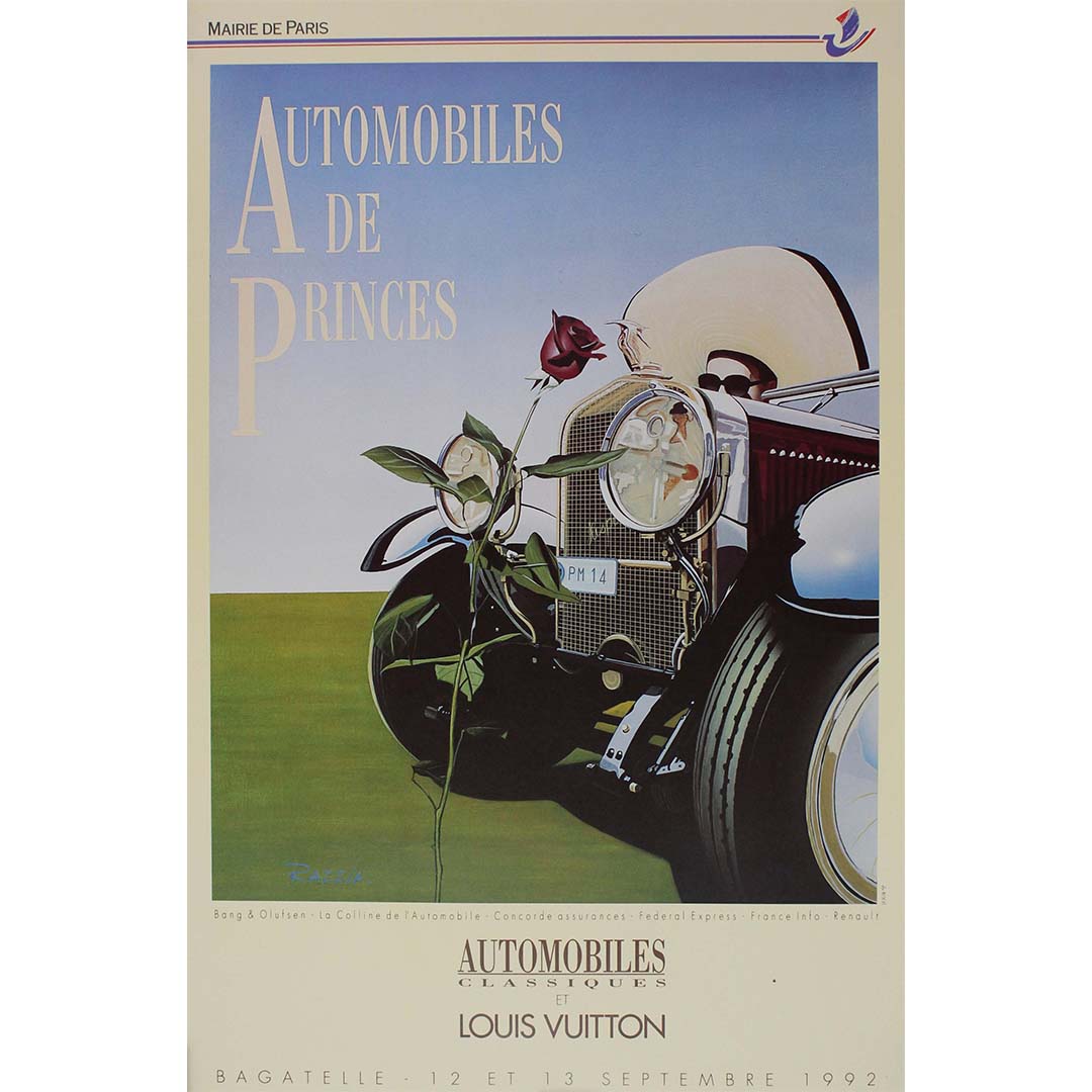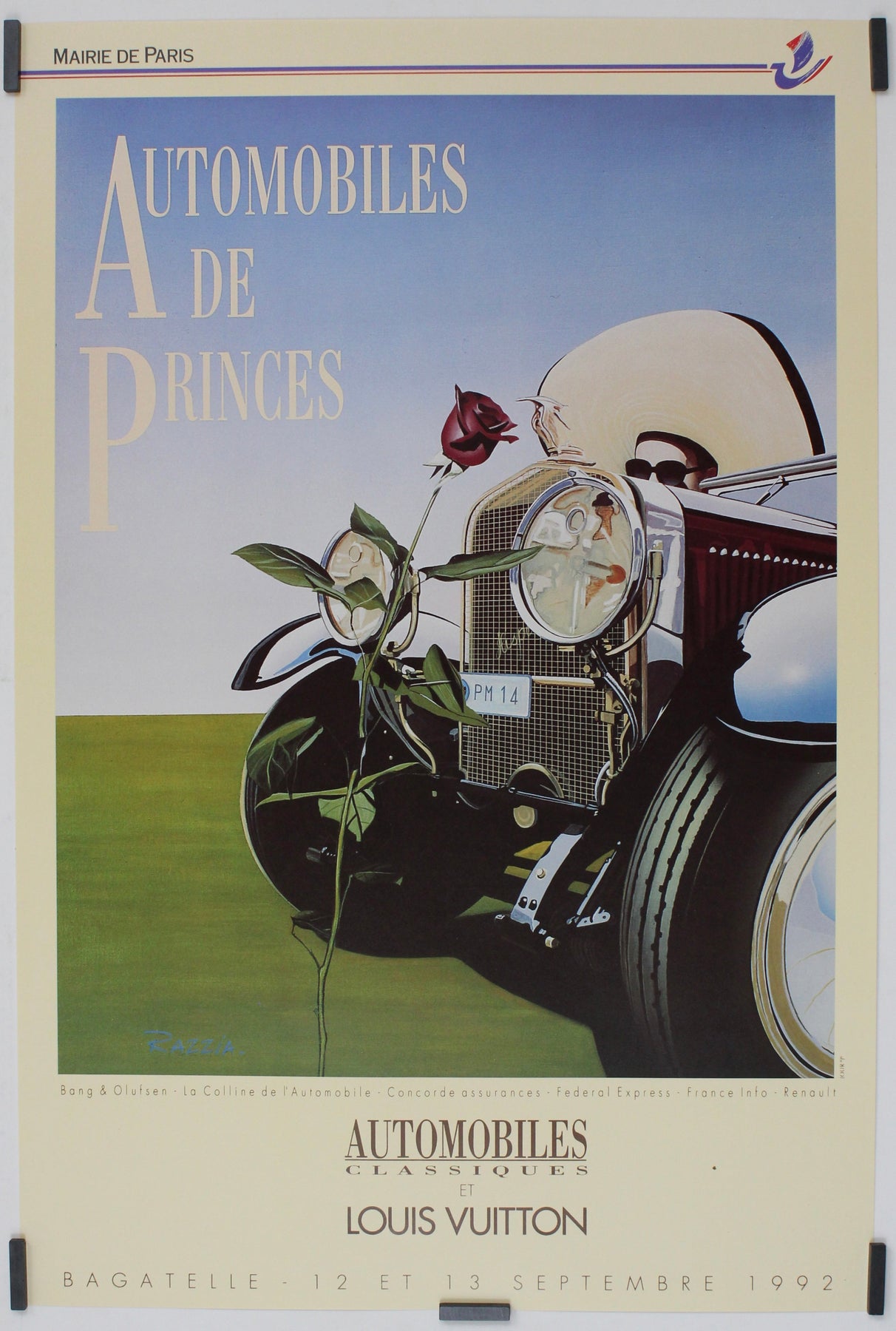 Créée par le célèbre graphiste français Gérard Courbouleix-Dénériaz, dit Razzia, l'affiche originale de 1992 « Automobiles Classiques et Louis Vuitton » incarne l'élégance et le luxe. Né en 1950, Razzia est reconnu pour son attachement aux techniques traditionnelles de l'affiche, refusant ainsi la domination du numérique.