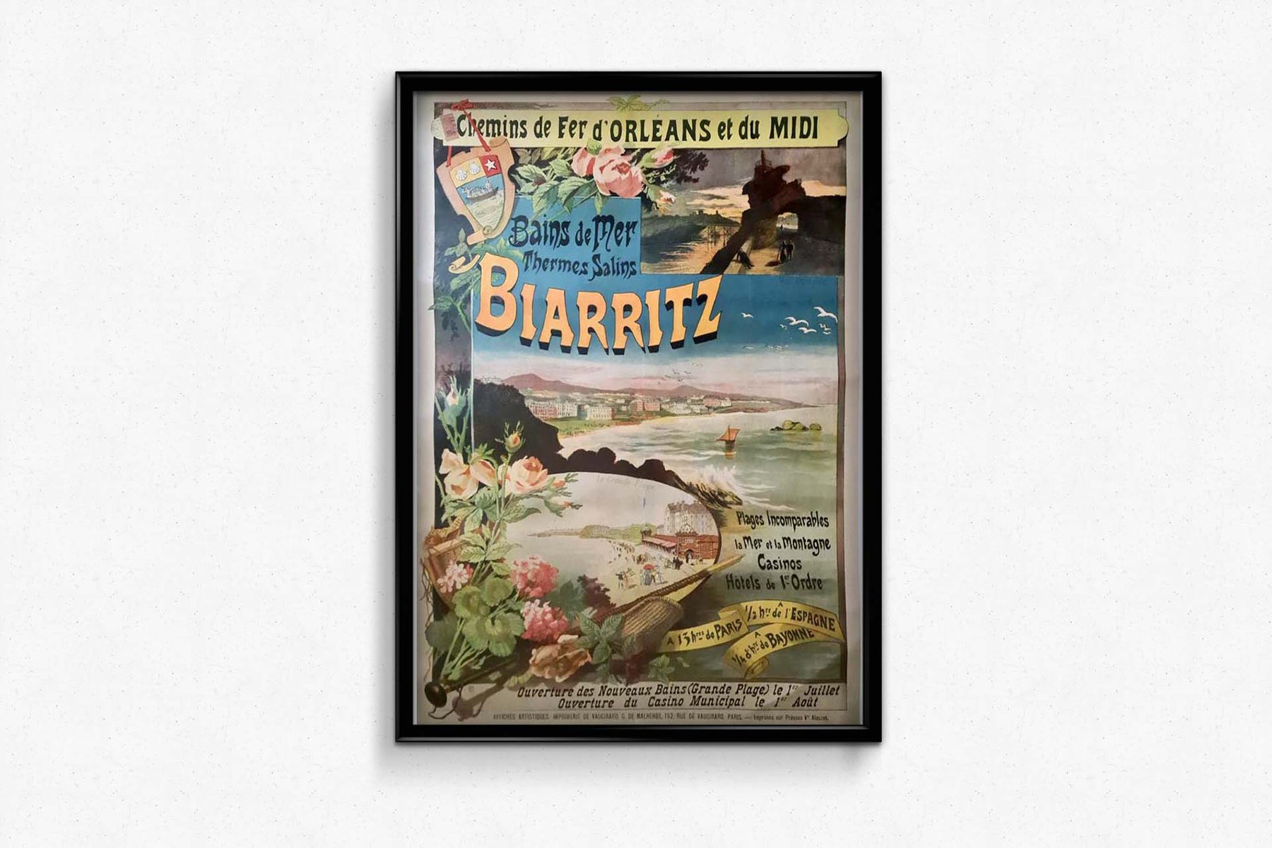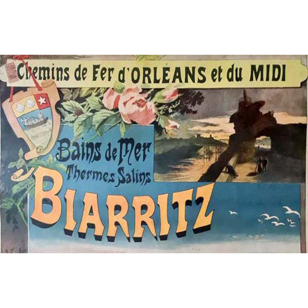 L'affiche originale de Gustave Fraipont pour le Chemin de Fer d'Orléans et du Midi vers Biarritz, représentant les Bains de Mer et les Thermes Salins, est une création artistique qui incarne l'élégance du voyage et le charme d'une destination balnéaire populaire.