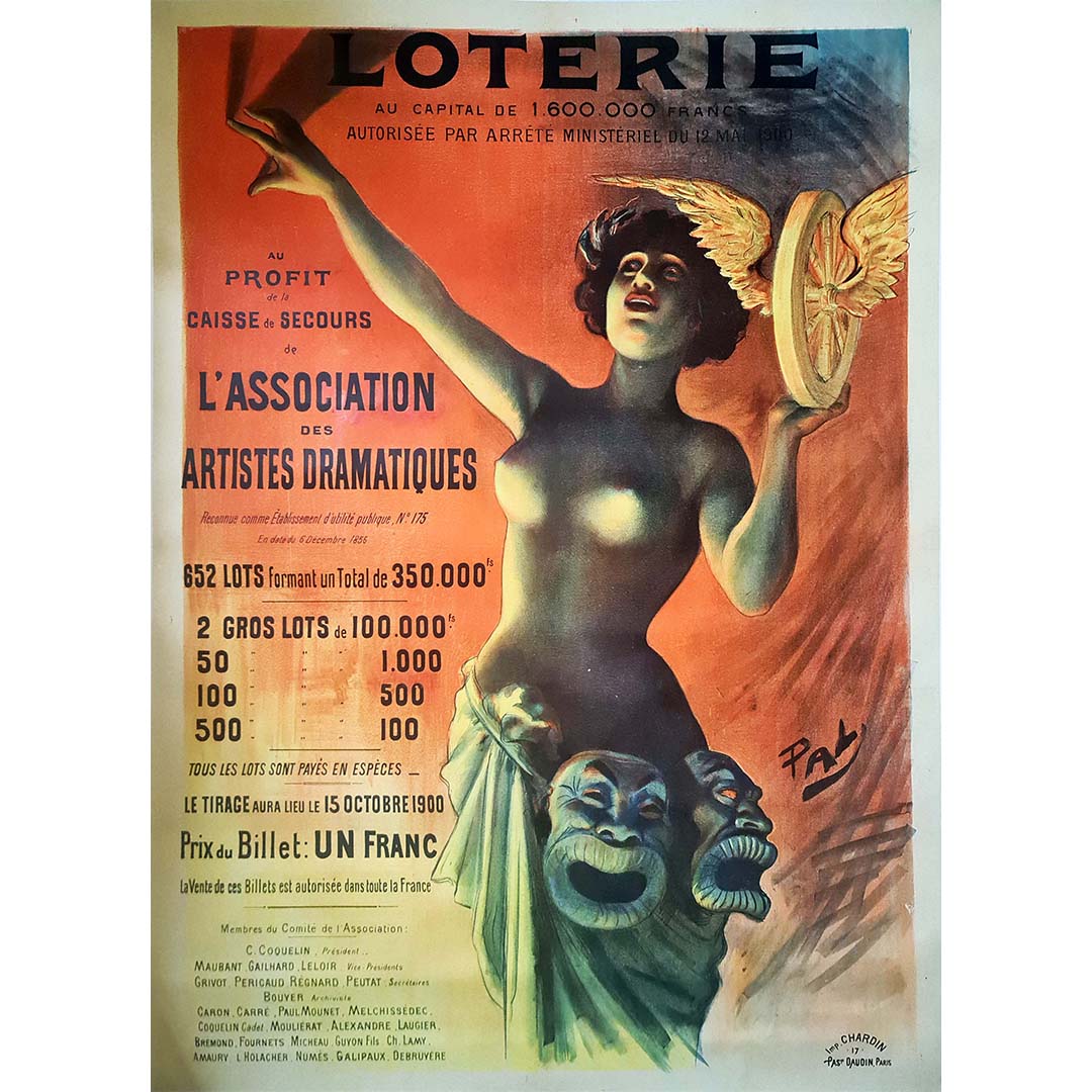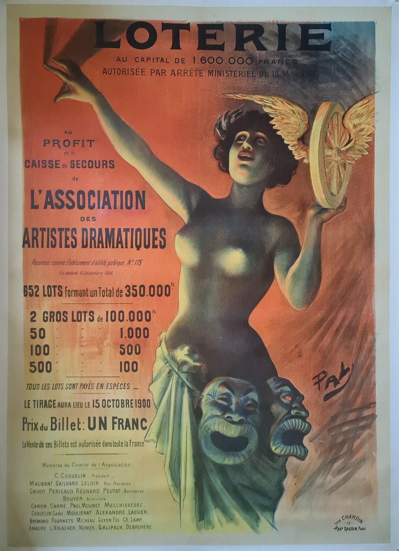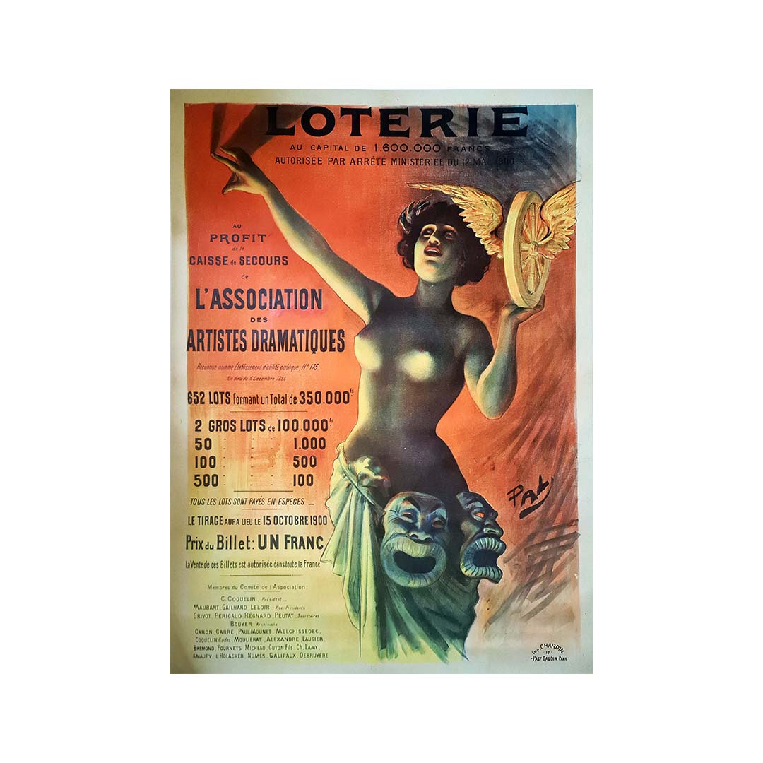 Affiche exceptionnelle de la Loterie Nationale française destinée à collecter des fonds pour l'Association des artistes dramatiques, représentant une figure allégorique (peut-être le Drame) tenant la roue ailée du progrès et portant un masque de tragédie et de comédie autour de la taille.