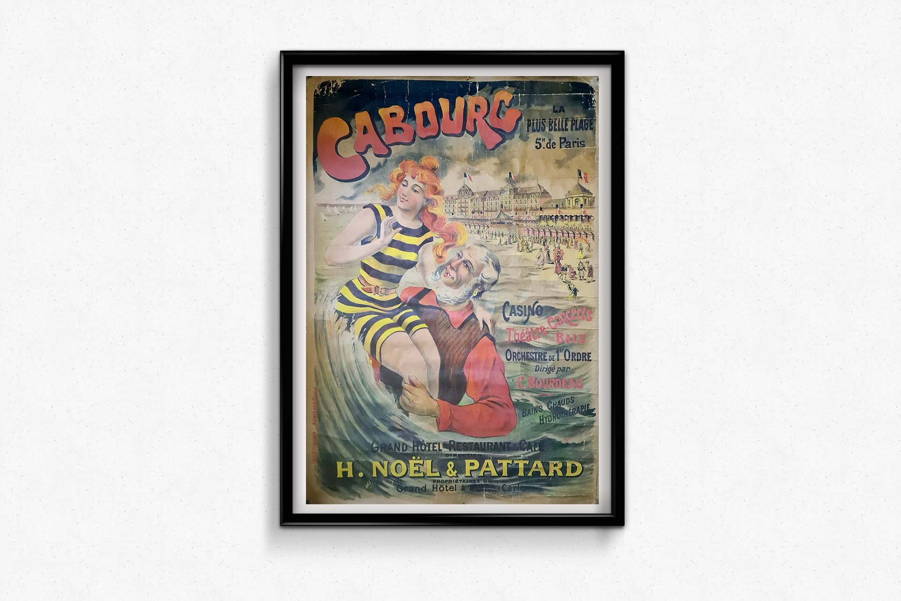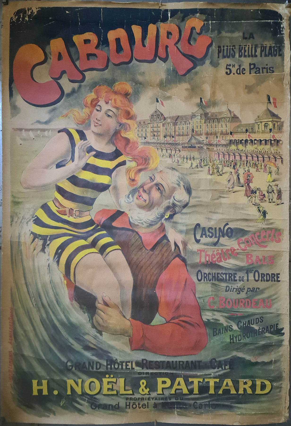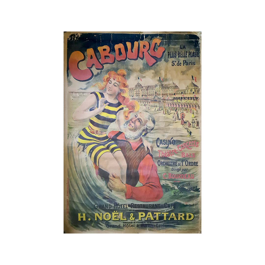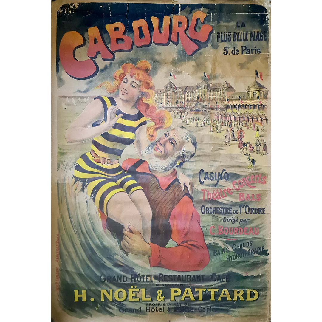 La typographie est audacieuse et ludique, avec « Cabourg » mis en valeur en grandes lettres rouges. Le texte d'accompagnement souligne les diverses attractions de la station : le casino, le théâtre, les concerts, les bals et un orchestre de premier ordre dirigé par C. Bourdeau. L'affiche met également en avant les thermes et les services d'hydrothérapie de la station, séduisant ainsi ceux qui recherchent bien-être et détente.