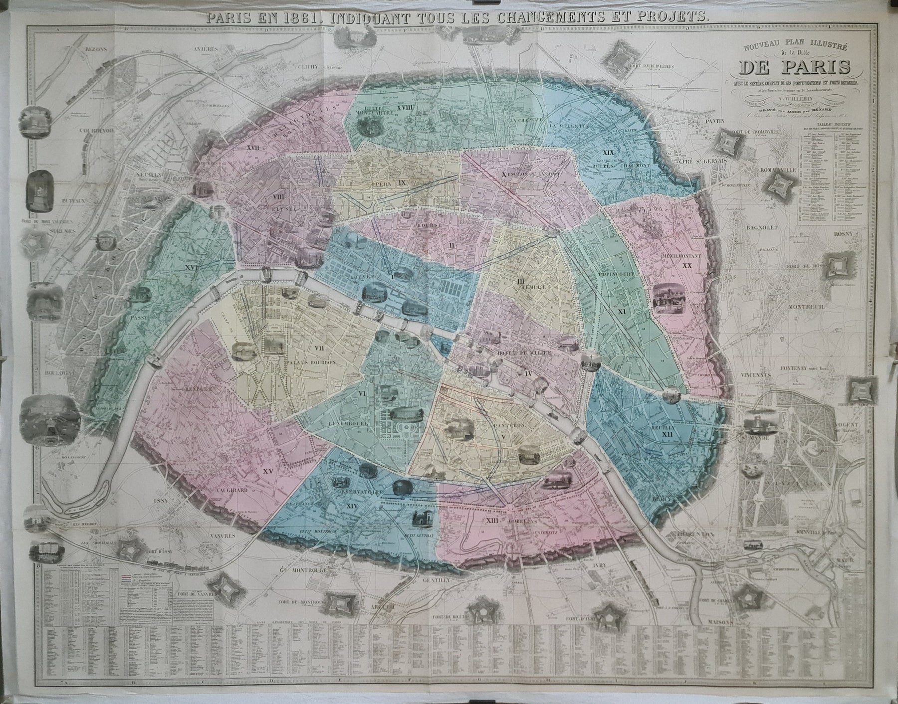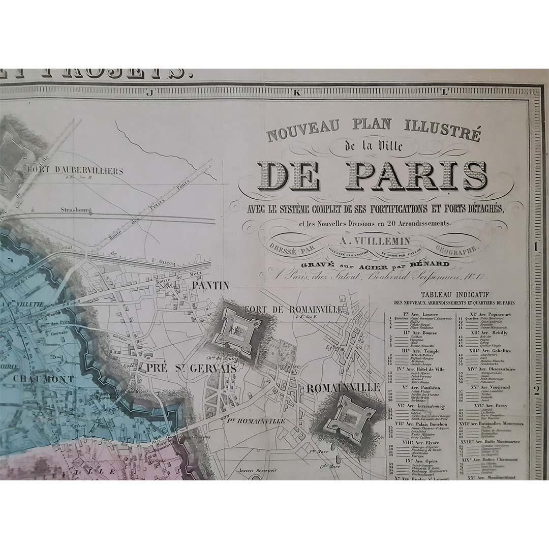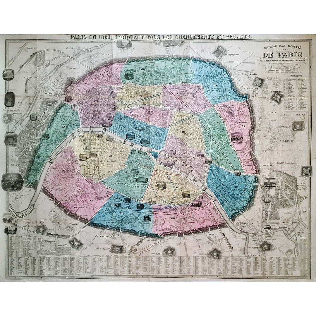 Le « Nouveau Plan Illustré de la Ville de Paris avec le Système Complet de ses Fortifications et Forts Détachés » de 1861, dressé par A. Vuillemin, est une remarquable cartographie historique qui témoigne de l'évolution urbaine de la capitale française au XIXe siècle. Élaboré par Alexandre Vuillemin, cartographe renommé de son temps, ce plan représente avec précision la topographie de Paris, y compris ses fortifications et ses forts détachés, qui constituaient alors un élément essentiel de la défense de la ville.
