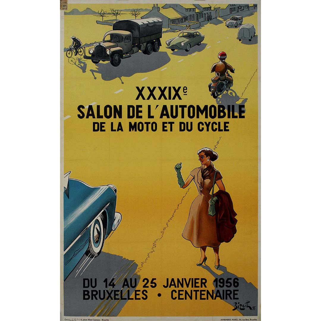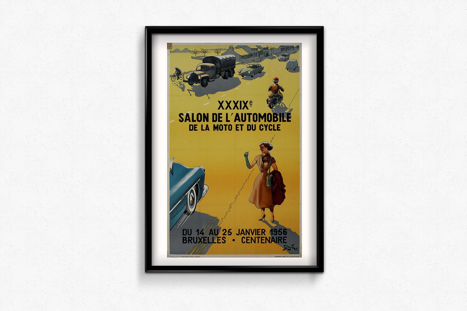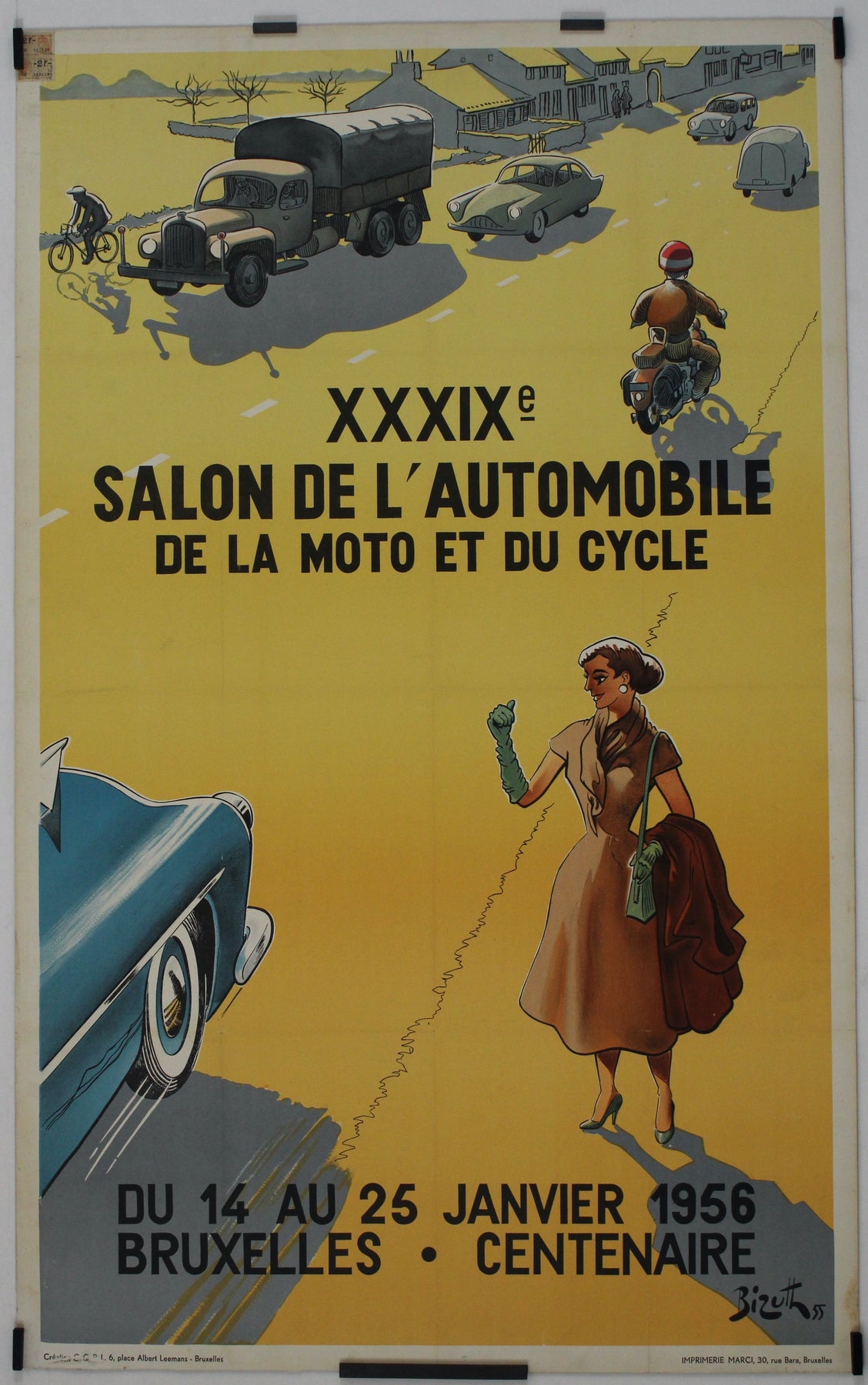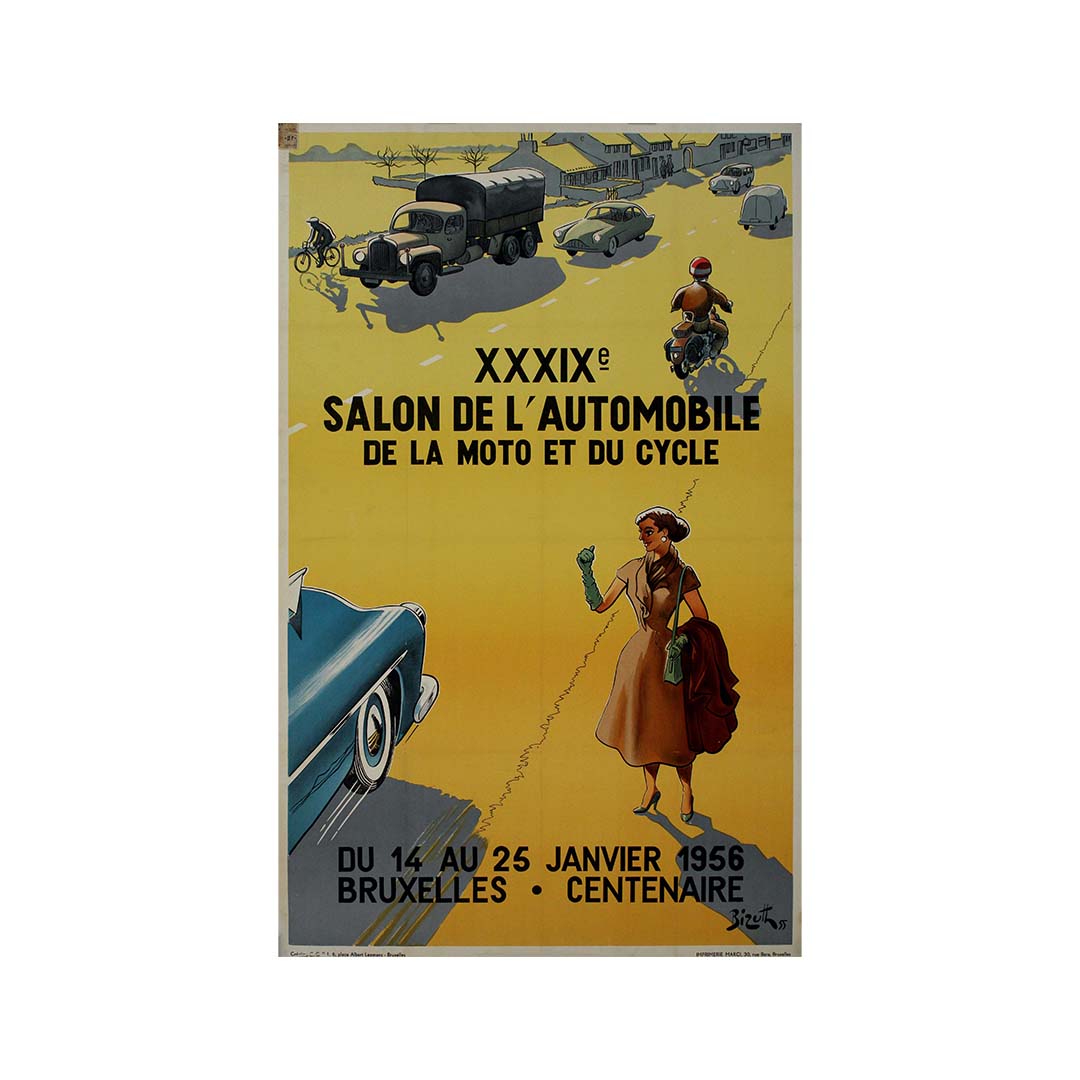 Le XXXIXe Salon de l'Automobile, de la Moto et du Cycle, qui s'est tenu à Bruxelles en 1956, célébrait l'innovation, le design et les possibilités infinies de la route. Au cœur de cet événement dynamique figurait l'affiche captivante de l'artiste Bizuth, une œuvre emblématique qui, en plus d'attirer les passionnés à l'exposition, incarnait l'enthousiasme de l'époque pour le progrès.