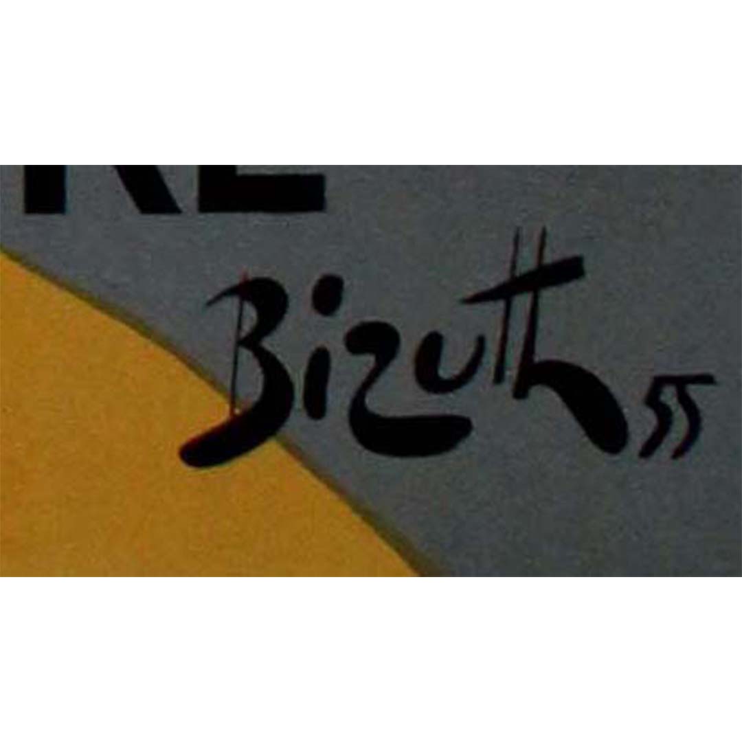 L'affiche met en scène une automobile, une moto et un vélo stylisés, coexistant harmonieusement et symbolisant la diversité des offres proposées aux visiteurs. L'utilisation par Bizuth de couleurs vives et audacieuses et de lignes épurées capture l'essence de la vitesse et de la modernité, faisant écho à l'effervescence et au progrès qui ont marqué l'industrie automobile du milieu du XXe siècle.