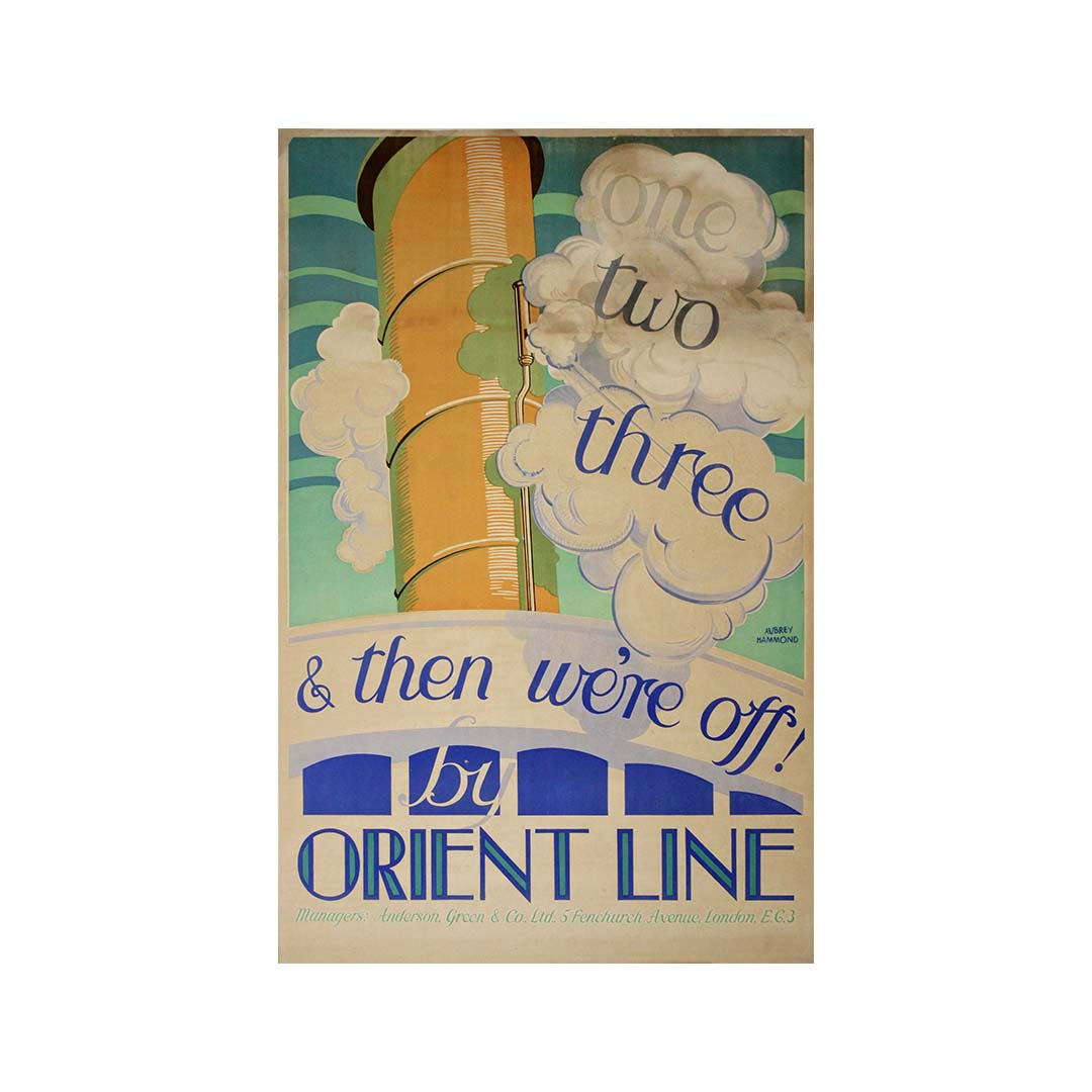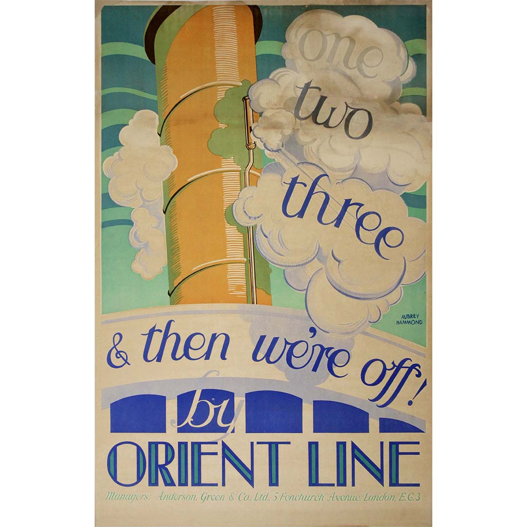 L'affiche de voyage originale d'Aubrey Hammond, datant d'environ 1920 et intitulée « Un, deux, trois et c'est parti ! » pour Orient Line, dégage un charme irrésistible qui résume l'excitation et l'impatience d'entreprendre un voyage avec la prestigieuse compagnie Orient Line.