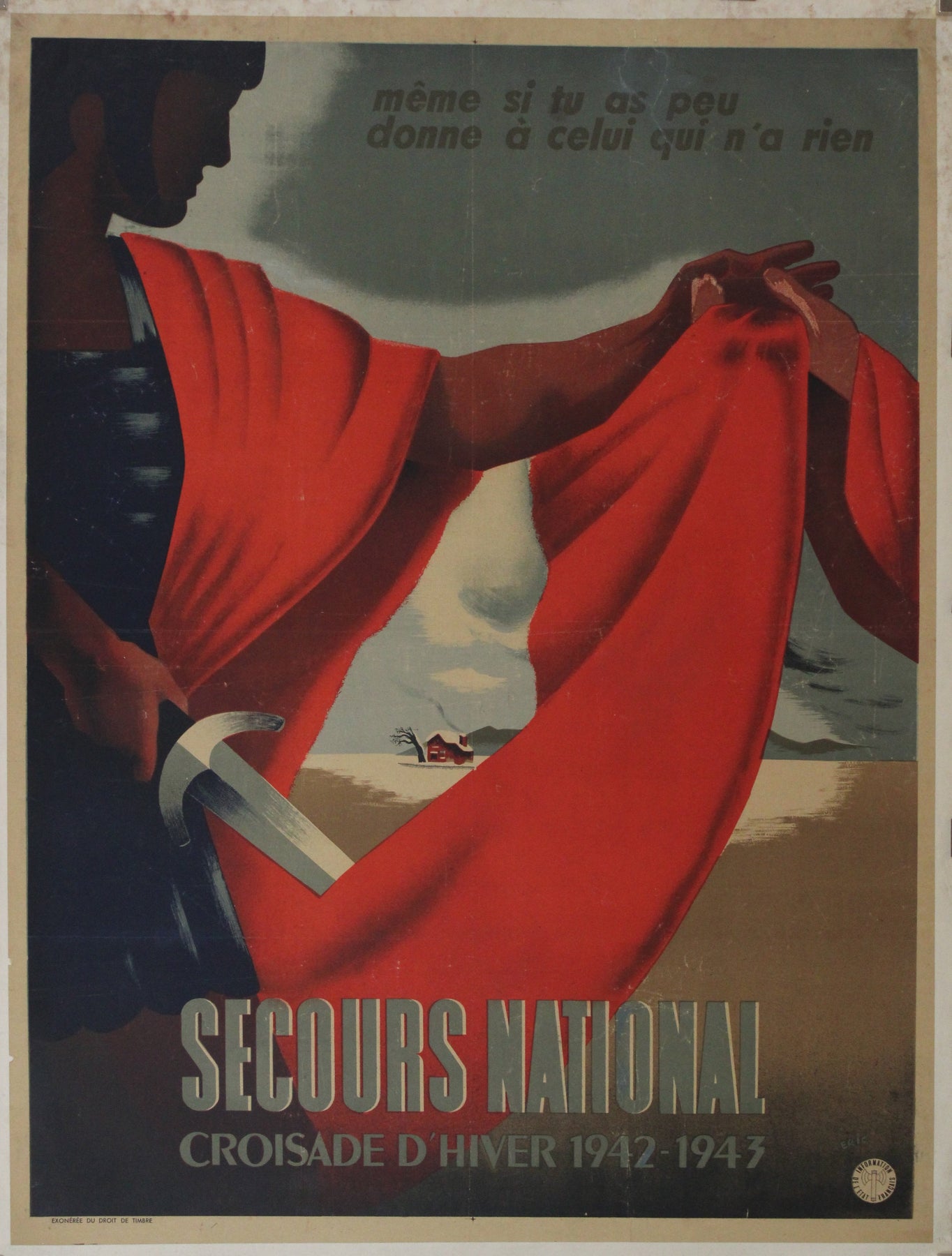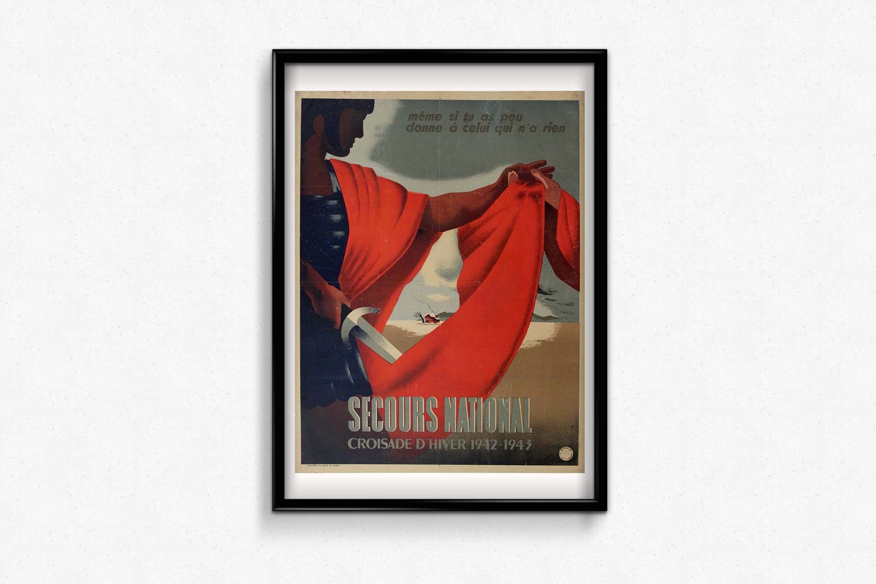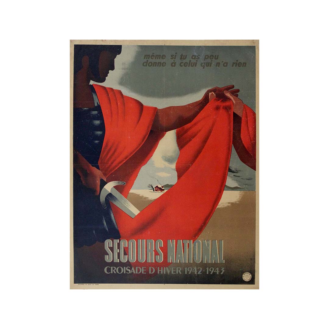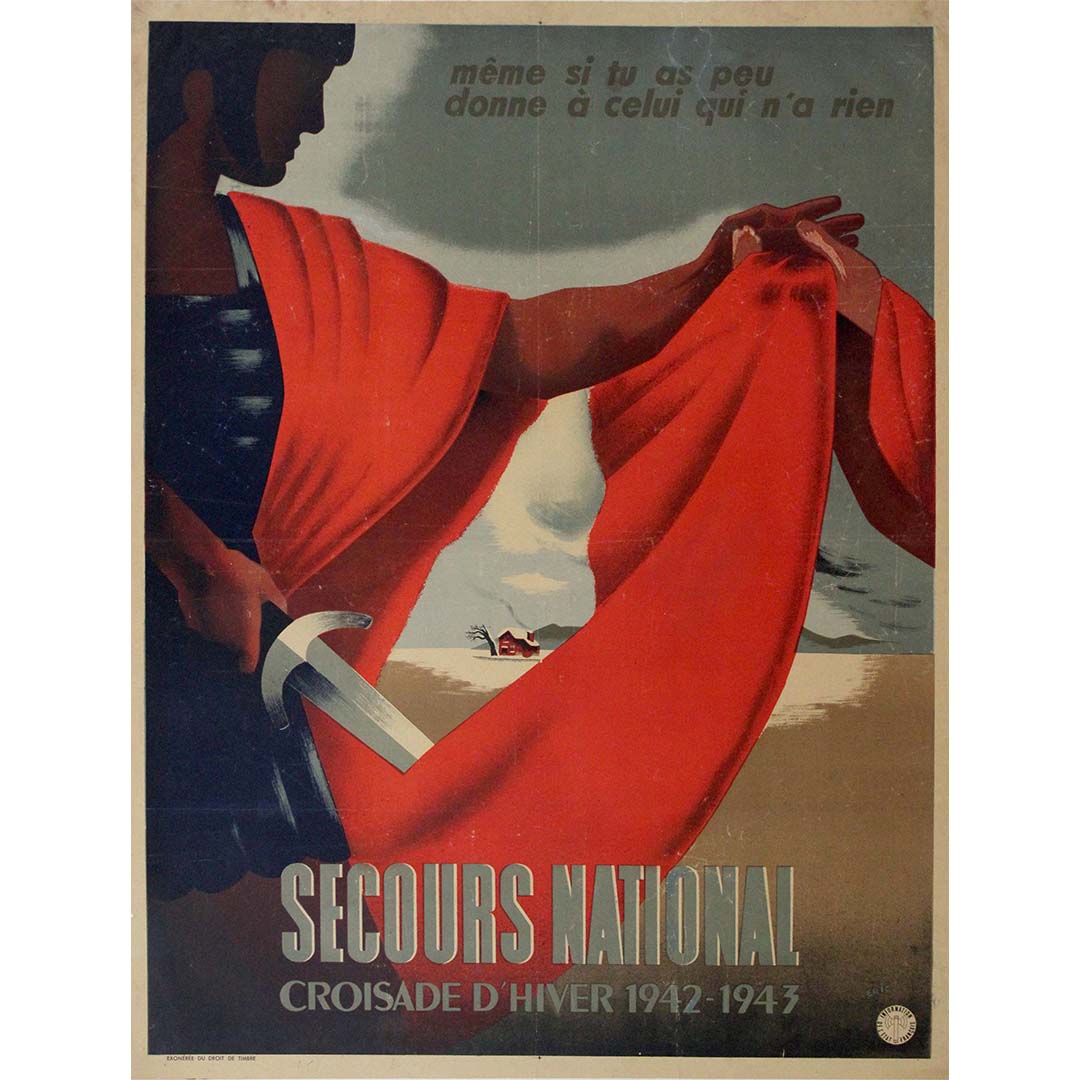 Historiquement, l'hiver 1942-1943 fut une période particulièrement difficile pour la France, occupée par les forces allemandes et confrontée à des pénuries de nourriture, de carburant et d'autres produits de première nécessité. Le Secours National joua un rôle crucial en apportant son aide, en distribuant vivres, vêtements et matériel de chauffage aux personnes dans le besoin. Cette affiche aurait été un outil indispensable dans leurs efforts pour mobiliser les ressources nécessaires et obtenir le soutien de la population.