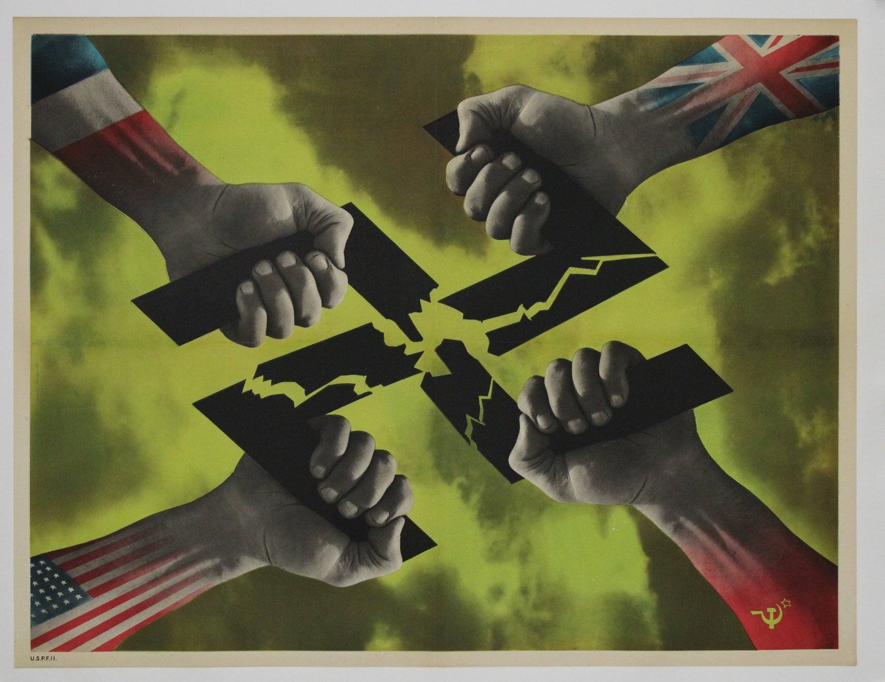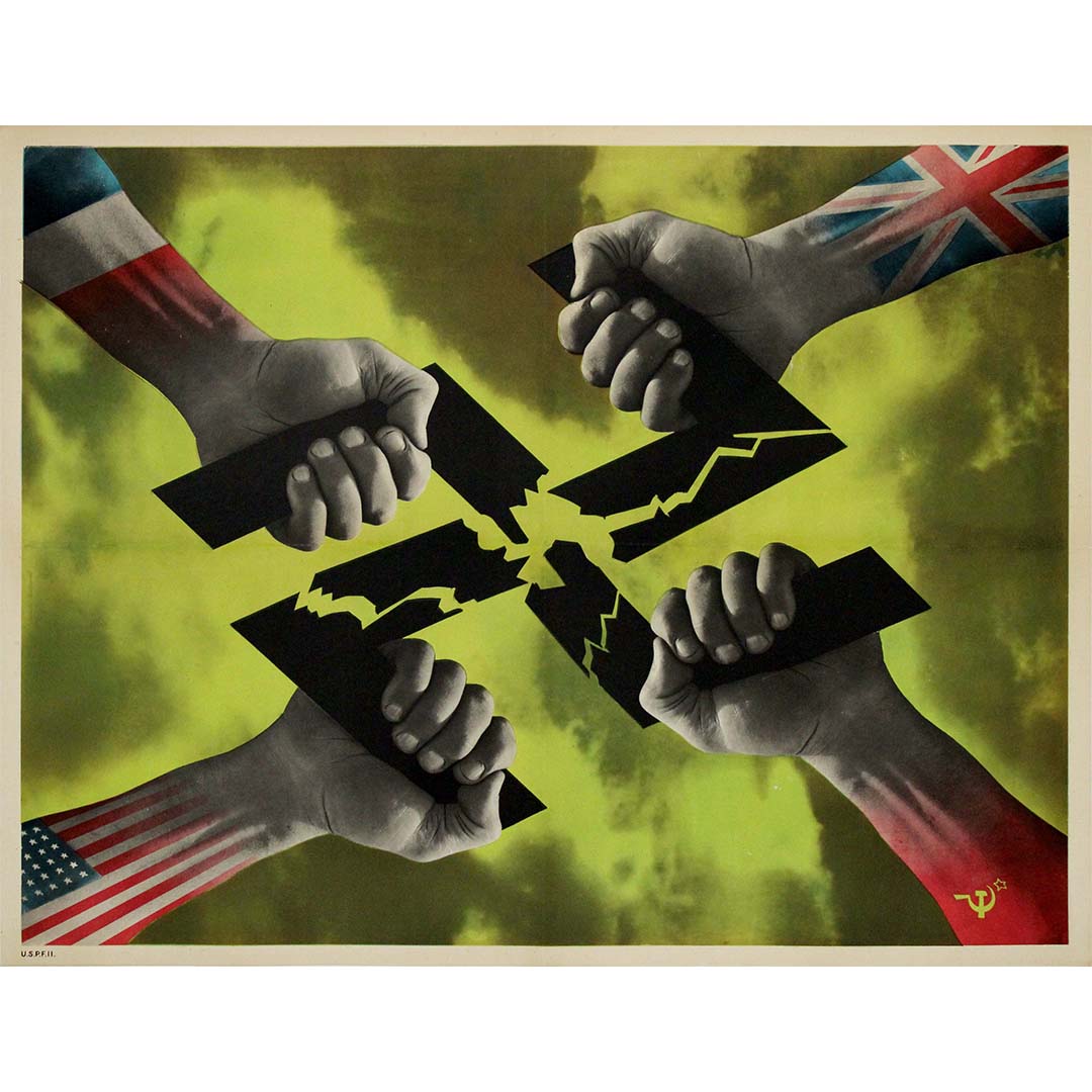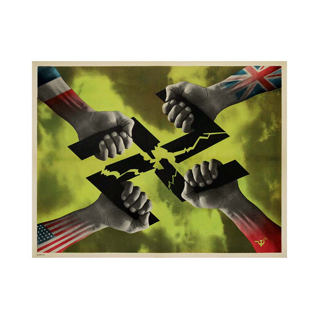 L'affiche originale de 1944 environ, représentant la « Croix gammée brisée par les alliés », est une œuvre de propagande marquante de la Seconde Guerre mondiale. Elle illustre le triomphe des Alliés sur l'Allemagne nazie, symbolisé par la croix gammée brisée, emblème du régime nazi. Créée à un moment crucial de la guerre, cette affiche a stimulé le moral des Alliés et offert une représentation visuelle de l'espoir et de la victoire. L'image de la croix gammée brisée souligne la défaite imminente des puissances de l'Axe et le rétablissement de la paix et de la liberté. Ces affiches ont joué un rôle déterminant pour mobiliser le soutien populaire et maintenir le moral des populations civiles et militaires. Cette œuvre reflète non seulement les triomphes politiques et militaires de l'époque, mais témoigne également du pouvoir de l'art visuel à transmettre des messages profonds et chargés d'émotion durant l'une des périodes les plus difficiles de l'histoire moderne.