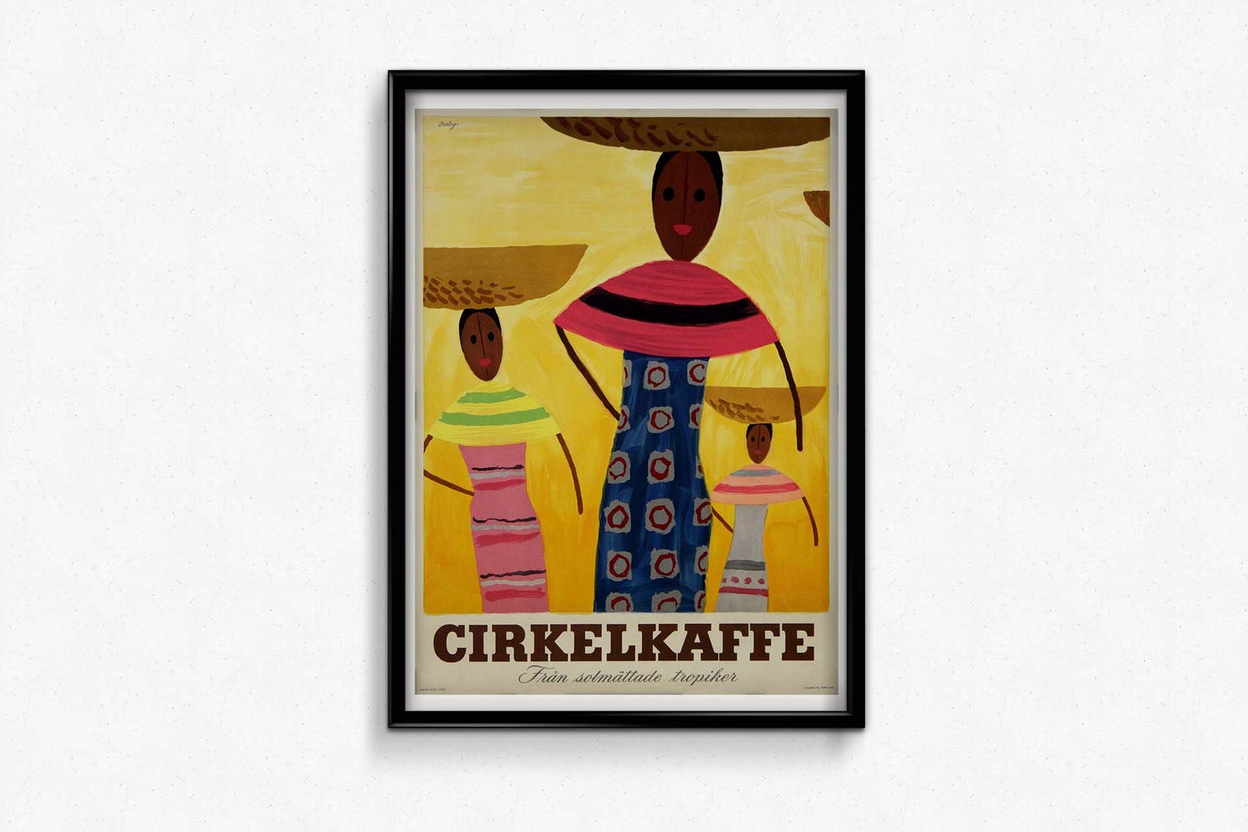 L'affiche présente trois personnages stylisés, vêtus de vêtements colorés à motifs, se détachant sur un fond jaune vif. Chacun porte un grand chapeau tressé, évoquant un décor tropical. Le personnage le plus imposant est vêtu d'un vêtement bleu à motifs circulaires rouges et blancs, tandis que les plus petits arborent des tenues tout aussi éclatantes. Ce jeu de couleurs et de motifs souligne les origines exotiques et ensoleillées du café, en accord avec le slogan « Från solmättade tropiker », qui signifie « Des tropiques ensoleillés ».