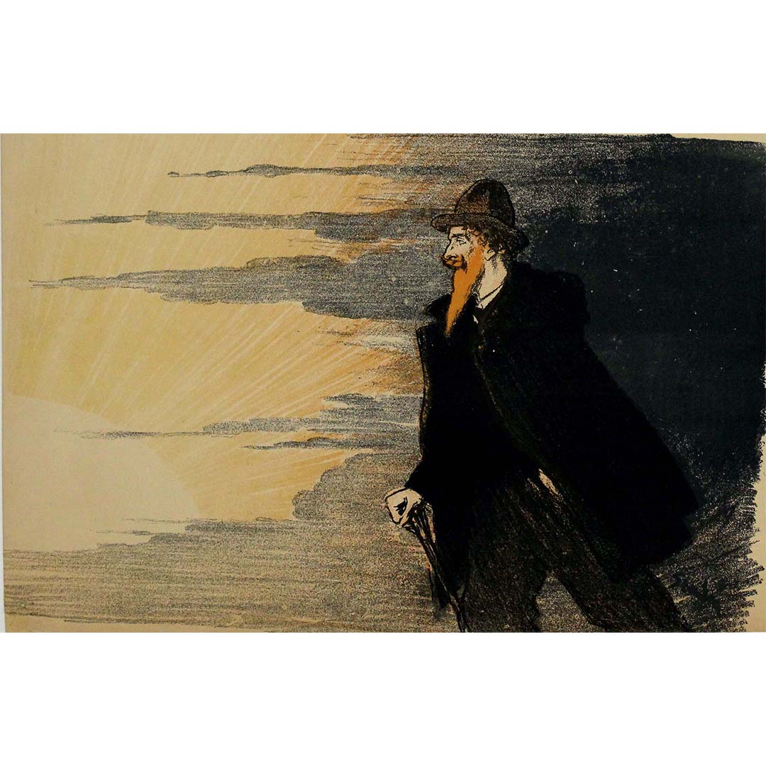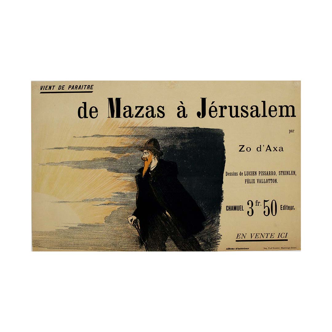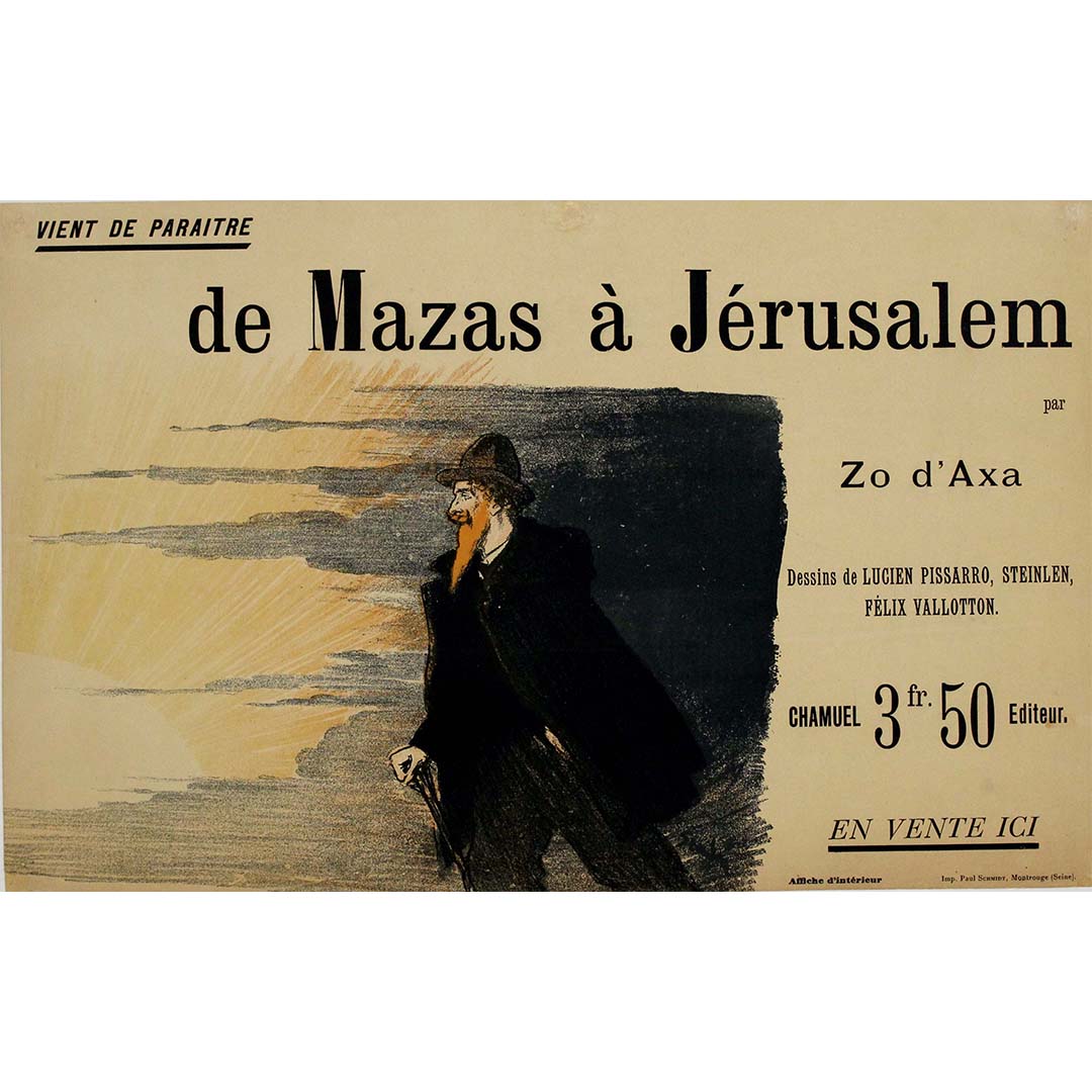 L'affiche originale de 1895, signée Steinlen et intitulée « De Mazas à Jérusalem par Zo d'Axa », offre un aperçu saisissant du contexte culturel et politique de l'époque. Créée par le célèbre artiste Théophile-Alexandre Steinlen, cette affiche saisit l'essence d'un important voyage littéraire entrepris par Zo d'Axa, figure emblématique de l'anarchisme et de la presse française.