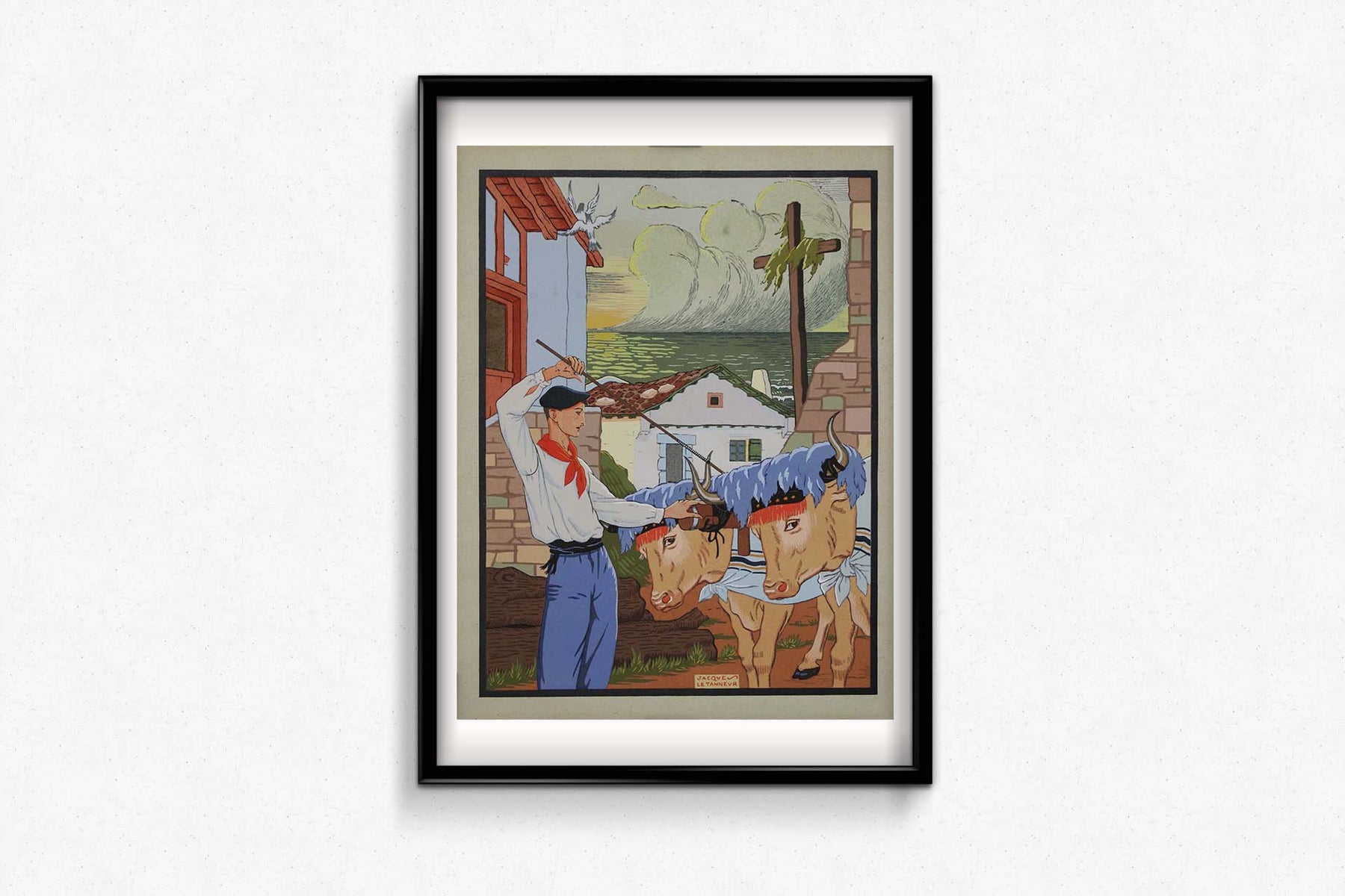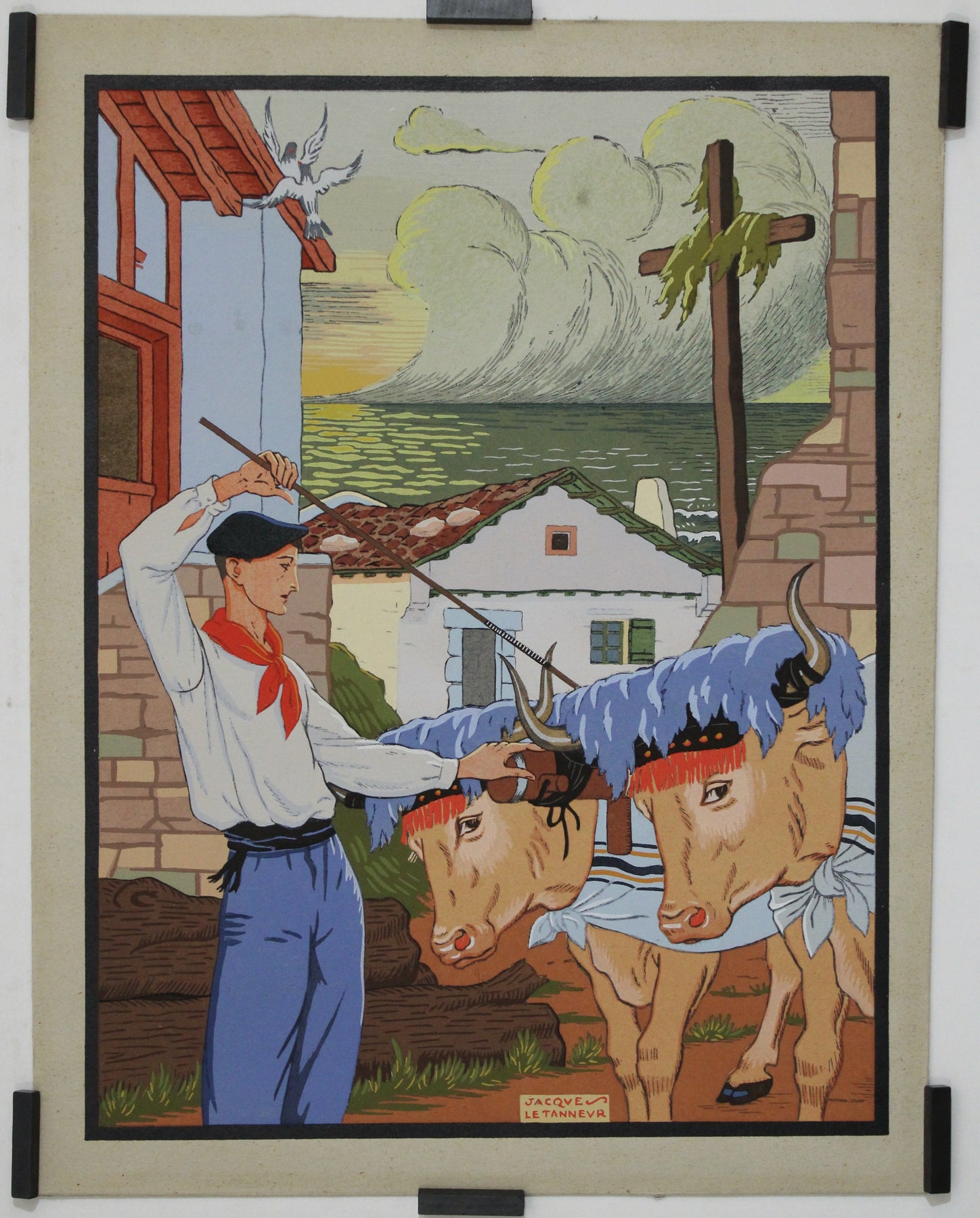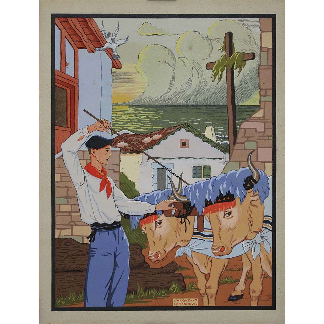Jacques Le Tanneur était réputé pour sa maîtrise du pochoir, qu'il utilisait pour représenter des thèmes et des scènes variés. Cette œuvre illustre parfaitement son talent pour retranscrire la vie culturelle et agricole. Le pochoir représente un Basque guidant un attelage de bœufs, un sujet qui souligne le lien profond qui unit les hommes et les pratiques agricoles traditionnelles au Pays basque.