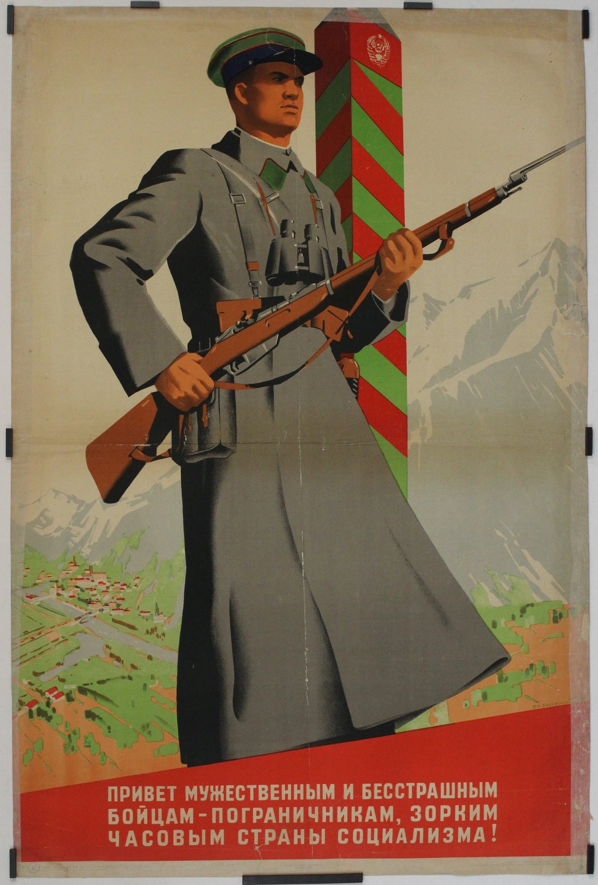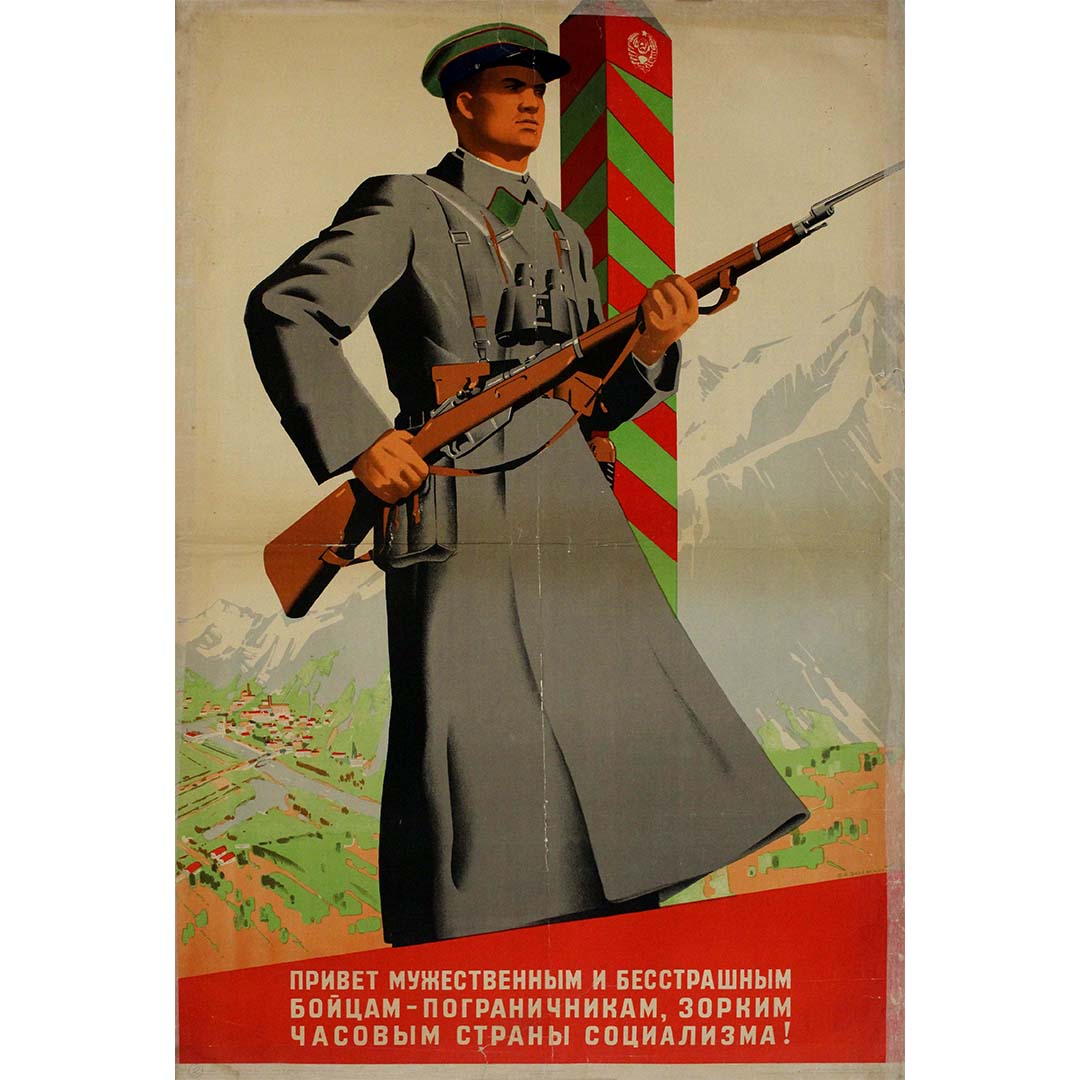 La fin des années 1930 fut une période de militarisation intense et de consolidation idéologique au sein de l'Union soviétique. Sous la direction de Joseph Staline, l'État insistait sur l'importance de la vigilance et de la défense contre les menaces extérieures perçues. Cette affiche, créée en 1939, témoigne de l'importance accrue accordée à la sécurité des frontières alors que l'Europe était au bord de la Seconde Guerre mondiale. Elle visait à inculquer un sens du devoir et de la fierté aux gardes-frontières soviétiques, en les présentant comme les courageux et vigilants gardiens du socialisme.