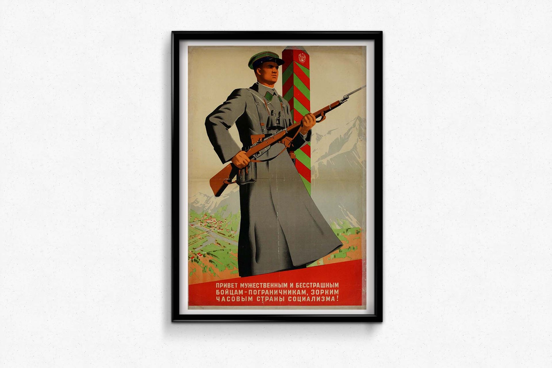Le fusil et les jumelles que porte le garde ne sont pas de simples accessoires ; ils symbolisent la disponibilité et la supériorité technologique de l’armée soviétique. L’ensemble est conçu pour inspirer un sentiment de sécurité et de confiance à la population soviétique, la rassurant quant à la protection de ses frontières par des soldats courageux et vigilants.