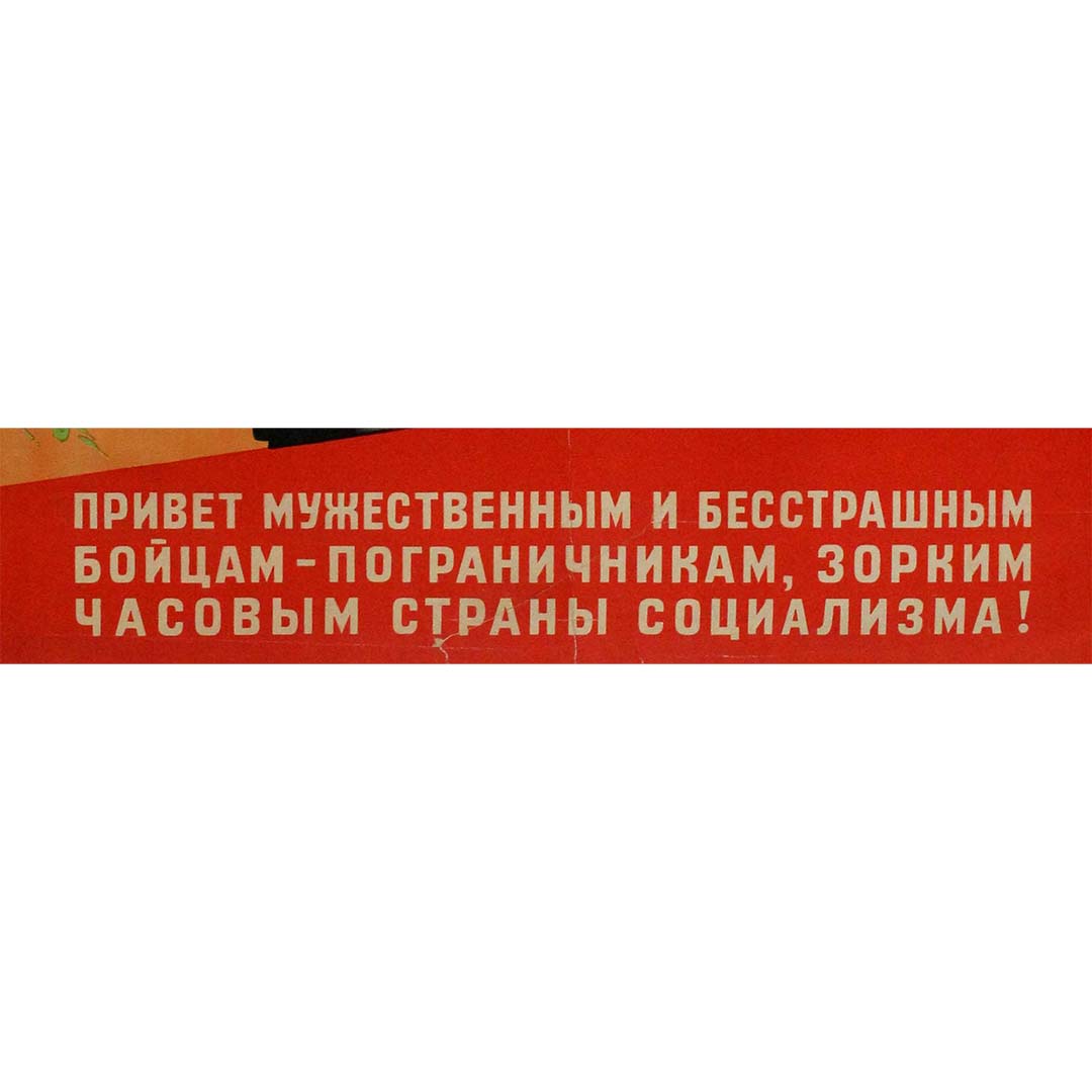 Le texte, affiché en évidence au bas de l'affiche, se traduit par : « Salutations aux courageux et intrépides combattants – gardes-frontières, sentinelles vigilantes de la terre du socialisme ! » Ce message est à la fois un hommage et un appel à l'action, réaffirmant le rôle vital des gardes-frontières dans la protection de l'État socialiste.