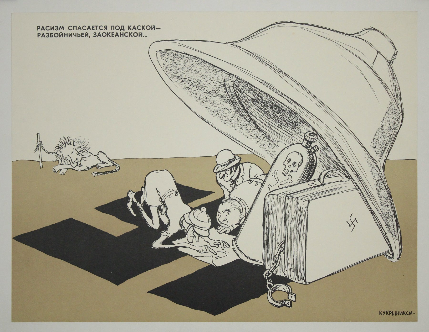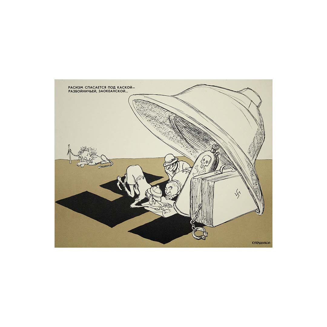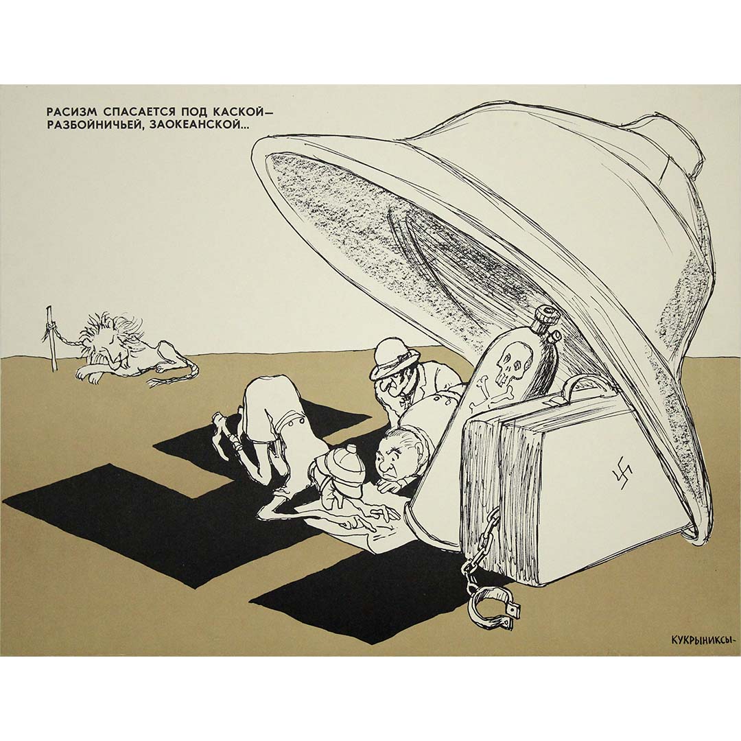 L'affiche originale de 1977 du collectif artistique soviétique Koukryniksy reflète leur style incisif de caricature politique et de satire. Actif des années 1920 aux années 1970, Koukryniksy, composé de Mikhaïl Koupriyanov, Porfiry Krylov et Nikolaï Sokolov, a produit certaines des œuvres de propagande les plus marquantes du XXe siècle. Cette affiche aborde les thèmes de l'antiracisme et de l'antifascisme, dans un contexte de fortes tensions liées à la Guerre froide, alors que la propagande soviétique visait à critiquer le colonialisme et le racisme occidentaux. Elle s'inscrivait dans la stratégie de communication plus large de l'URSS, destinée à inspirer la solidarité avec les mouvements pour l'égalité dans le monde et à dénoncer les manquements moraux perçus des nations rivales. L'affiche utilise un symbolisme et une caricature audacieux pour délivrer un message politique fort, fidèle à la tradition de satire percutante du collectif. Aujourd'hui, les œuvres de Koukryniksy sont considérées comme des témoignages historiques précieux, offrant un aperçu des perspectives soviétiques durant la Guerre froide. Cette affiche de 1977 reste une pièce recherchée par les collectionneurs intéressés par l'art de propagande, l'histoire soviétique et l'utilisation des médias visuels comme outil de communication politique.