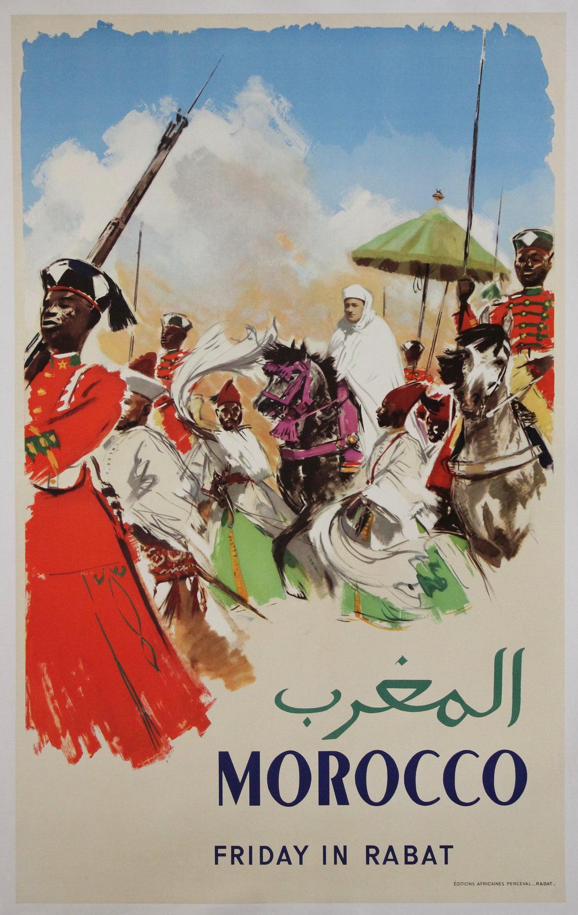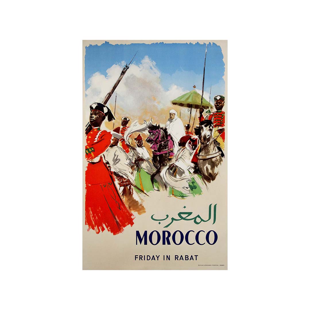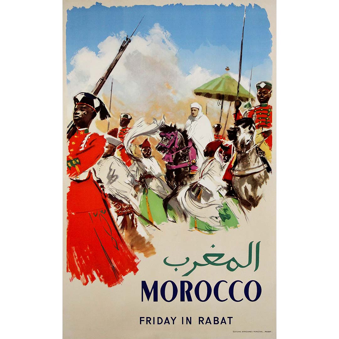 Cette affiche de voyage captivante d'Albert Brenet, datant des années 1950, offre une représentation saisissante du vendredi à Rabat, capitale du Maroc, sous le règne du roi Mohammed V. Illustrateur de voyage parmi les plus célèbres de France, Brenet capture avec brio l'énergie et l'élégance d'une procession royale.