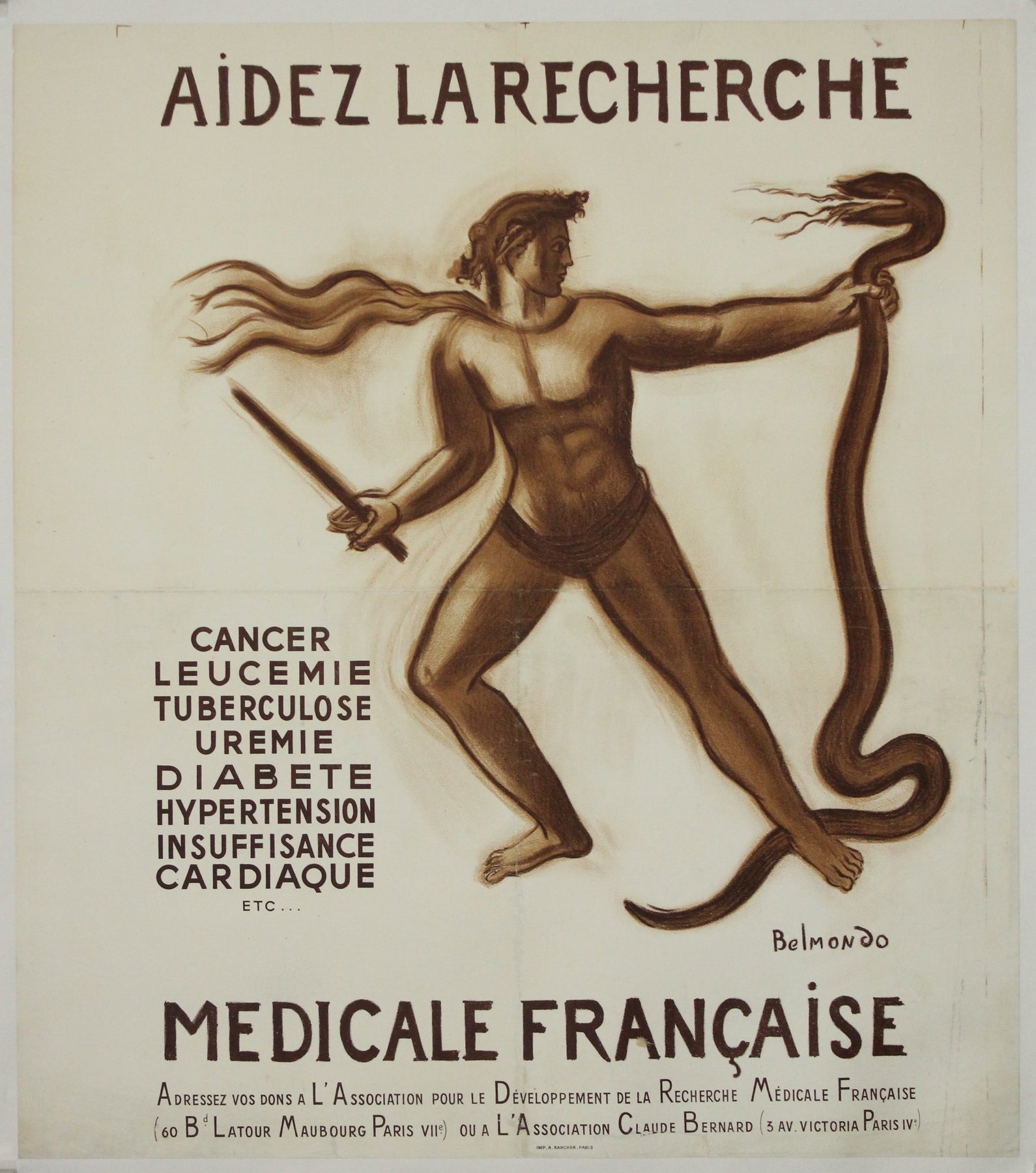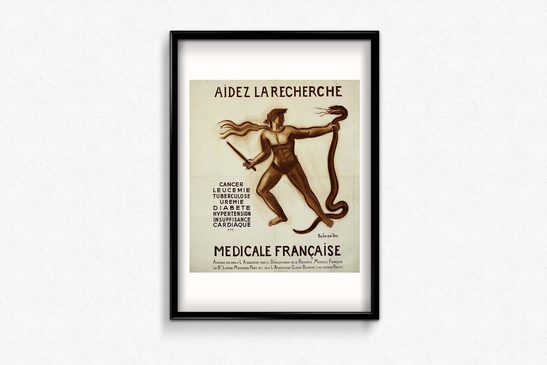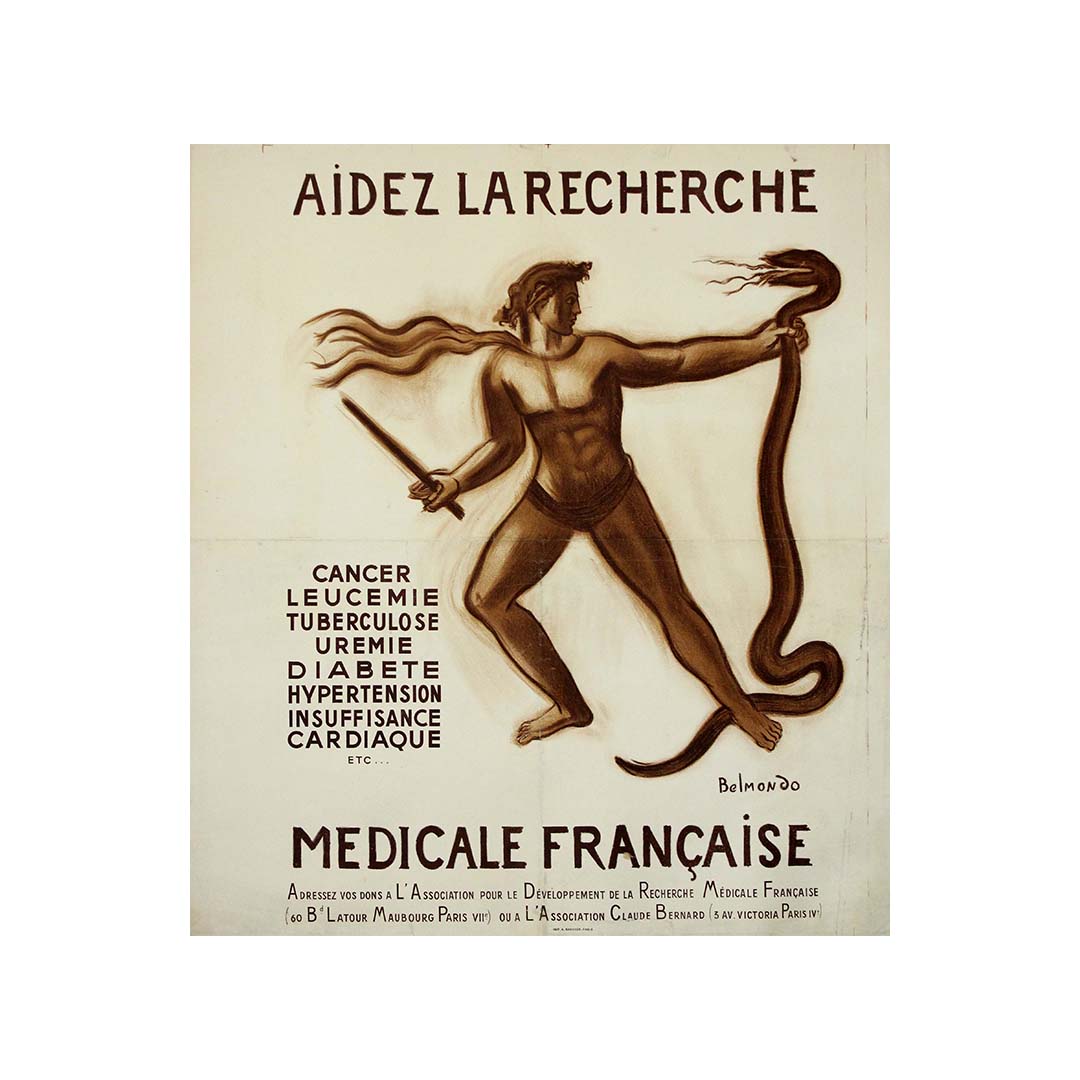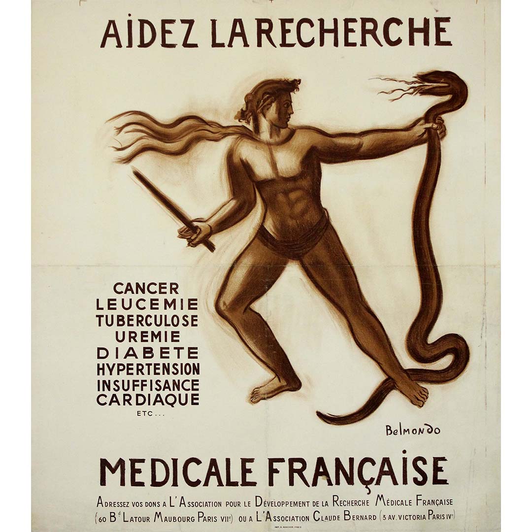 L'affiche originale de Paul Belmondo, datant d'environ 1950 et intitulée « Aidez la recherche médicale française », est une œuvre poignante et visuellement saisissante, emblématique du design du milieu du XXe siècle. Créée dans le cadre d'une campagne de sensibilisation et de collecte de fonds pour la recherche médicale en France, elle met particulièrement en lumière la lutte contre les maladies graves telles que le cancer, la leucémie, la tuberculose et le diabète – autant de problèmes de santé majeurs de l'époque.