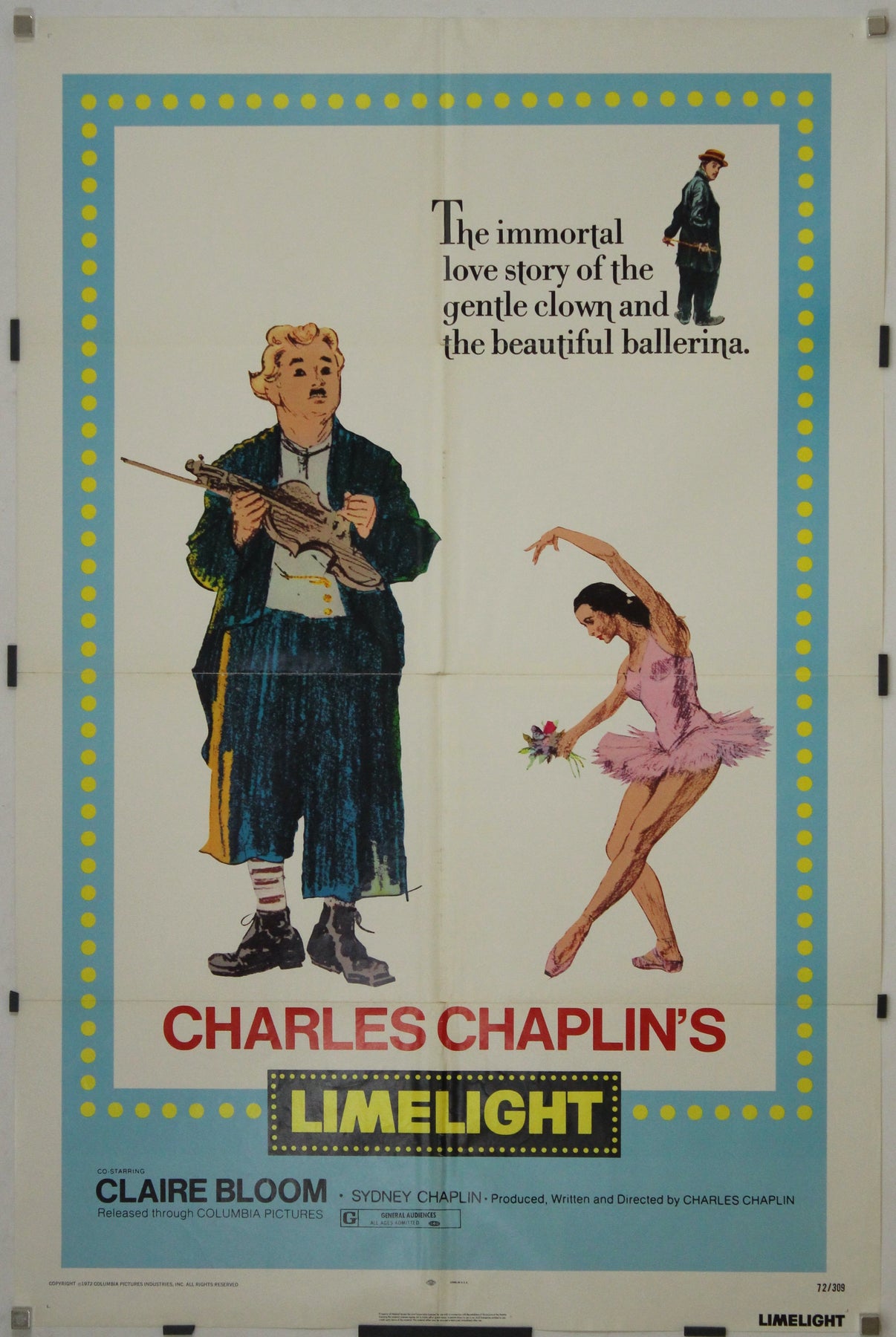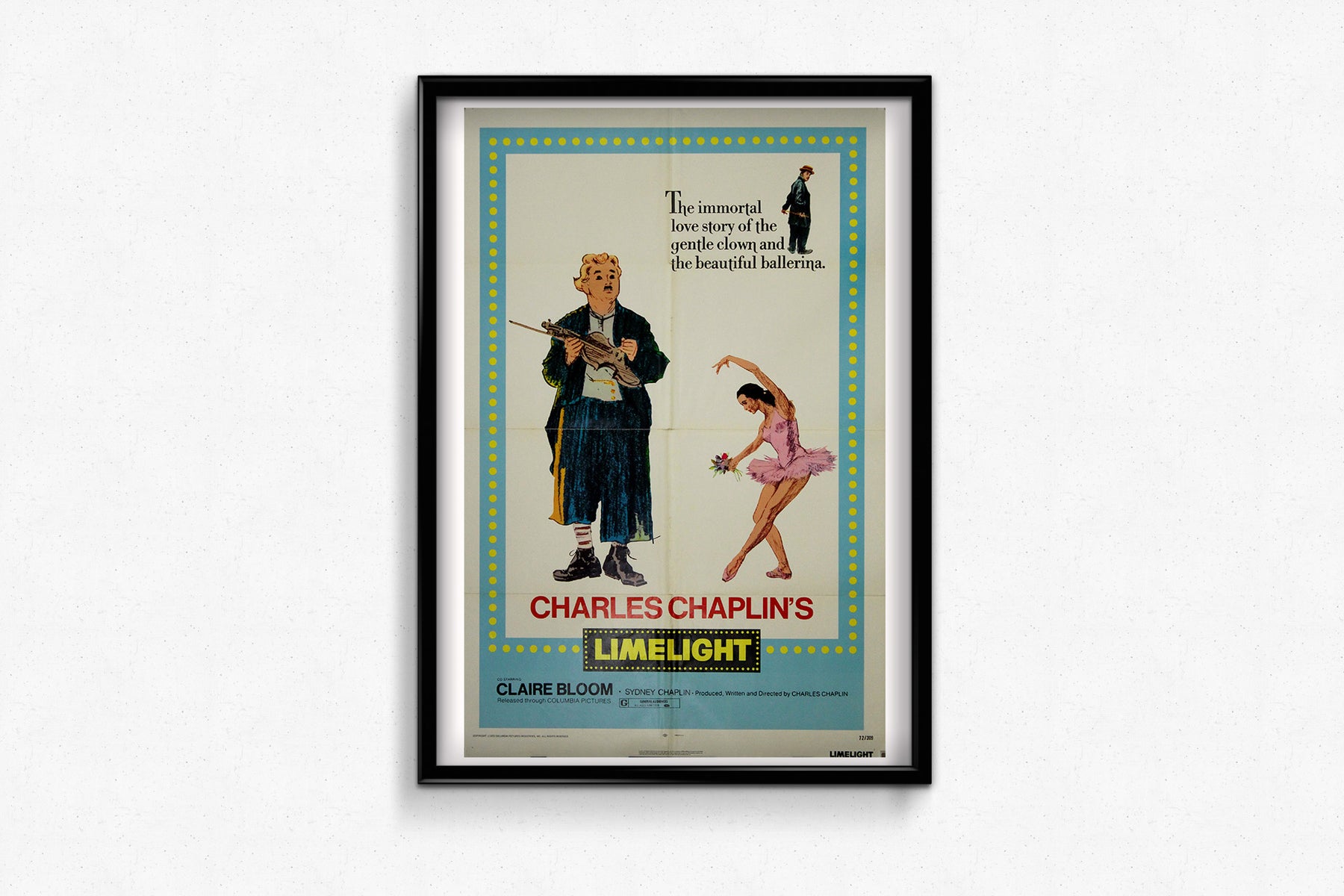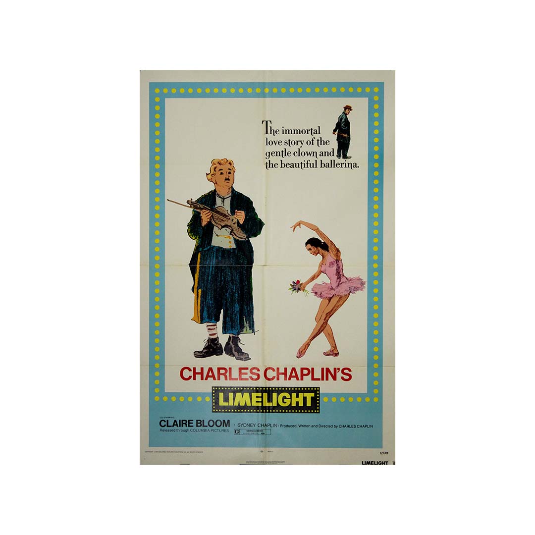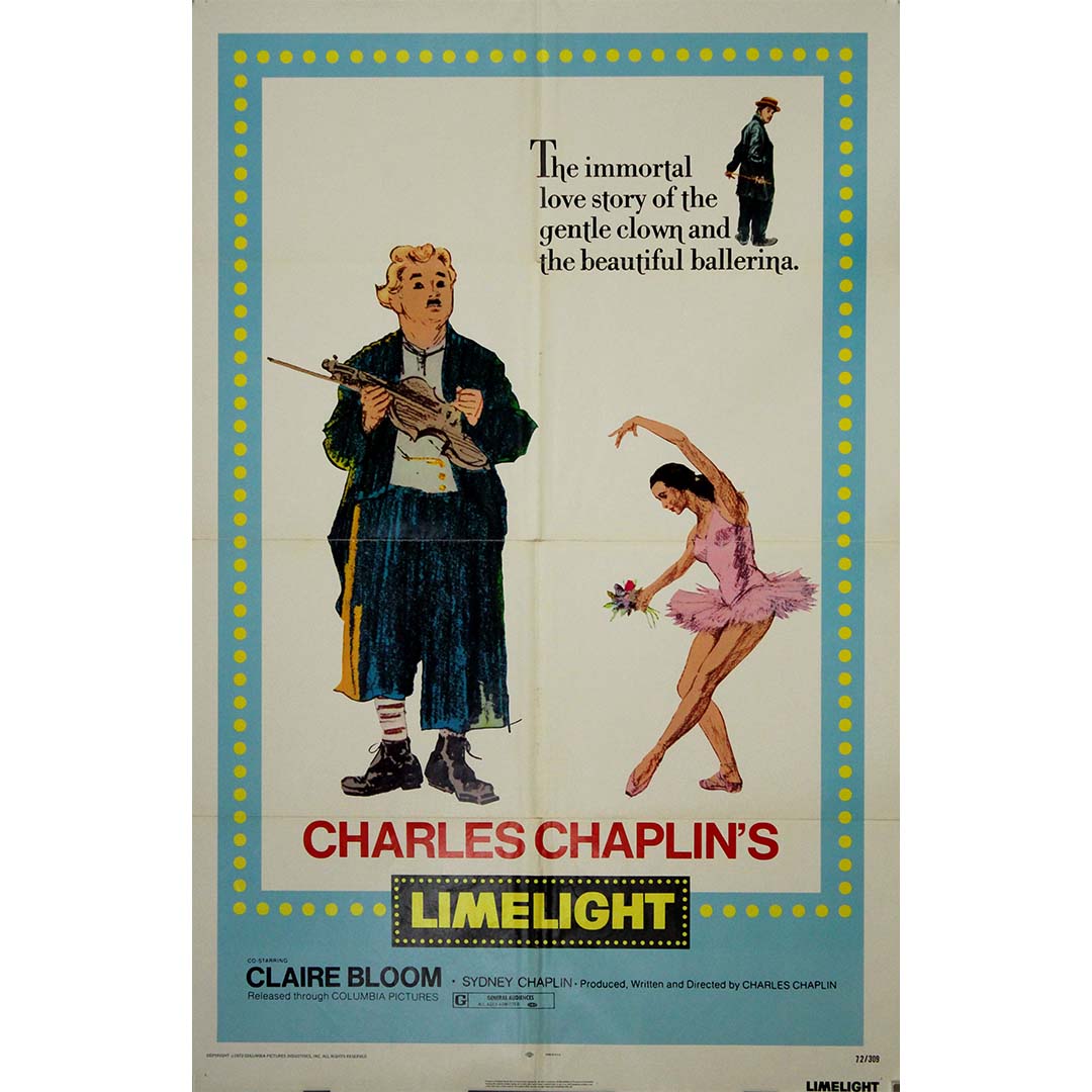 Cette affiche américaine originale de 1972, au format « une feuille », a été éditée pour la ressortie du poignant et profondément personnel chef-d'œuvre de Charlie Chaplin, <i>Les Feux de la rampe </i> (1952). Encadrée par des projecteurs jaunes fantaisistes évoquant les lumières de scène d'une époque révolue, l'affiche présente une illustration dessinée à la main de Chaplin dans le rôle de Calvero – le clown de vaudeville déchu – aux côtés d'une gracieuse ballerine en pleine pose, un clin d'œil au cœur émotionnel du film.