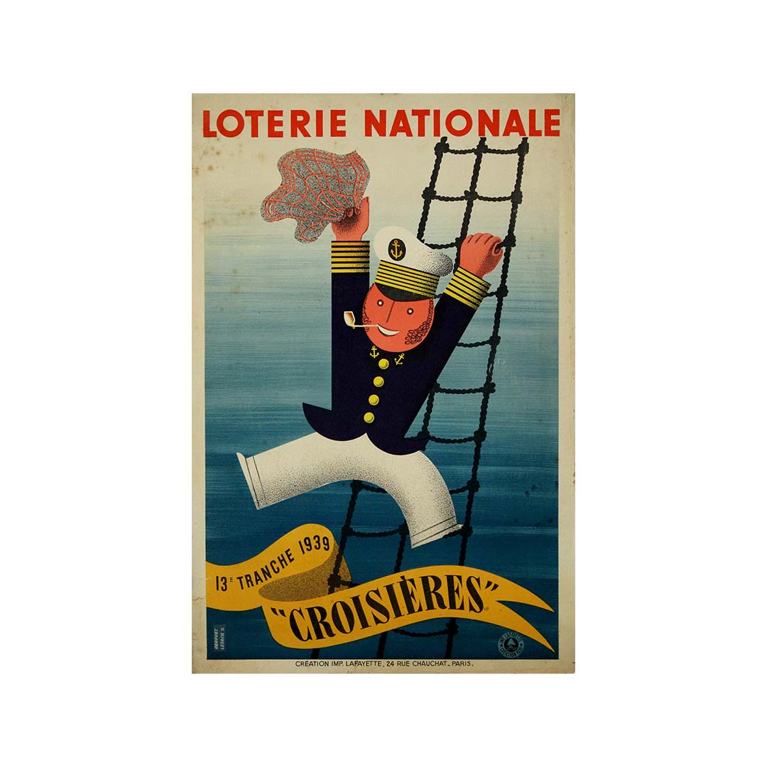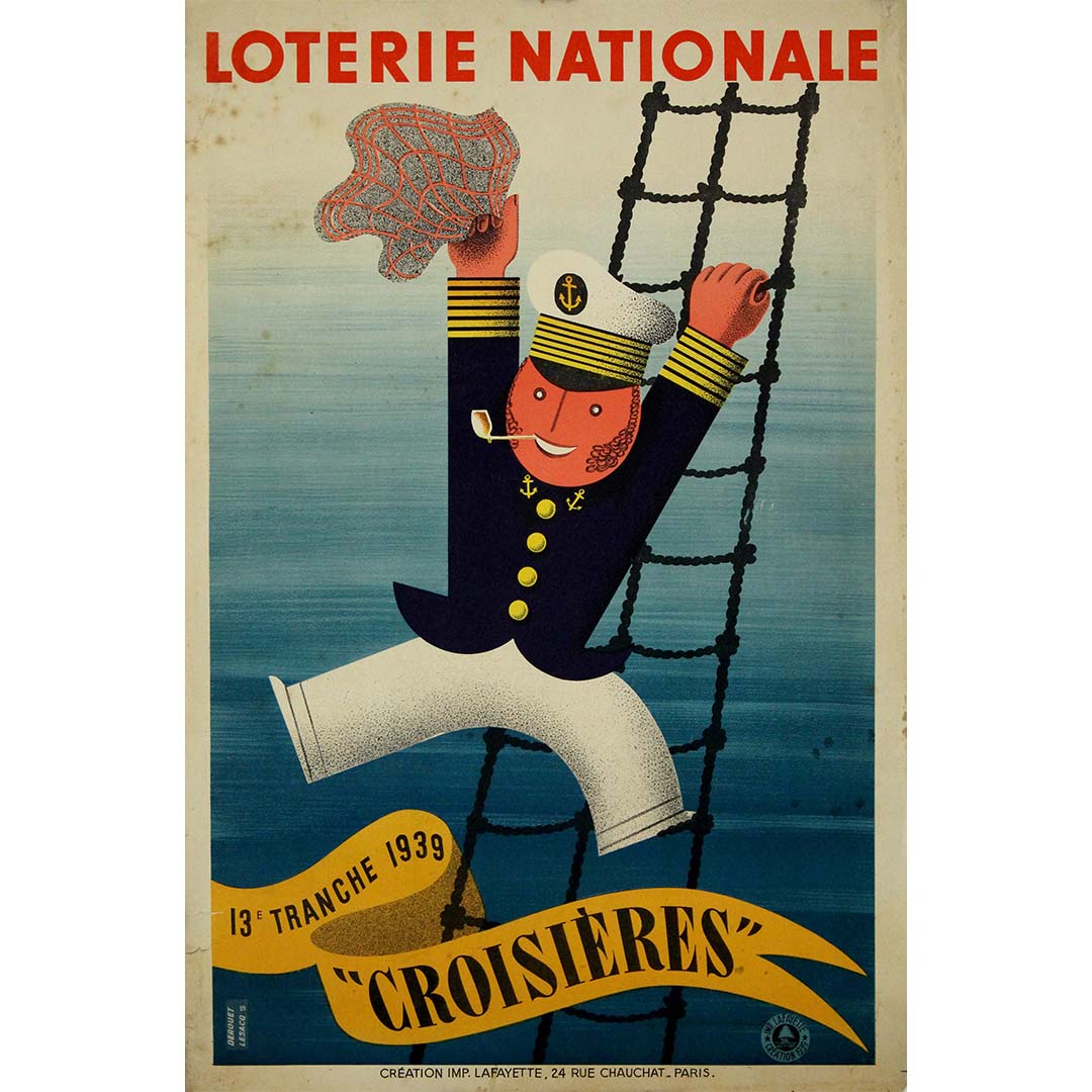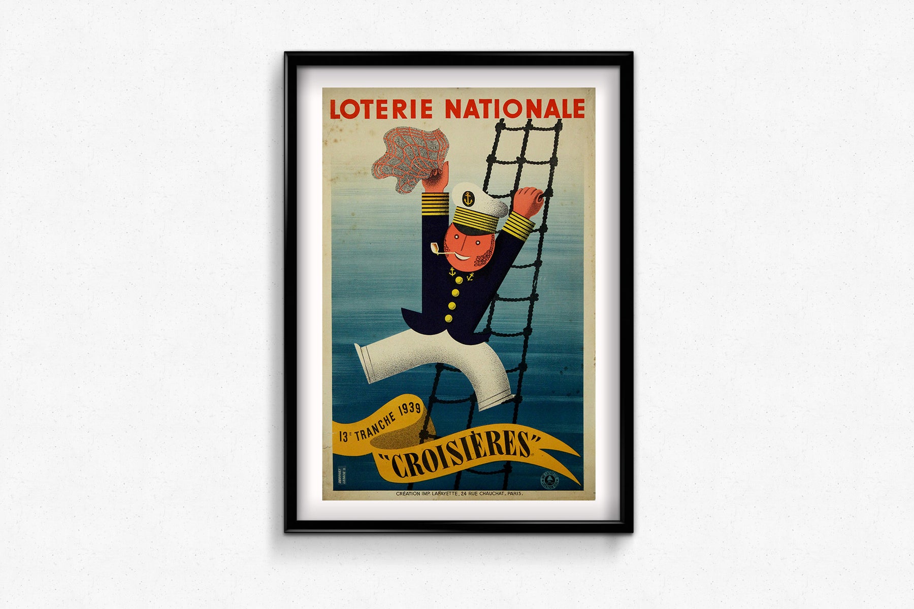 Émise en 1939, à la veille des bouleversements mondiaux, l’affiche « Croisières » de la Loterie Nationale capture un bref instant d’optimisme dans la France d’avant-guerre. Conçue par le duo Derouet & Lesacq, cette œuvre s’inscrit dans une longue tradition où la Loterie Nationale utilisait des thèmes évocateurs pour susciter des rêves de transformation et de chance.