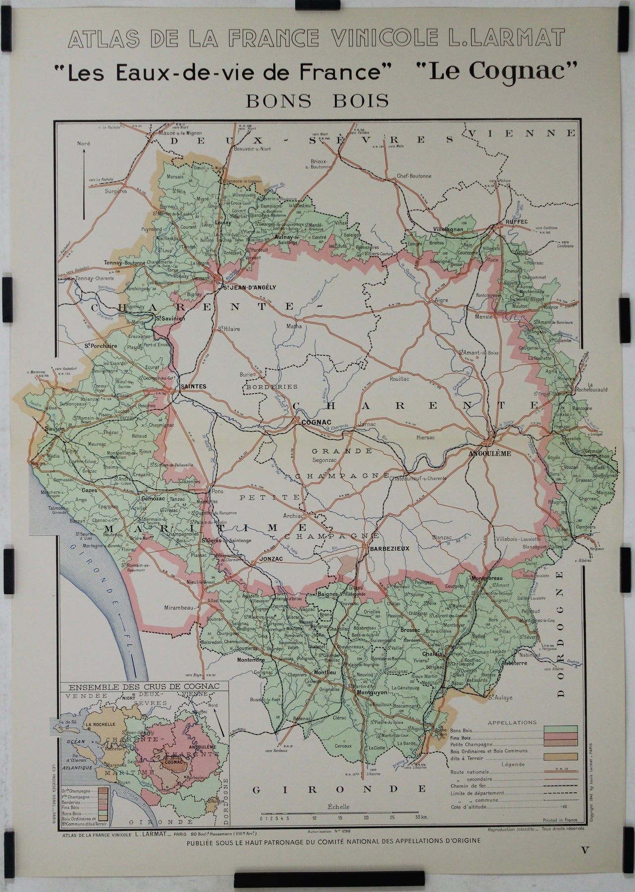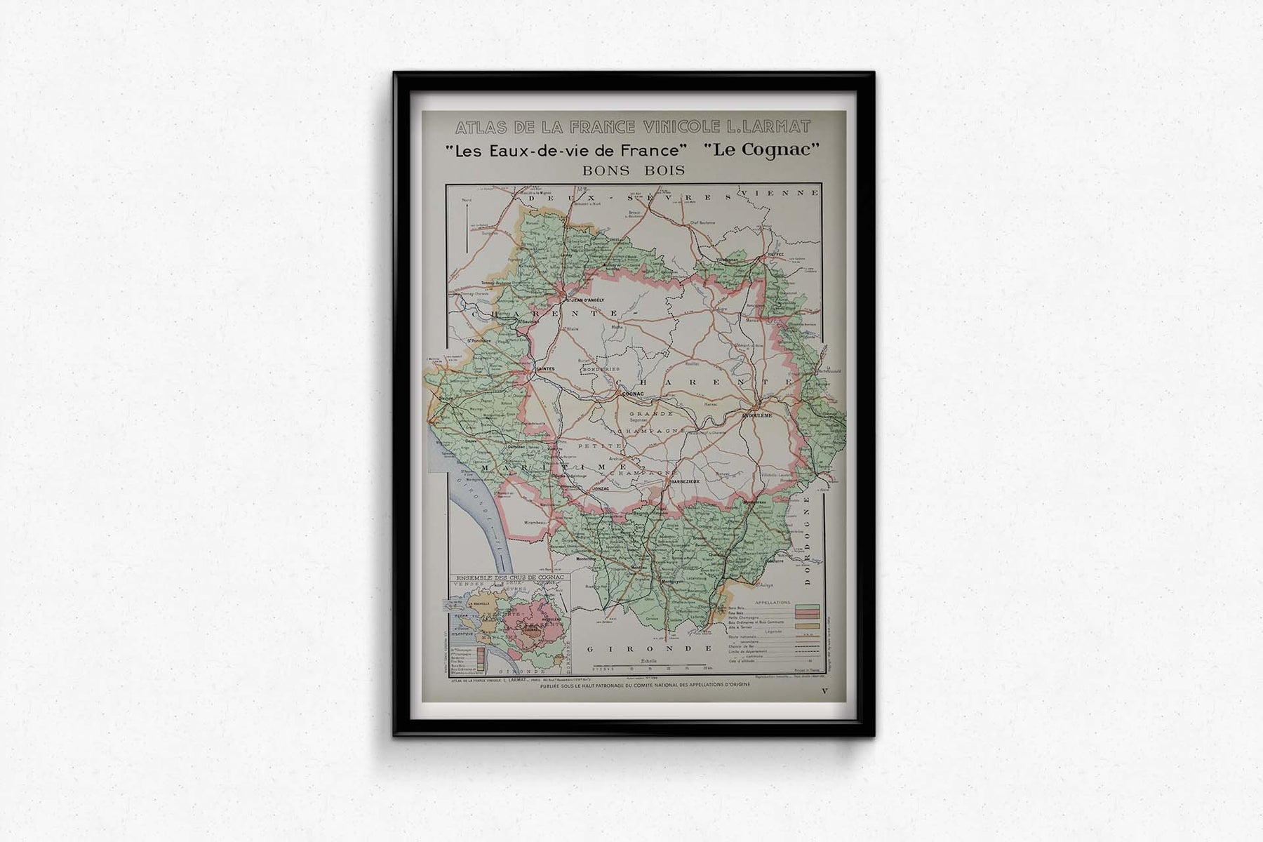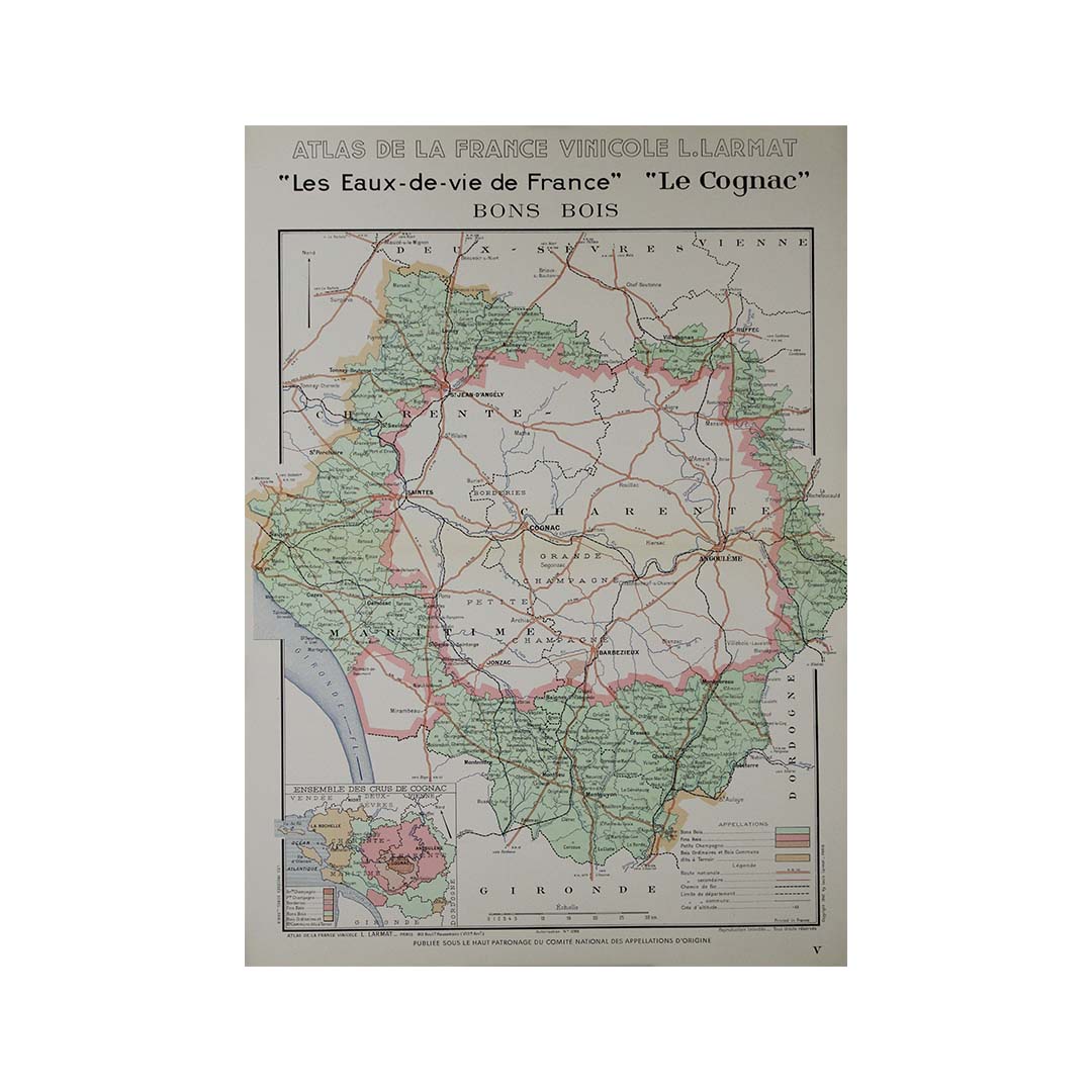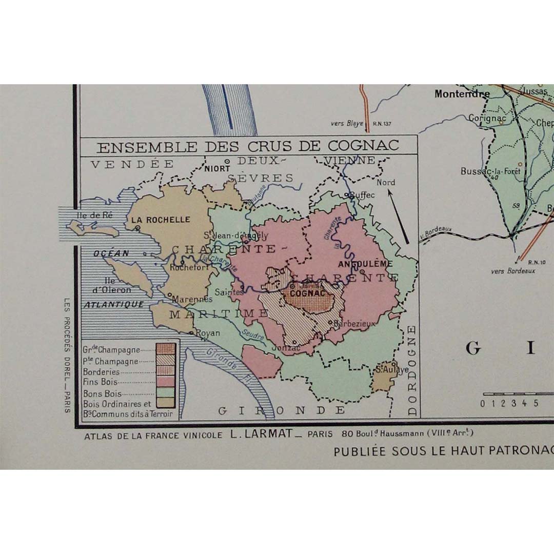 Dans le contexte de l'après-guerre, en 1947, date de création de cette carte, l'accent était mis sur le rétablissement de la position dominante de la France sur le marché mondial des vins et spiritueux. Le cognac, fort de sa longue histoire et de son prestige international, joua un rôle clé dans ce renouveau. Les cartes de l'Atlas de la France Vinicole de Larmat contribuèrent à promouvoir la singularité des régions viticoles françaises, en mettant en lumière les facteurs géographiques et environnementaux qui contribuent à l'excellence de la production viticole et spiritueuse du pays. La carte des Bons Bois , par la précision avec laquelle elle décrit les spécificités de la région, témoigne de cette volonté plus large de valoriser la qualité et la diversité des terroirs français.