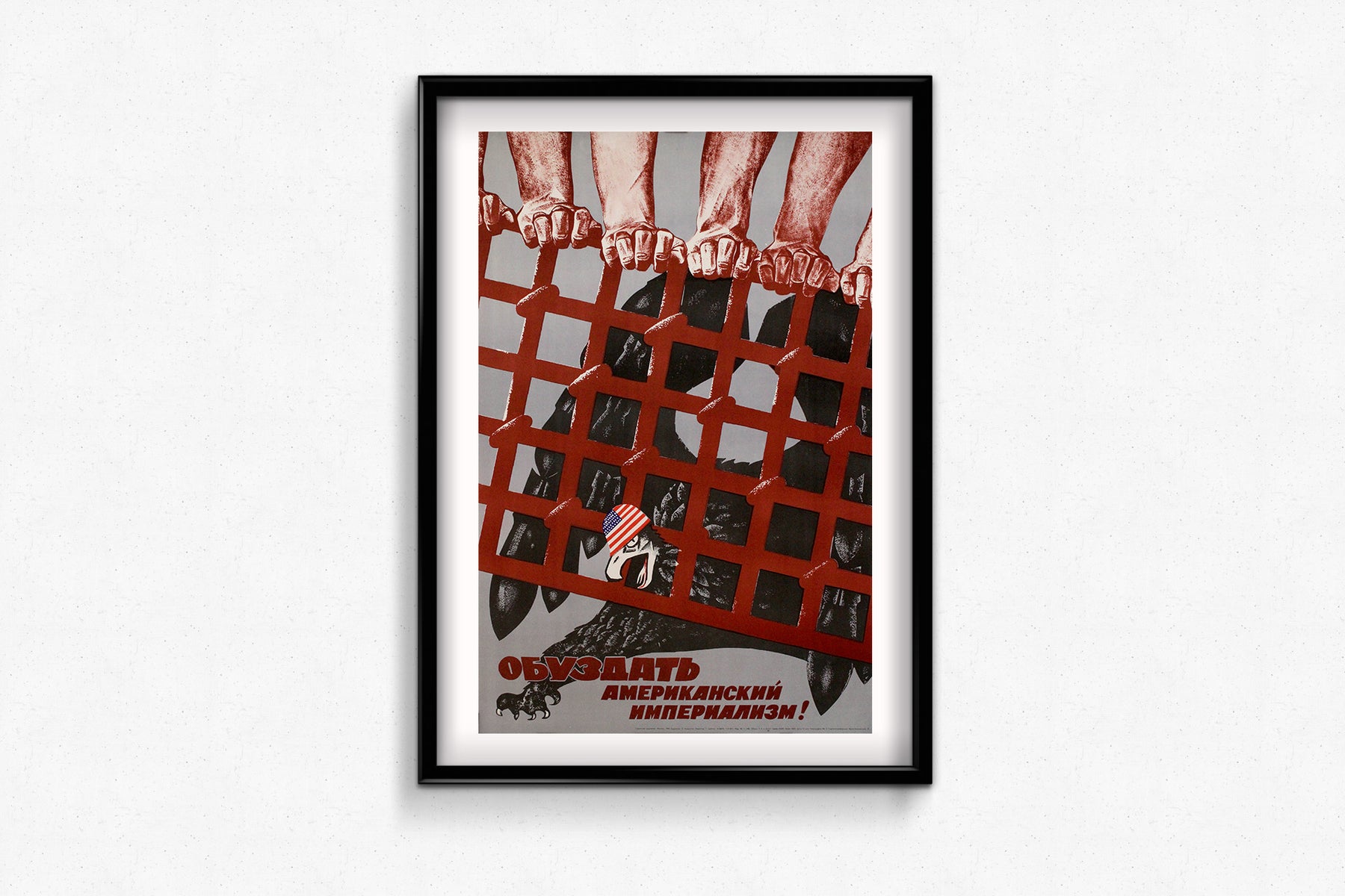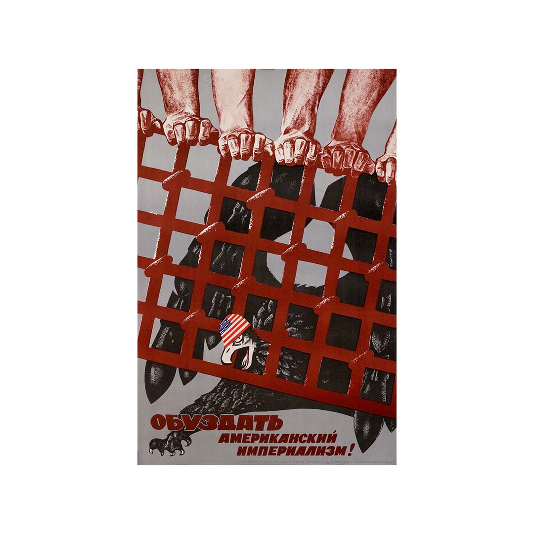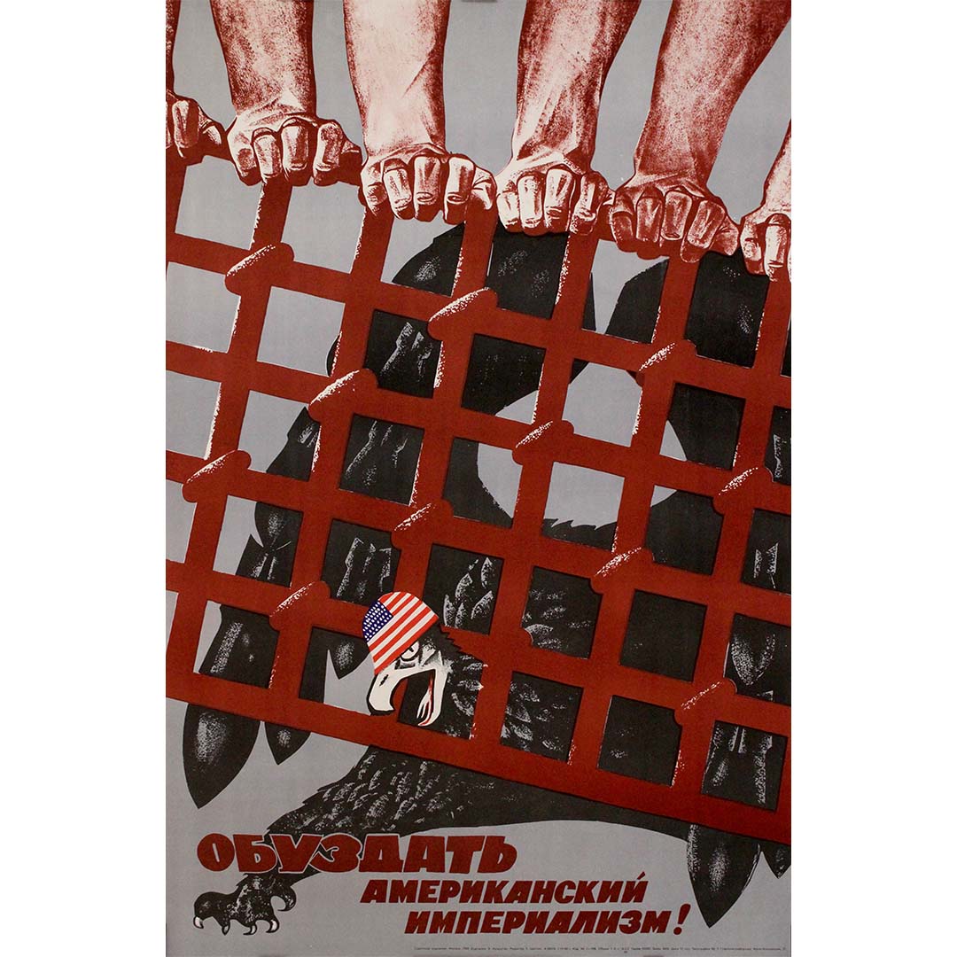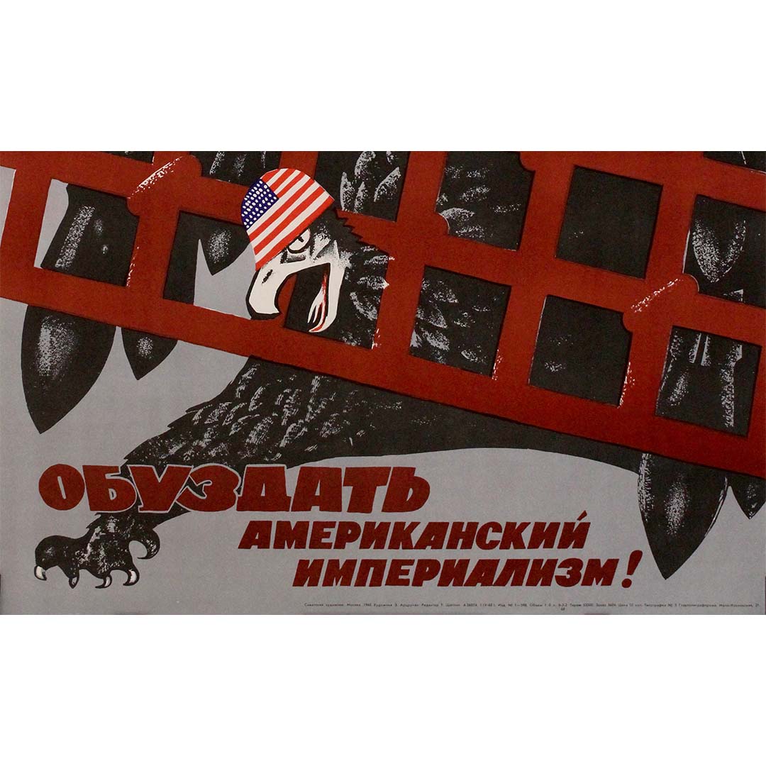 Créée en 1968 par le graphiste soviétique E. Artsrunyan, cette affiche de propagande audacieuse est un témoignage visuel saisissant de la Guerre froide. Intitulée « À bas l'impérialisme américain ! » (en russe : « Обуздать американский империализм ! »), l'œuvre incarne les intenses tensions géopolitiques entre les États-Unis et l'Union soviétique au plus fort de la confrontation idéologique.