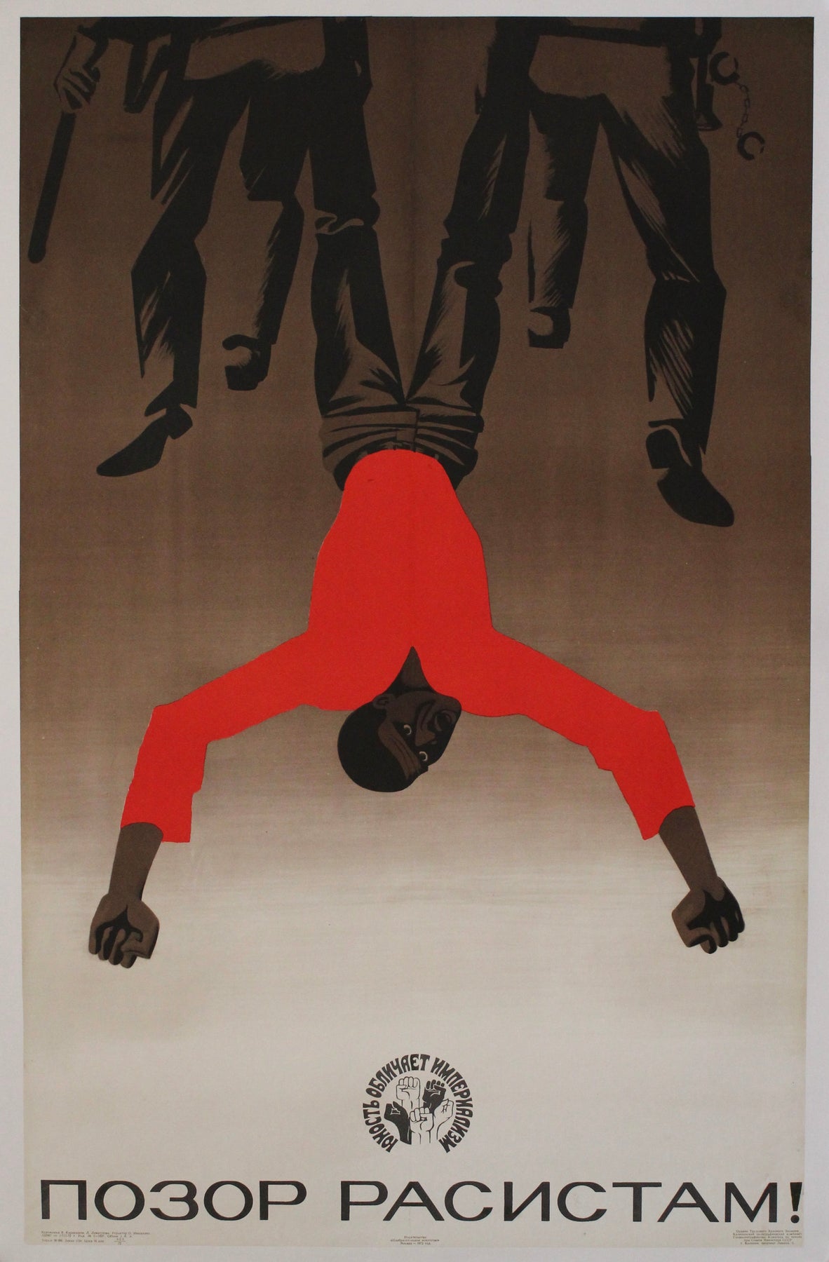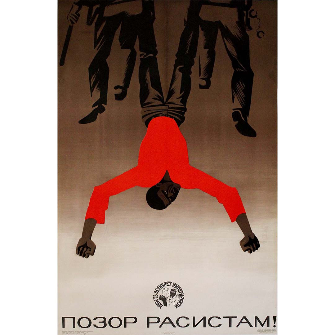 Le texte en gras en bas, « Позор Расистам! » ( « Honte aux racistes ! » ), condamne avec force et sans ambiguïté l'oppression raciale. L'emblème du Comité soviétique pour la paix y figure en évidence, soulignant l'engagement de l'URSS envers les mouvements anticoloniaux et antiracistes internationaux, un élément clé de la compétition idéologique soviétique avec les États-Unis durant la Guerre froide.