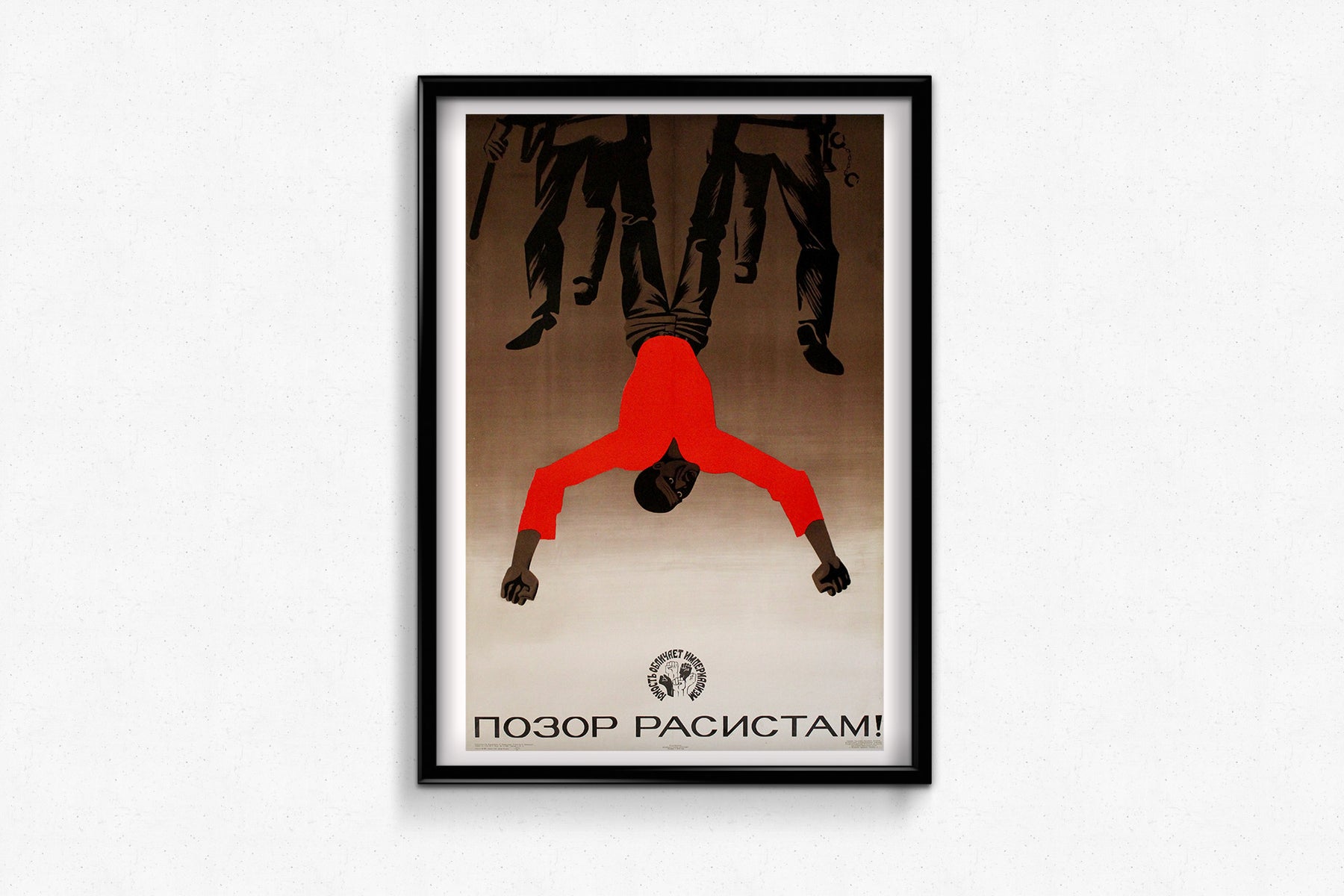 L'affiche soviétique de 1972, réalisée par V. Karakashev et intitulée « Honte aux racistes » (Позор Расистам) , est un exemple frappant de propagande de l'époque de la Guerre froide, véhiculant un message antiraciste audacieux. Créée en Union soviétique, cette affiche témoigne de la volonté de l'URSS de se présenter comme un défenseur de la solidarité internationale et un opposant à l'injustice raciale, notamment dans le contexte des luttes pour les droits civiques et des violences raciales en Occident.