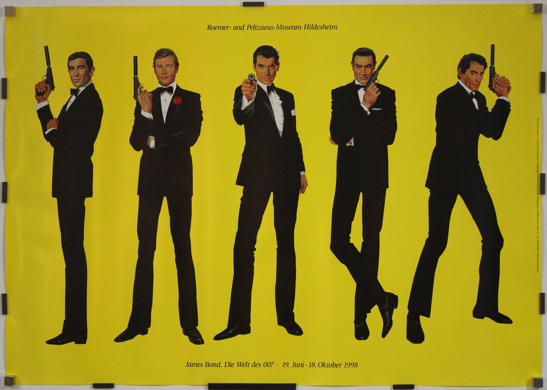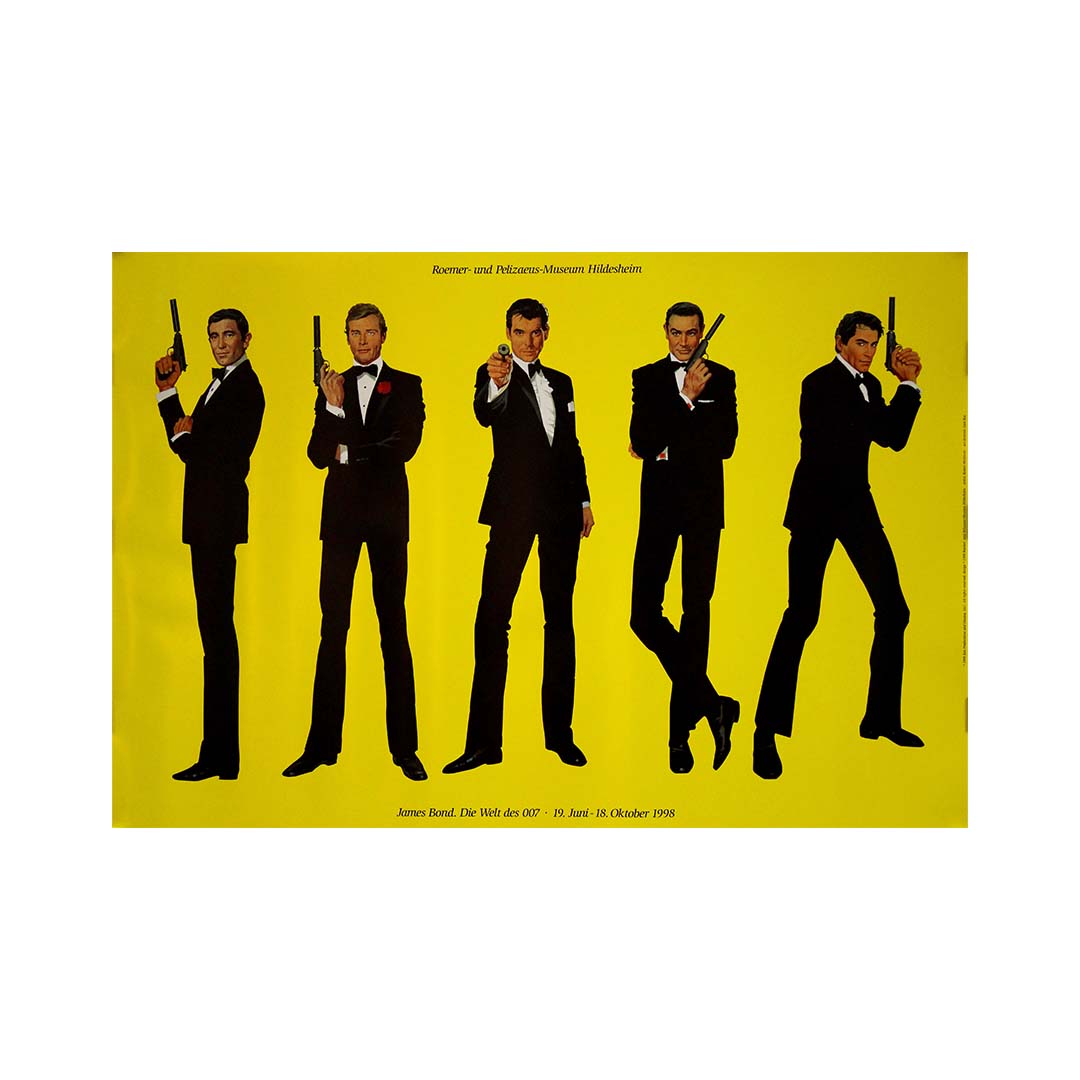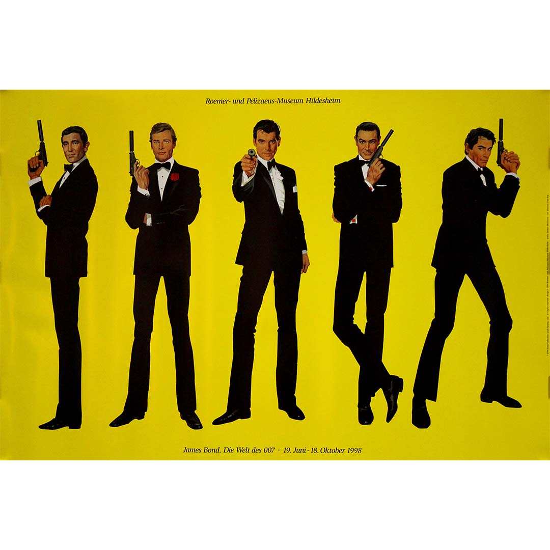 Cette affiche, créée pour l'exposition de 1998 intitulée « James Bond : Die Welt des 007 » (traduit par « Le Monde de 007 »), présentée au musée Roemer-und Pelizaeus de Hildesheim, en Allemagne, retrace l'évolution de l'espion emblématique du cinéma, James Bond. Elle illustre l'attrait intemporel du personnage et souligne son impact culturel sur plusieurs décennies.