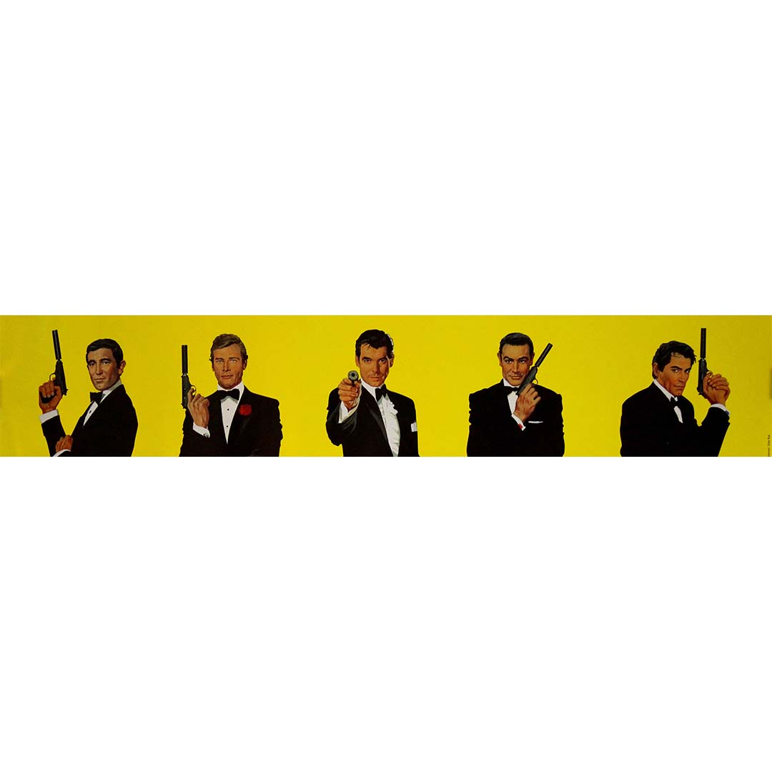 L'affiche, au design audacieux et minimaliste, se distingue par un fond jaune éclatant qui attire immédiatement le regard. Cinq acteurs incarnant James Bond, vêtus de leur smoking emblématique, se détachent en silhouette sur ce fond lumineux, adoptant la pose iconique, arme à la main.