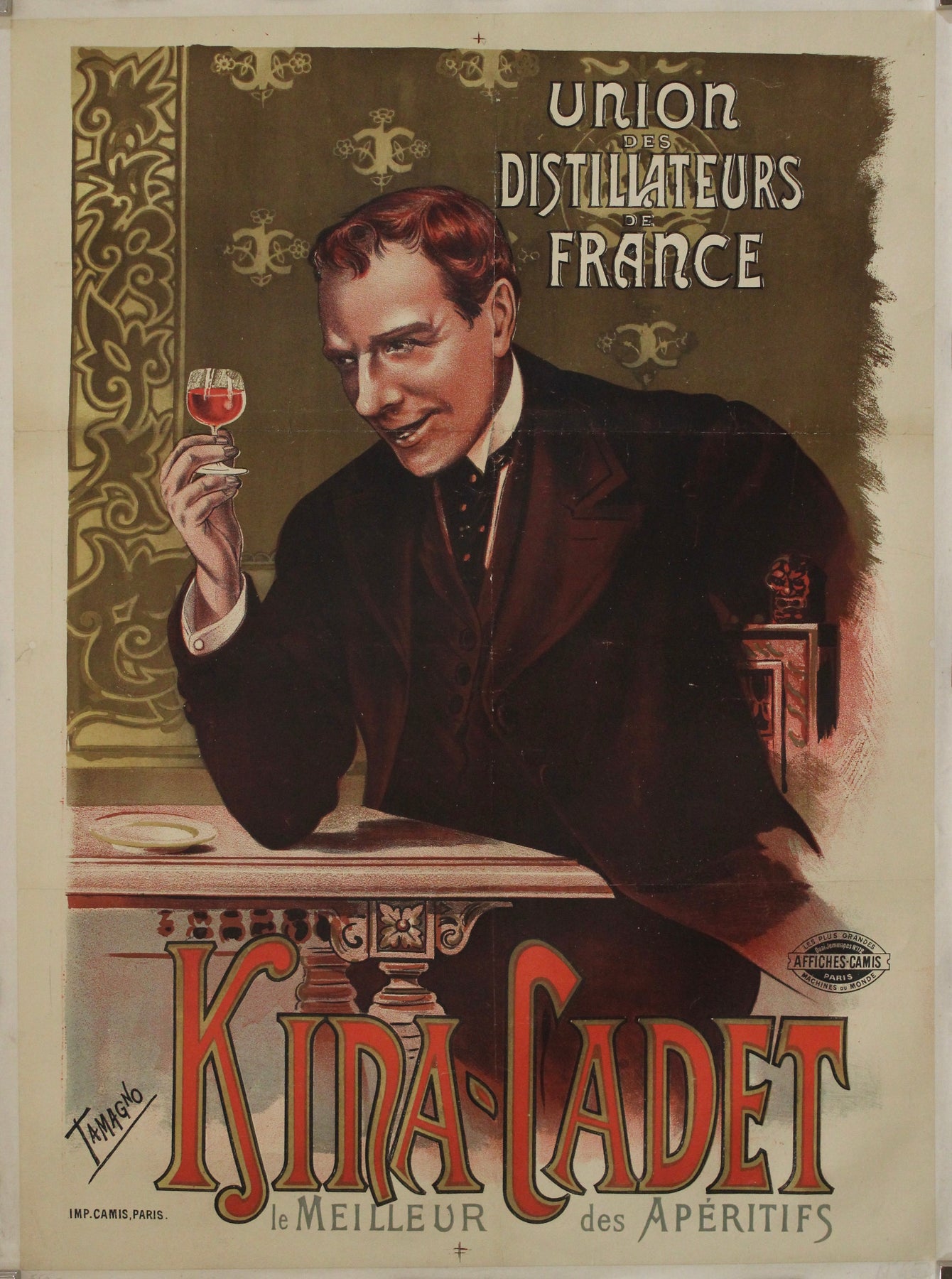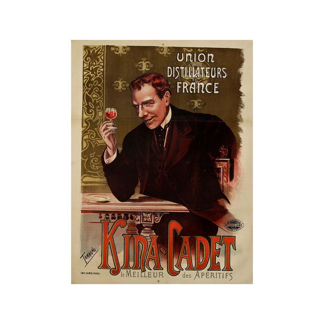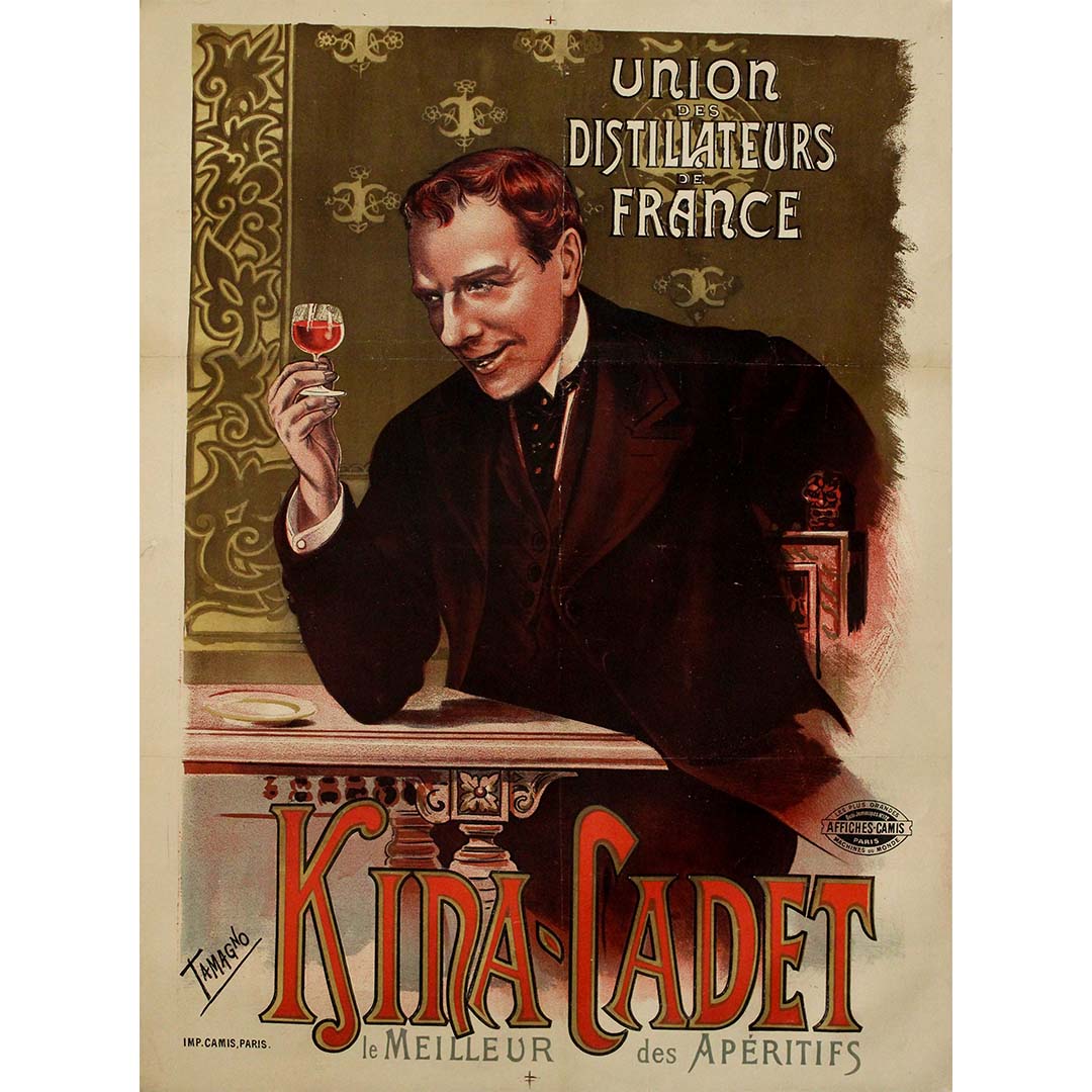 Cette affiche publicitaire originale, rare et très recherchée, datant d'environ 1900, a été créée par le prolifique affichiste italo-français Tamagno pour Kina-Cadet, un apéritif produit par l'Union des Distillateurs de France.