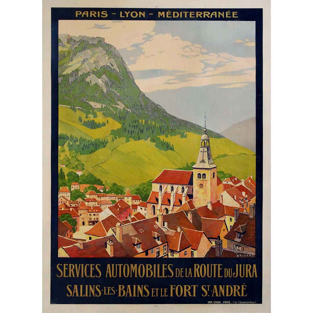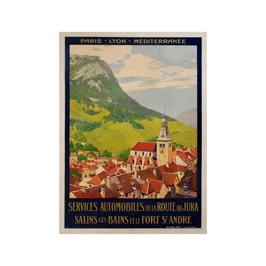 Prix régulier €1.500,00L'affiche originale de 1923, réalisée par Roger Broders pour les Services Automobiles de la route du Jura et faisant la promotion de Salins-les-Bains et du Fort Saint-André, est un exemple remarquable de l'art de l'affiche touristique du début du XXe siècle. Commandée par la compagnie ferroviaire PLM (Paris-Lyon-Méditerranée), cette œuvre reflète à merveille le charme du Jura et témoigne de la maîtrise de Broders en matière de composition, de couleur et de narration visuelle.