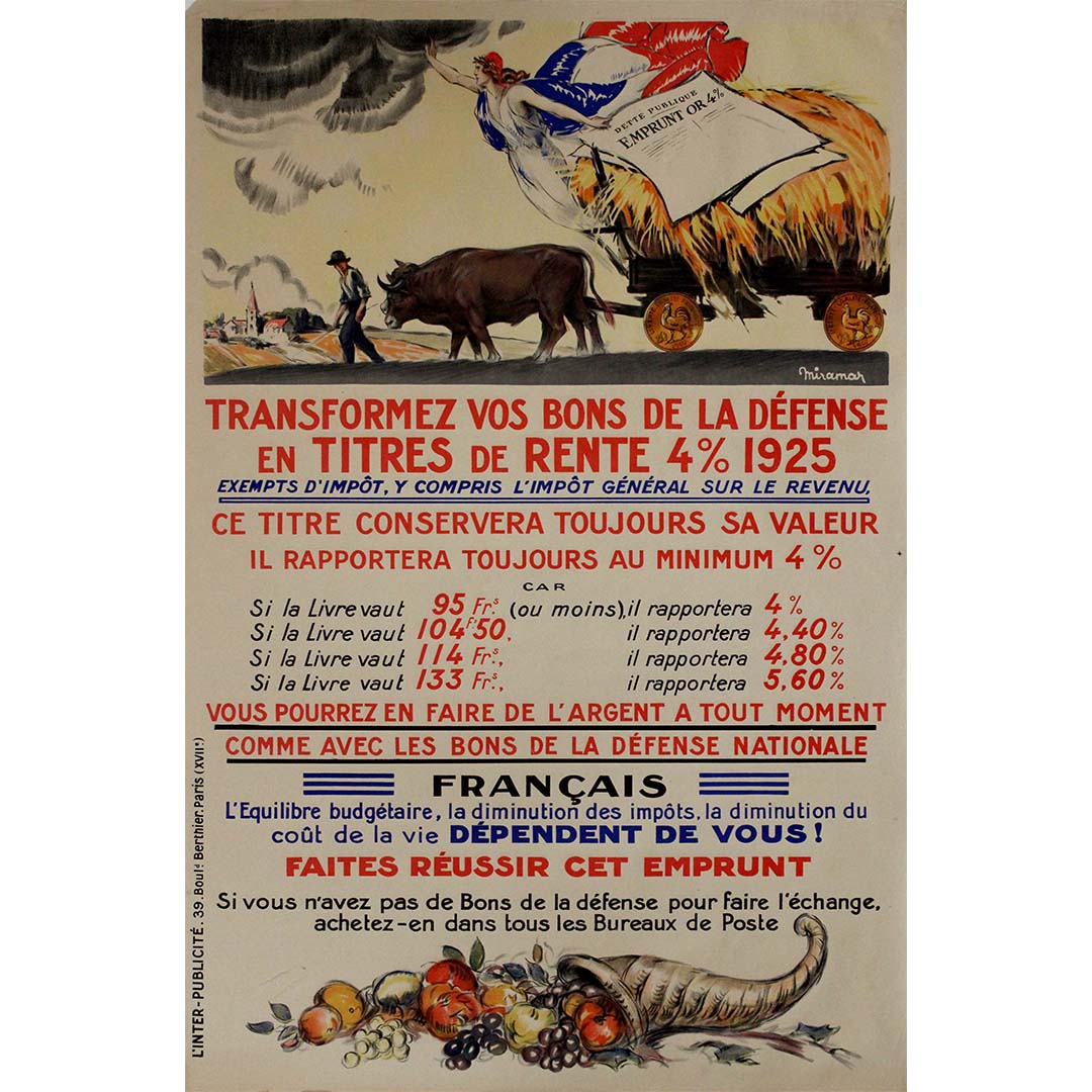Prix régulier €400,00Cette affiche originale de 1925, signée Miramar et intitulée « Transformez vos bons de la défense en titres de rente 4% », est une œuvre de propagande financière marquante de la France de l'après-Première Guerre mondiale. Conçue pour inciter les citoyens à convertir leurs bons de guerre en titres à long terme rémunérés à 4 %, elle illustre le rôle crucial de l'art graphique dans la mobilisation de la population pour le redressement national.