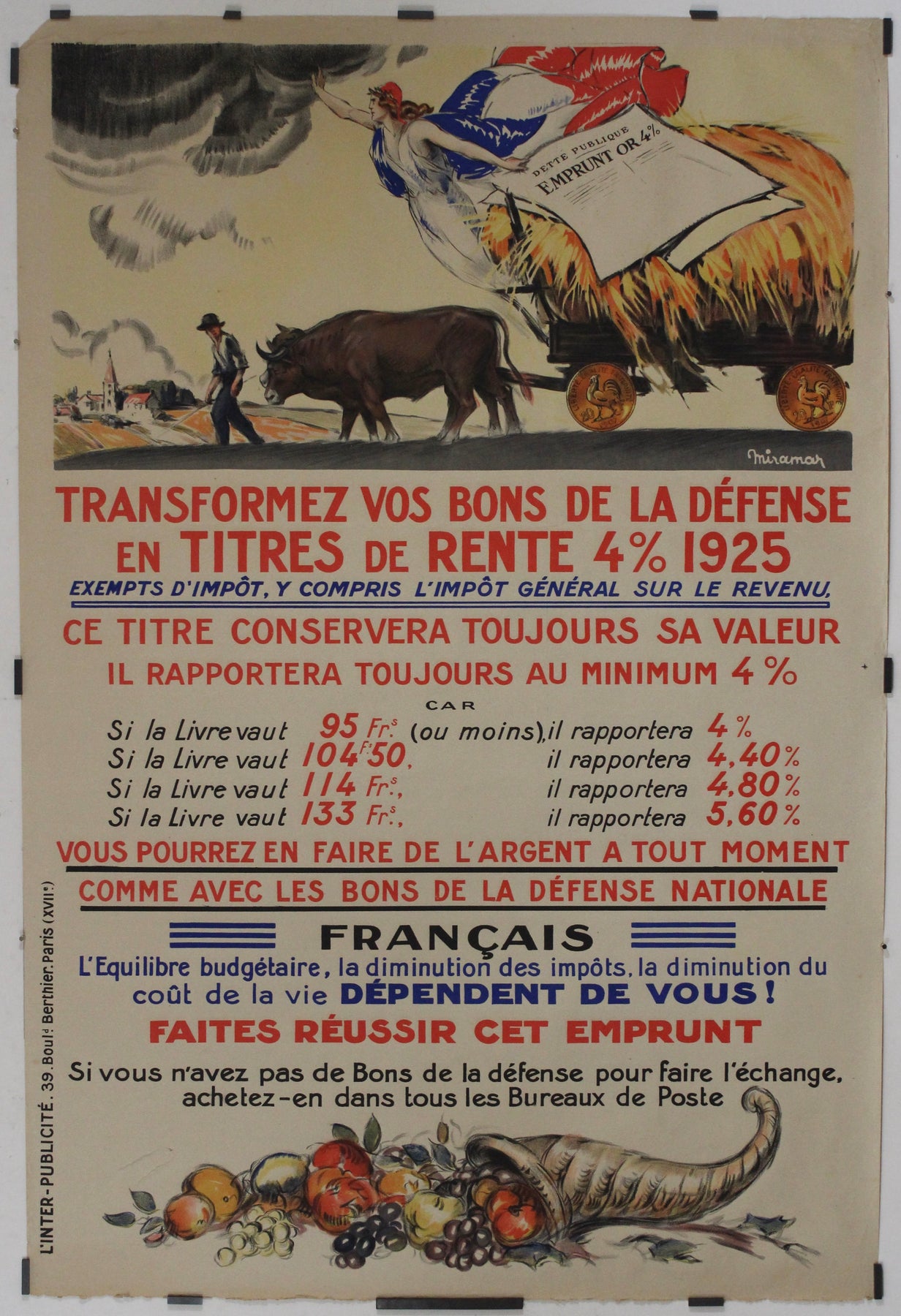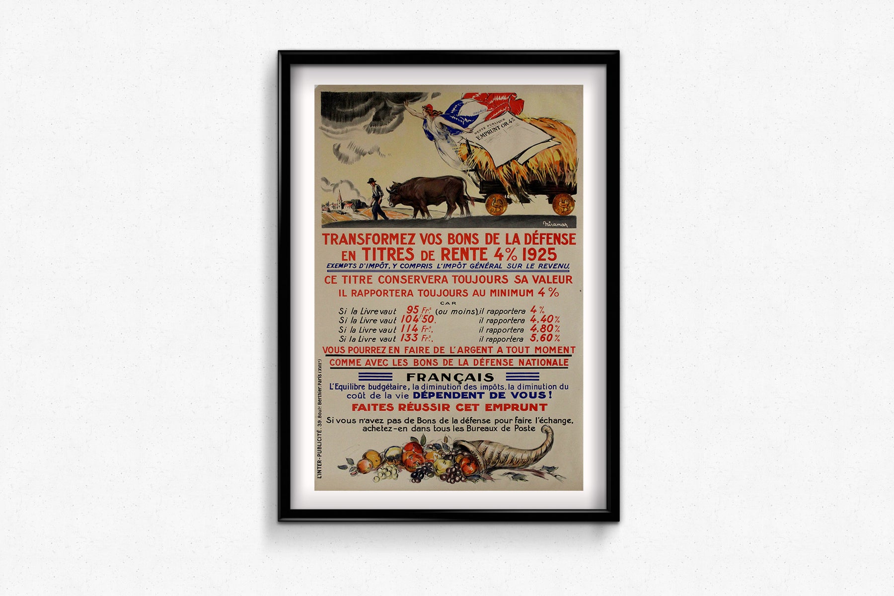 Le subtil mélange de symbolisme patriotique, d'imagerie rurale et de conseils financiers pratiques, opéré par Miramar, fait de cette affiche un témoignage durable de la politique économique de l'entre-deux-guerres. Son importance historique réside dans sa double fonction d'œuvre d'art et d'outil de participation citoyenne, reflétant le lien essentiel entre les citoyens et l'État durant une période charnière de l'histoire de France.