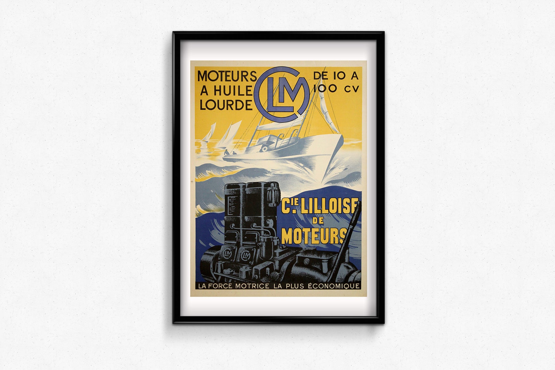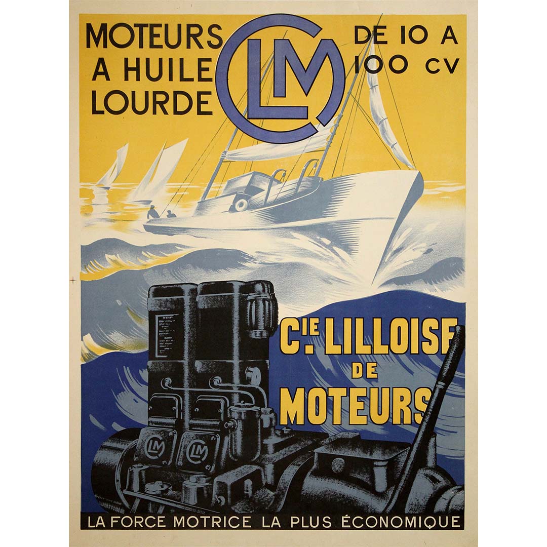 CLM ( Compagnie Lilloise de Moteurs ) était l'un des principaux motoristes français des années 1930, promouvant le diesel comme « la force motrice la plus économique ». Ce slogan, placé en bas de la composition, souligne le positionnement de la marque comme une alternative économique à l'essence.