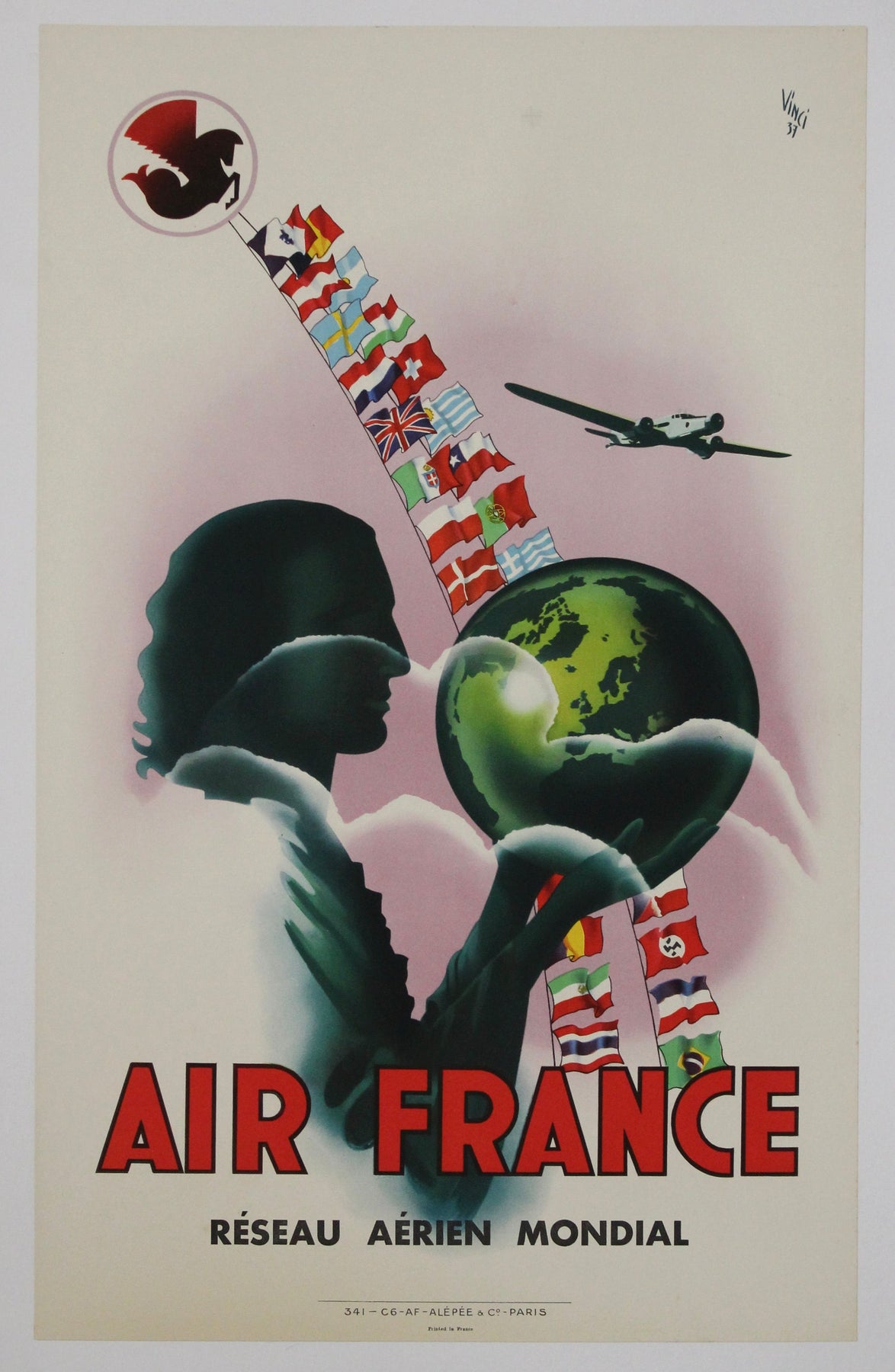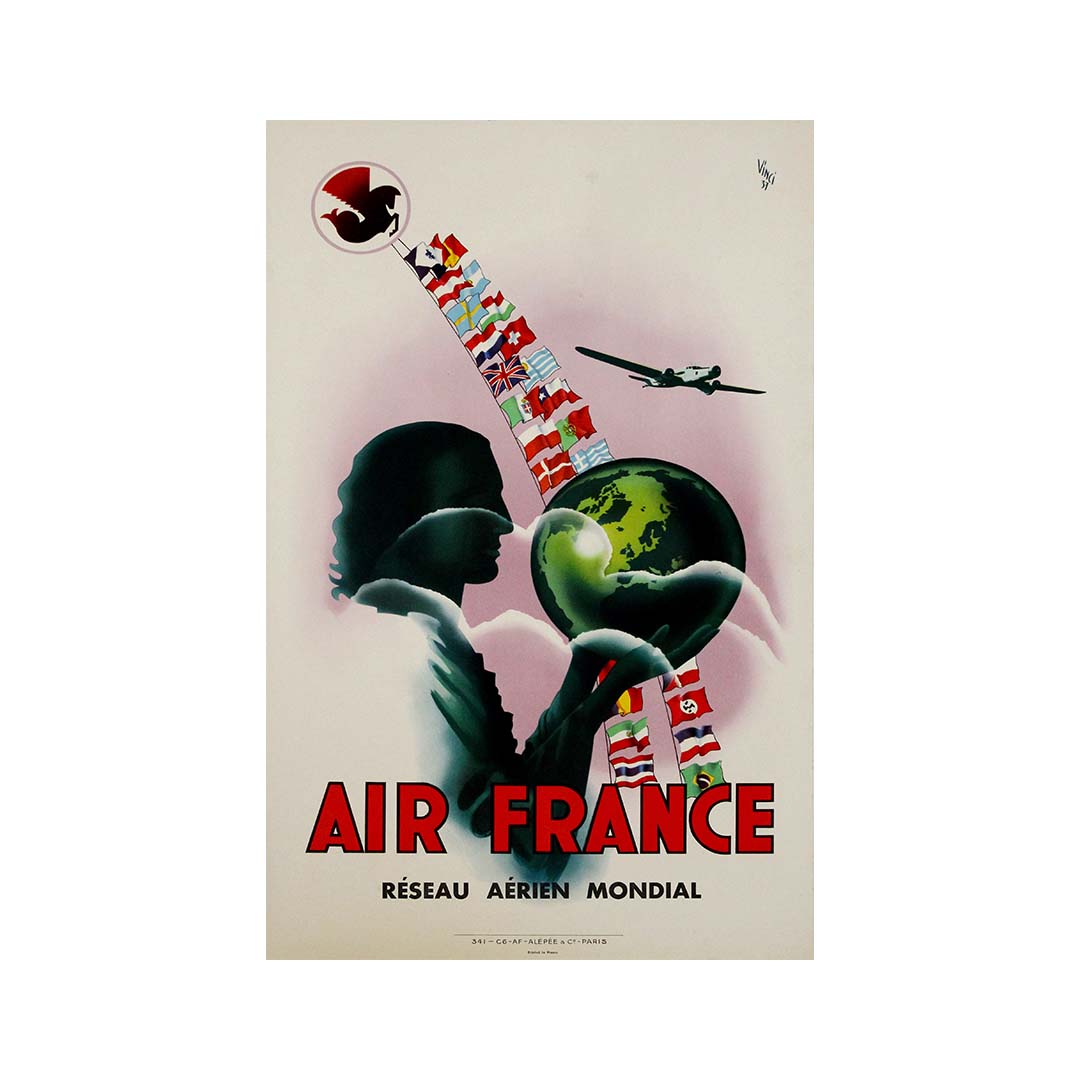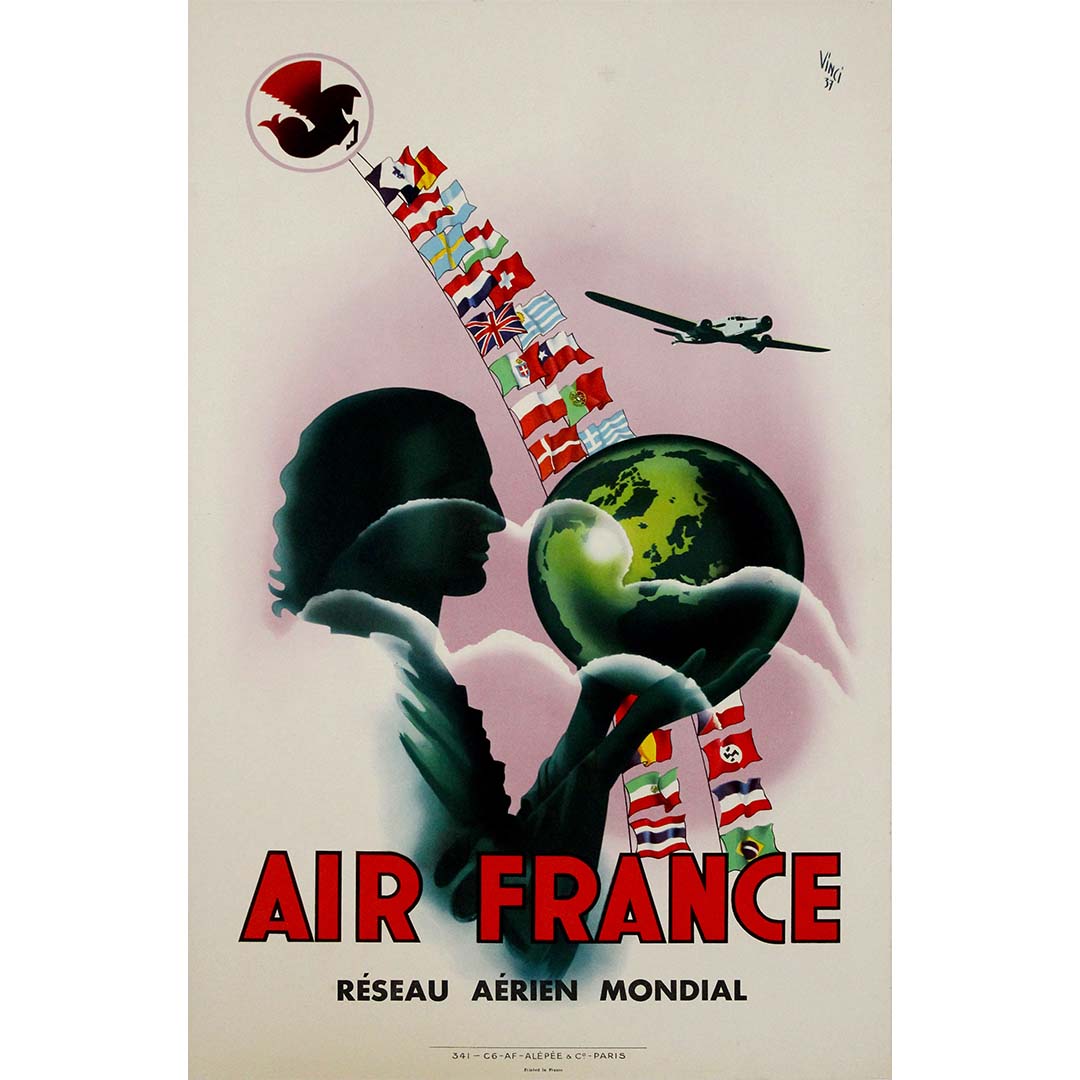 Cette superbe affiche d'Air France de 1937, réalisée par l'artiste Vinci, célèbre le réseau aérien mondial en pleine expansion de la compagnie, à une époque où l'aviation commerciale était encore un symbole de merveille moderne et de progrès international.