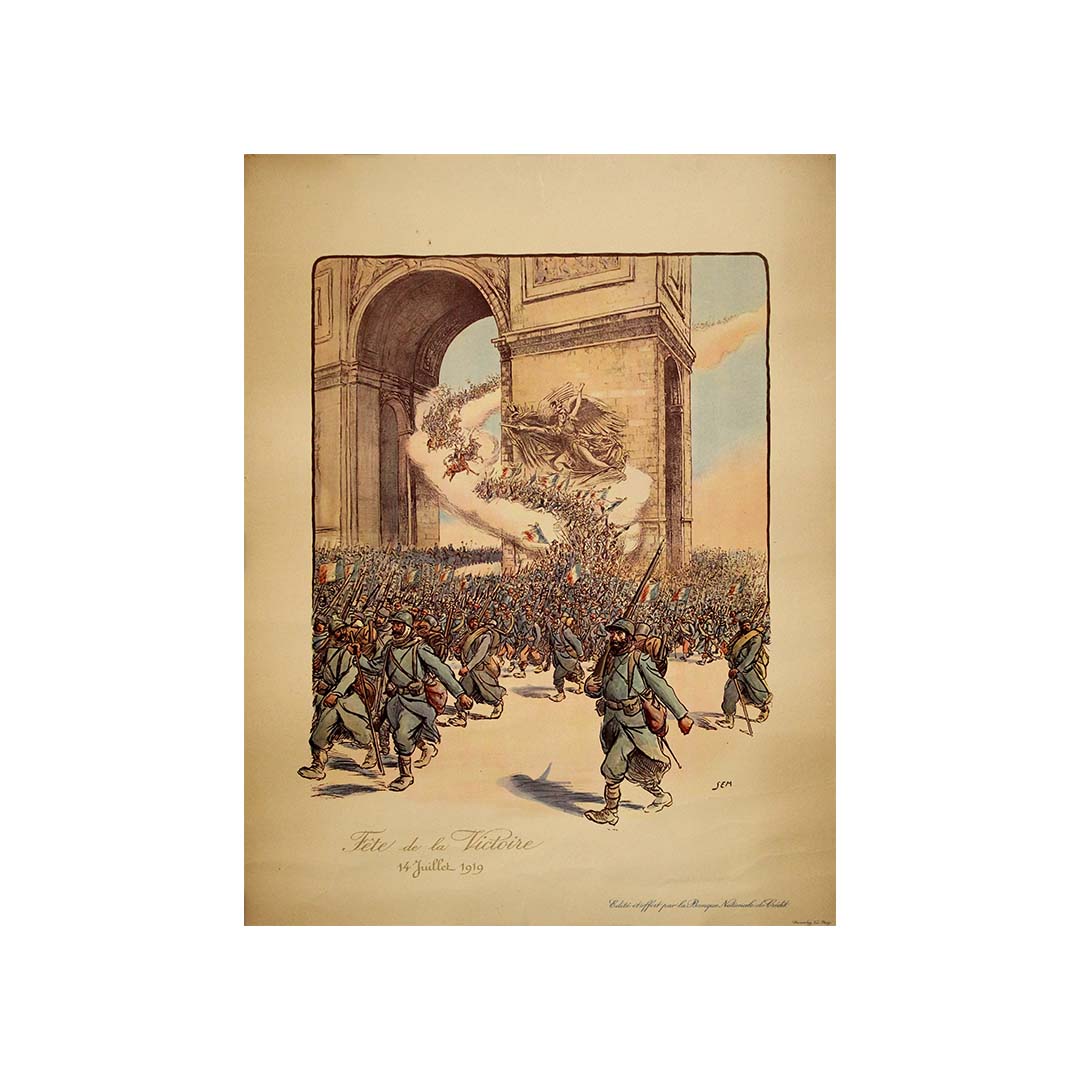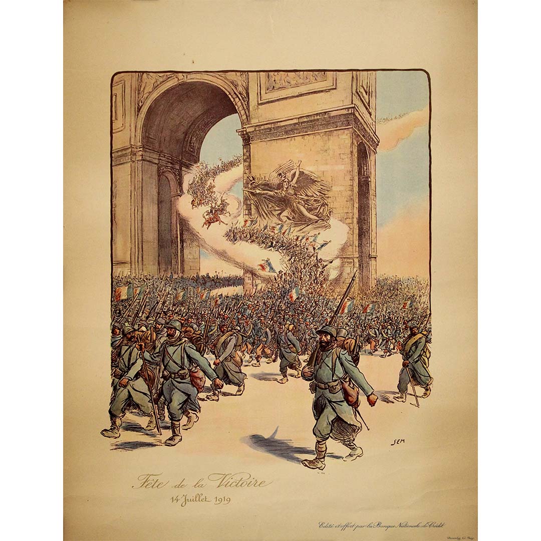 Cette affiche originale saisissante de 1919, signée du célèbre caricaturiste français Sem (Georges Goursat), capture l'esprit d'unité nationale et de liesse dans la France d'après-guerre. Créée pour commémorer le défilé de la Victoire du 14 juillet 1919, elle immortalise l'un des moments les plus émouvants de l'histoire de France : le retour triomphal des soldats français sous l'Arc de Triomphe à Paris après la Première Guerre mondiale.