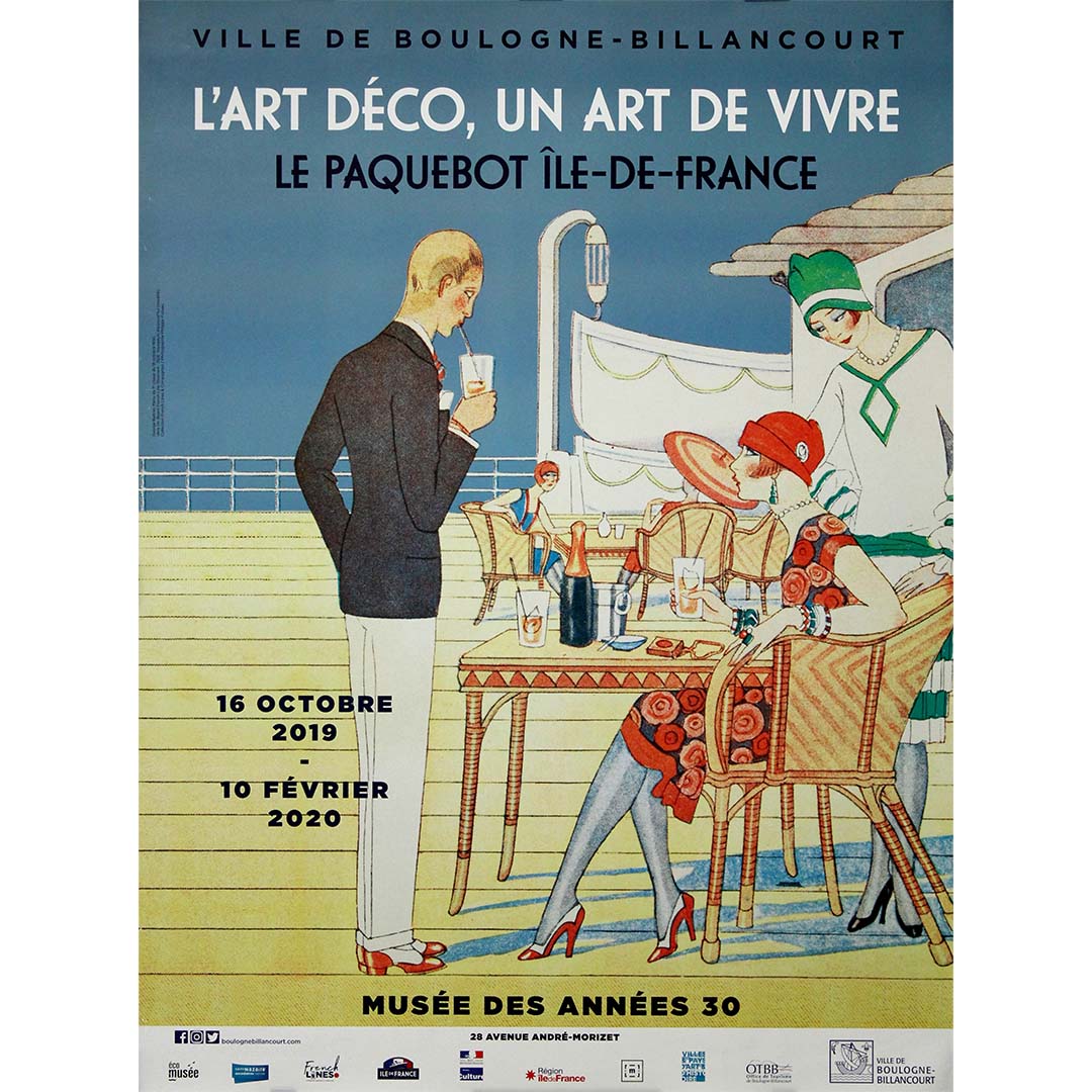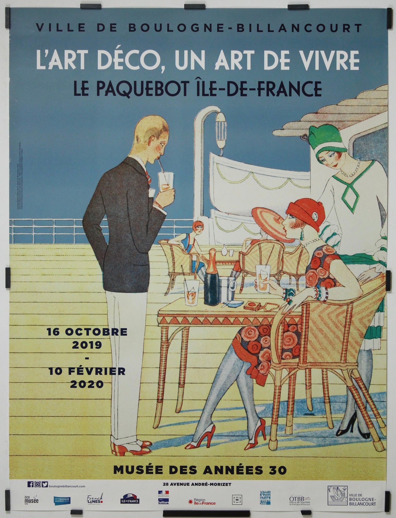 Cette affiche d'exposition originale de 2019, produite par la Ville de Boulogne-Billancourt pour le Musée des Années 30, célèbre l'élégance intemporelle de l'Art Déco à travers le prisme du luxe des paquebots transatlantiques à bord du légendaire Paquebot Île-de-France.