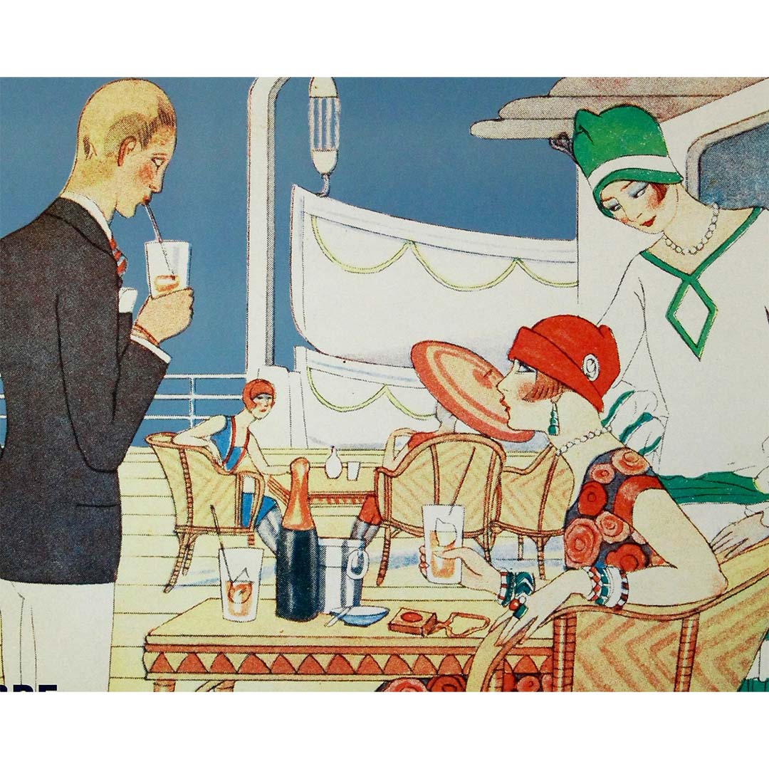 Reproduite d'après une illustration emblématique de George Barbier, figure majeure de l'Art déco, l'image saisit une scène chic sur le pont d'un navire : des passagers élégants, vêtus de tenues de soirée raffinées et coiffés de chapeaux cloche, sirotent des cocktails et se prélassent dans des fauteuils en osier, incarnant à la perfection le raffinement et l'oisiveté des années 1920. Avec ses lignes gracieuses, sa palette pastel et son style graphique affirmé, la composition est à la fois empreinte d'une douce nostalgie et d'une force visuelle saisissante, signature de l'esthétique raffinée de Barbier.