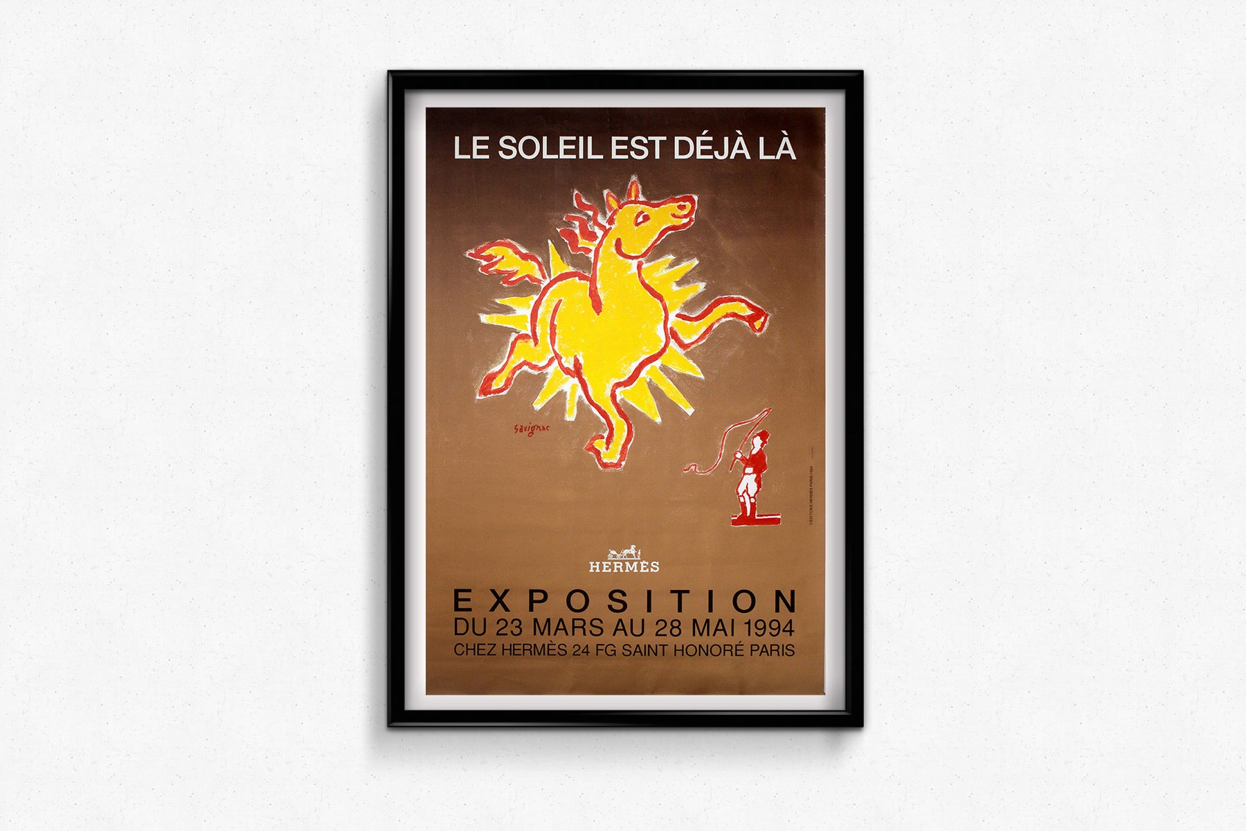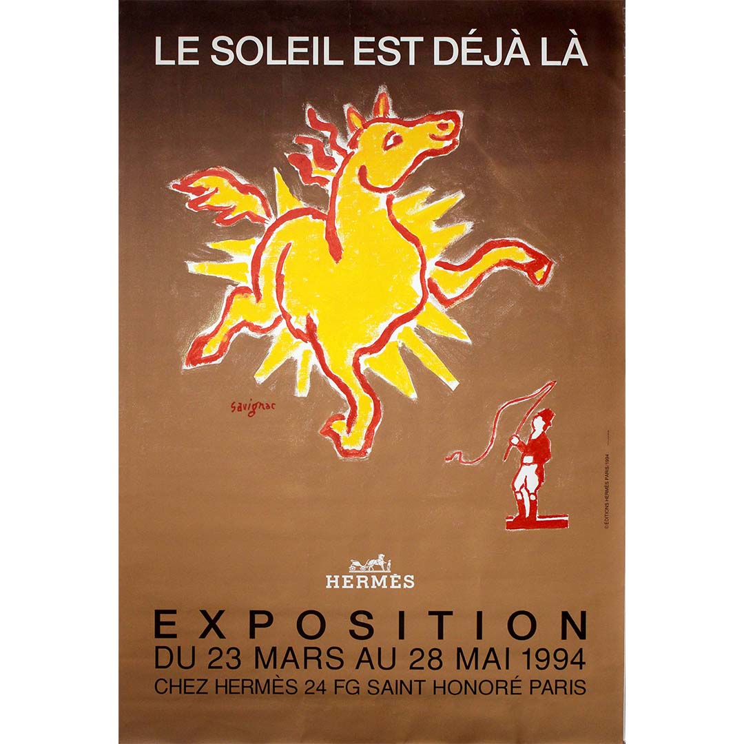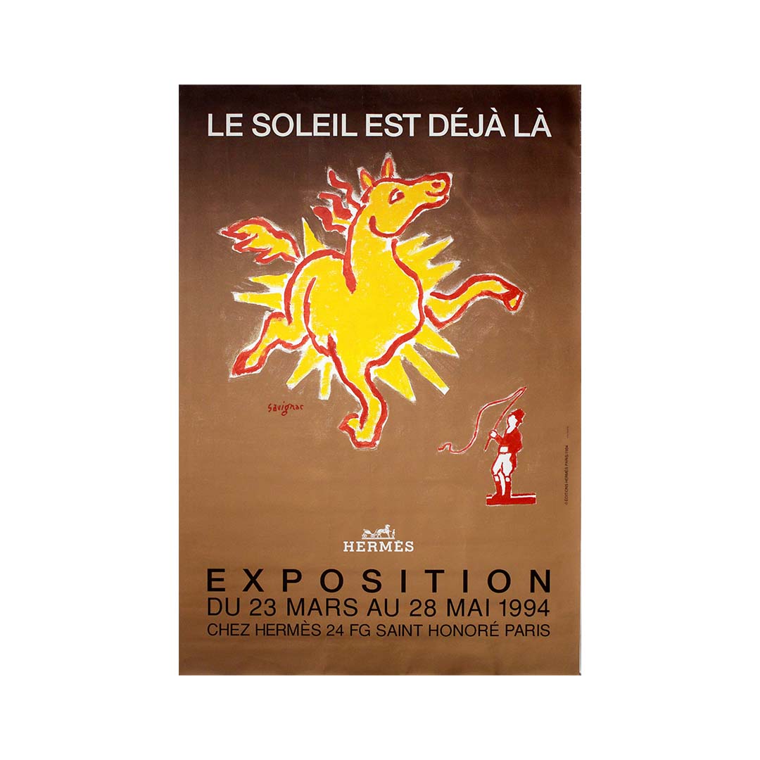 Créée par le légendaire graphiste français Raymond Savignac, cette affiche originale de 1994 a été conçue pour l'exposition Hermès intitulée « Le Soleil est déjà là » , qui s'est tenue du 23 mars au 28 mai 1994 dans la prestigieuse boutique Hermès de la rue du Faubourg Saint-Honoré à Paris.