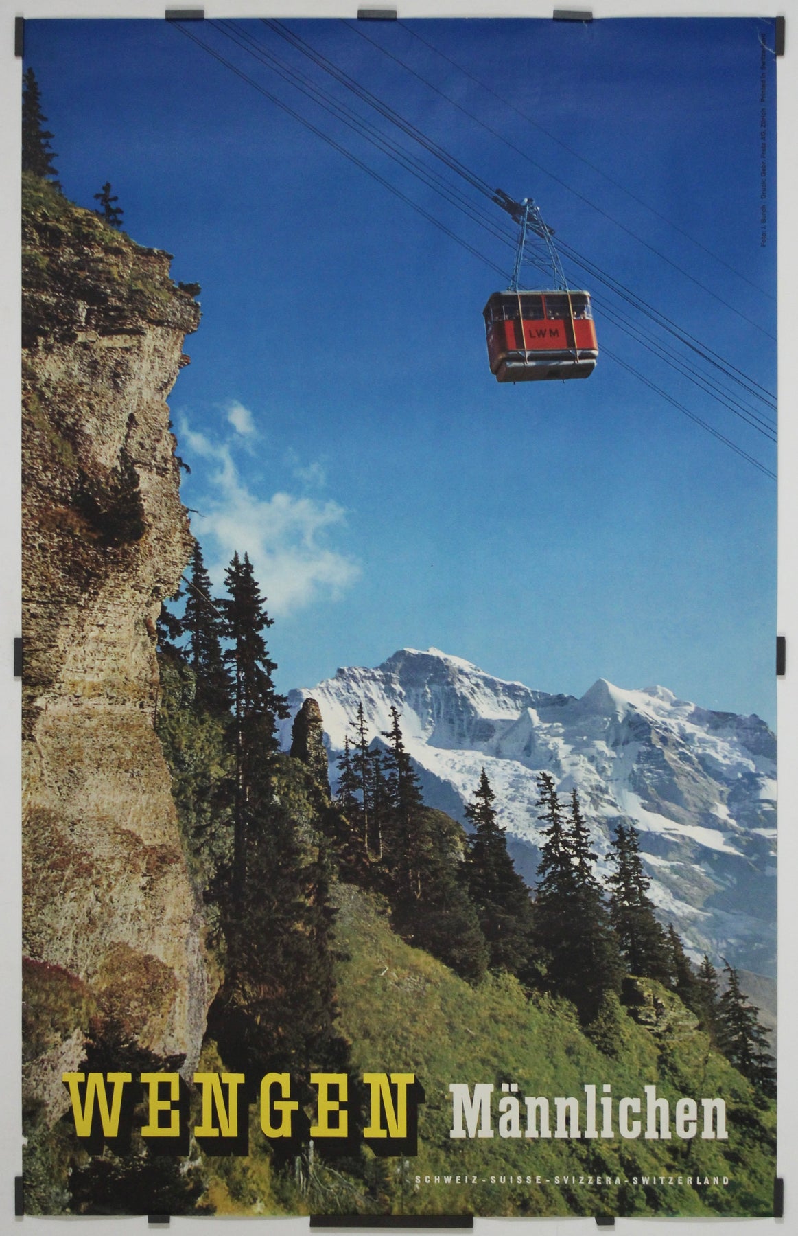 Cette superbe affiche de voyage originale de 1958, signée J. Burch, immortalise l'ascension exaltante de Wengen au Männlichen, au cœur de l'Oberland bernois, l'une des régions alpines les plus majestueuses de Suisse. Conçue pour promouvoir le tourisme dans la région de la Jungfrau, cette affiche est à la fois un hommage au tourisme suisse du milieu du XXe siècle et un symbole de l'ingénierie alpine de précision.