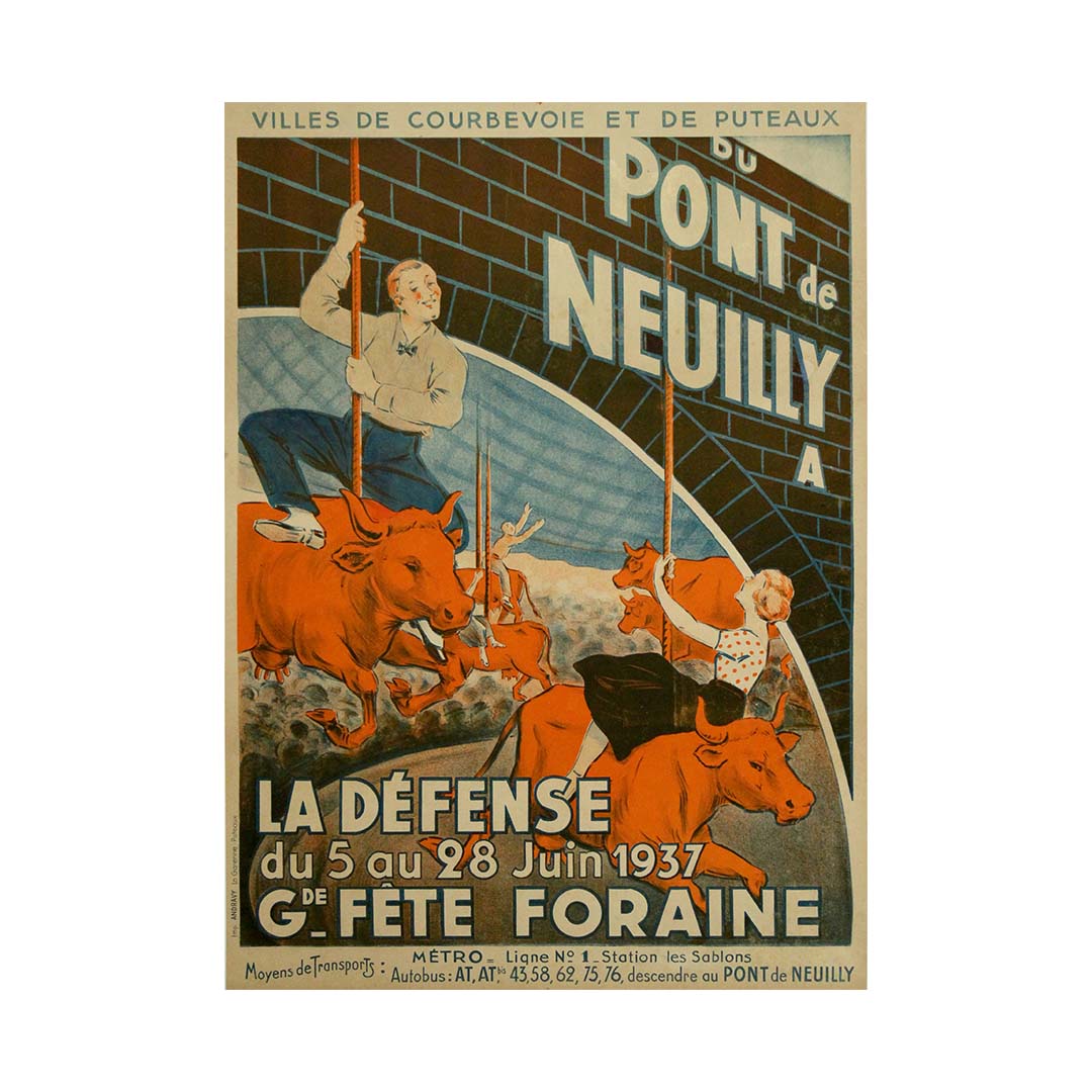 Cette affiche est un fascinant témoignage urbain, capturant un moment charnière de l'histoire parisienne. Avant que La Défense ne se pare de tours de verre et d'esplanades de béton, c'était un lieu de fêtes foraines, de cirques et d'animations de week-end. La fête foraine elle-même s'est tenue du 5 au 28 juin 1937, en même temps que l'Exposition internationale des Arts et Techniques dans la Vie Moderne, de l'autre côté de la Seine, reliant ainsi cet événement local éphémère à un vaste mouvement national d'innovation et de festivités.
