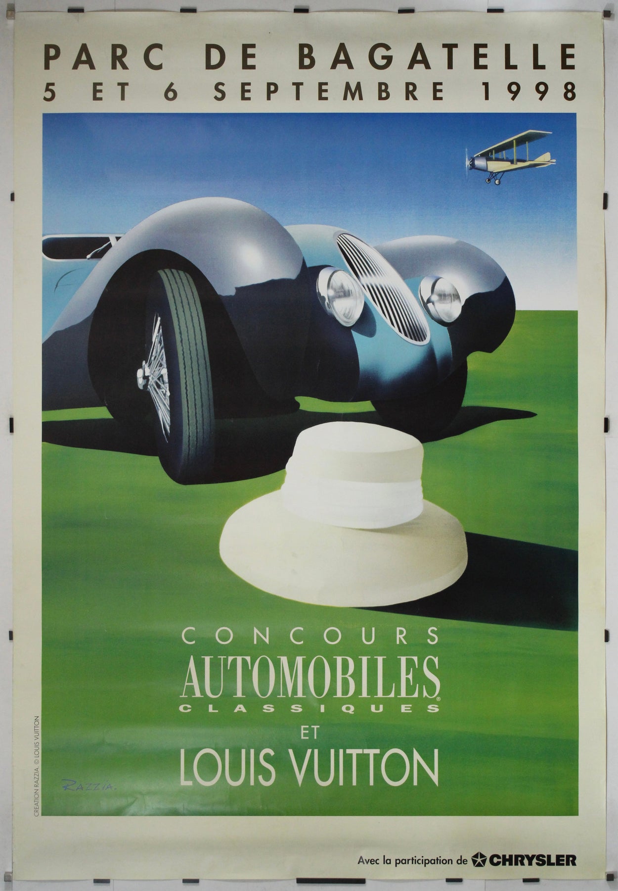 Cette affiche originale de 1998, créée par le célèbre graphiste français Gérard Courbouleix-Dénériaz, dit Razzia, a été réalisée pour le prestigieux Concours Automobiles Classiques et Louis Vuitton qui s'est tenu au Parc de Bagatelle à Paris les 5 et 6 septembre. D'une composition visuellement saisissante, elle illustre parfaitement le style iconique de Razzia : un subtil mélange d'influences Art déco et de minimalisme moderne audacieux.