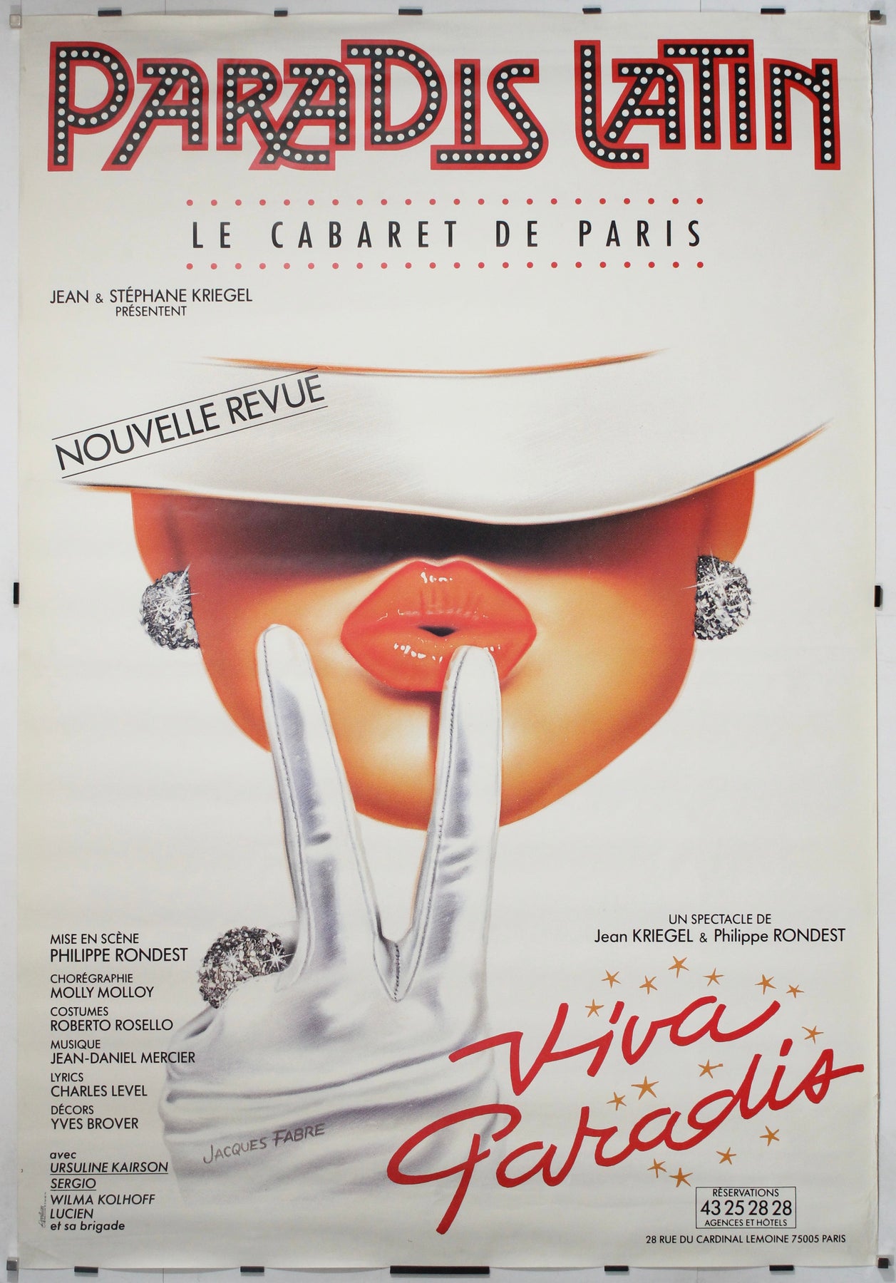 Cette affiche originale de 1990, signée Jacques Fabre, célèbre le glamour et le spectacle du Paradis Latin , l'un des cabarets les plus mythiques de Paris, et sa revue à succès Viva Paradis . Conçue pour promouvoir cette nouvelle revue dans le célèbre cabaret de la rue du Cardinal Lemoine, l'affiche rayonne d'une opulence théâtrale, de séduction et du charme intemporel des nuits parisiennes.