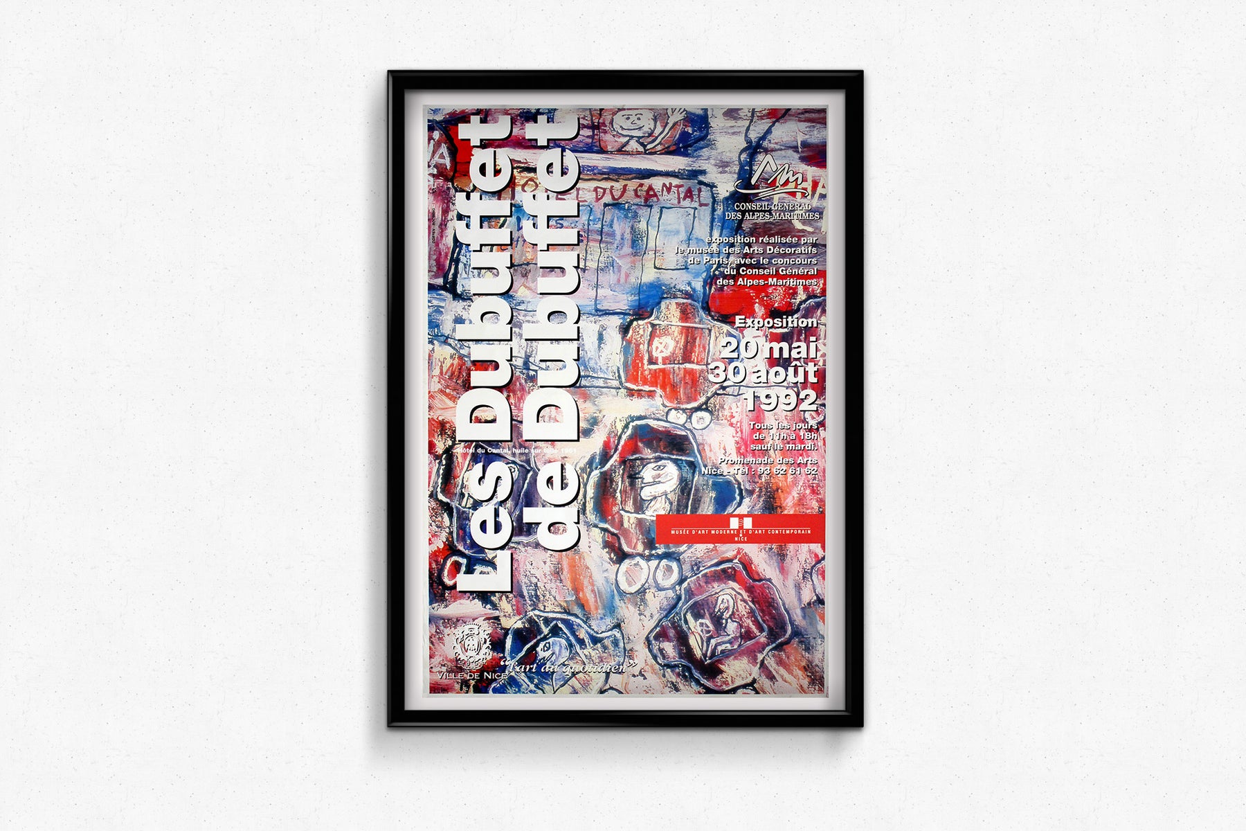 Cette affiche originale de l'exposition « Les Dubuffet de Dubuffet », datant de 1992, a été créée pour promouvoir une importante rétrospective de l'œuvre de Jean Dubuffet, présentée au Musée d'Art Moderne et d'Art Contemporain (MAMAC) de Nice. L'exposition, qui s'est tenue du 20 mai au 30 août 1992, a constitué un événement culturel majeur, célébrant le génie prolifique et anticonformiste de l'un des artistes les plus originaux du XXe siècle.