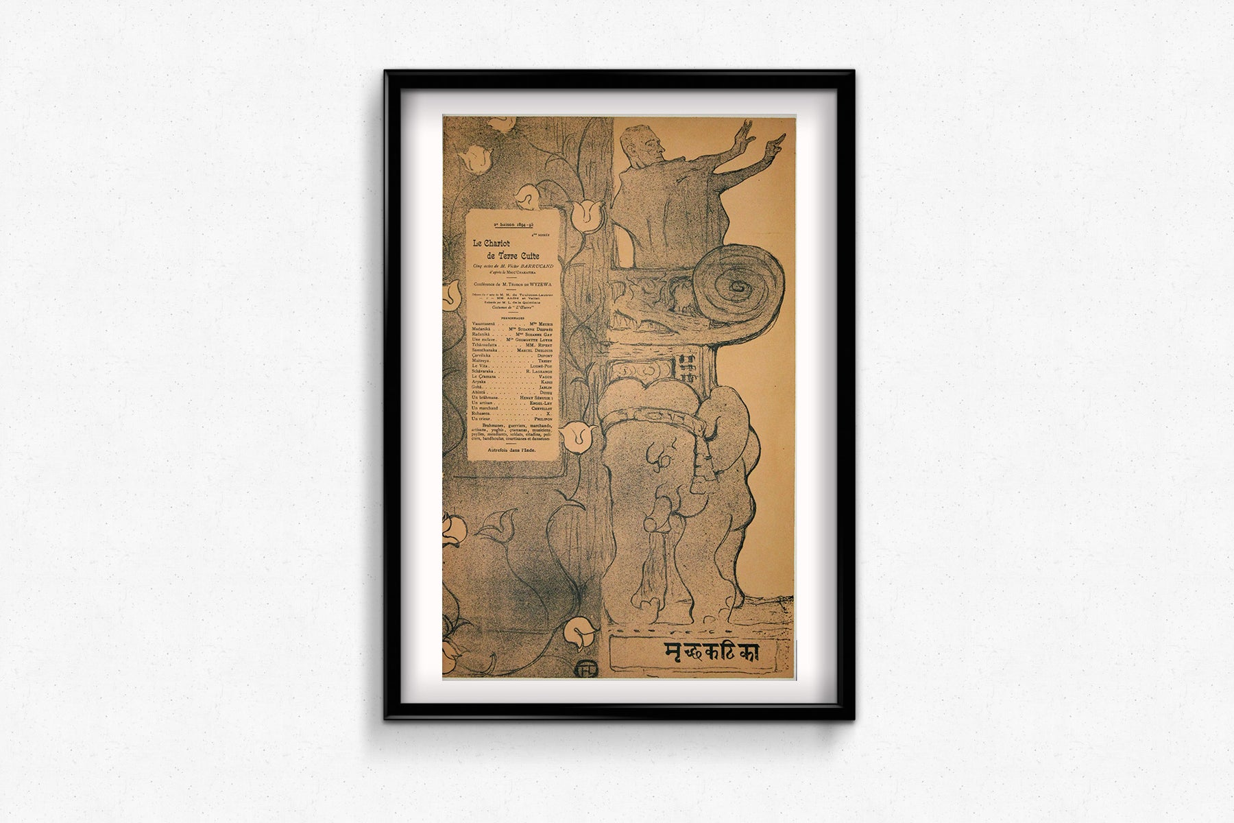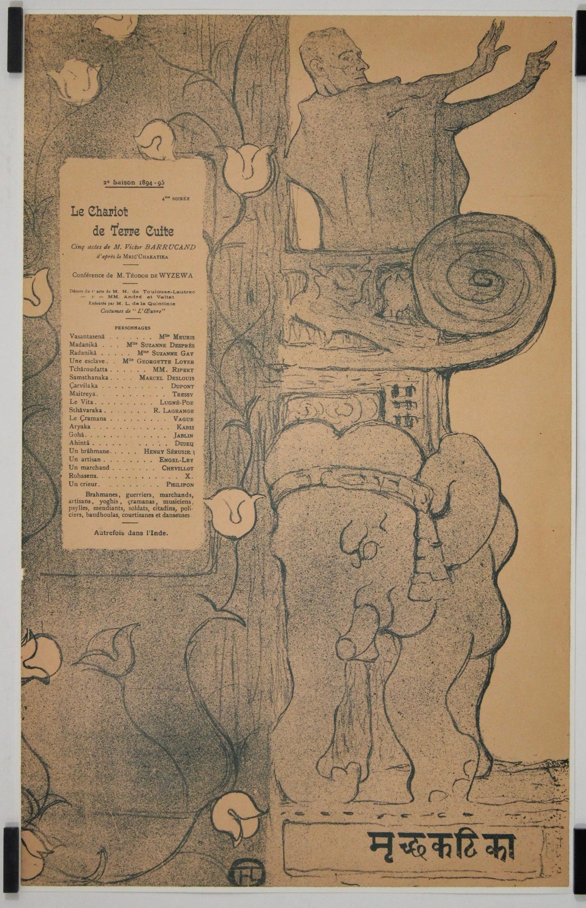 Commandée dans le cadre des productions d'avant-garde du théâtre, sous la direction de Lugné-Poe, l'affiche illustre la fusion entre Orient et Occident qui caractérisait la mise en scène. Lautrec y représente un éléphant stylisé – clin d'œil au cadre indien de la pièce – aux côtés d'une figure sculptée dans une frise architecturale, gesticulant avec emphase comme saisie en pleine représentation. Autour d'eux, des lignes fluides et une flore symbolique évoquent l'esprit Art nouveau qui animait alors le Paris de l'époque.