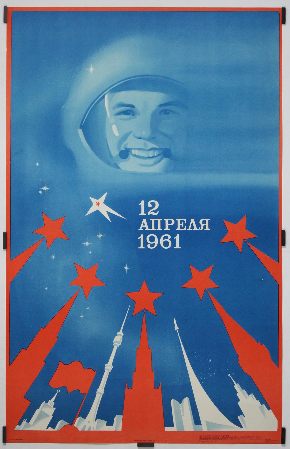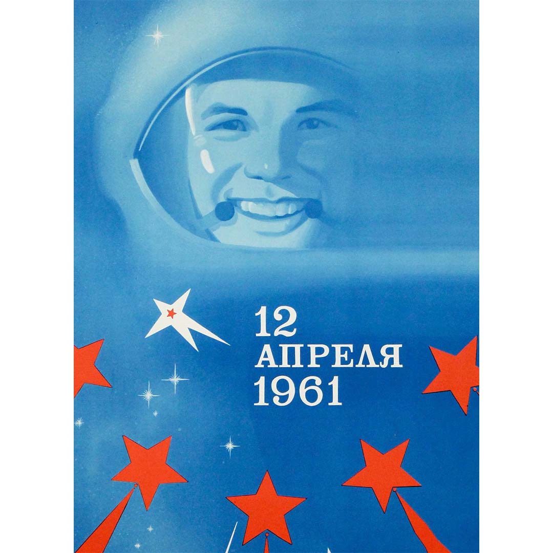 The poster belongs to a rich visual tradition of Soviet commemorative design celebrating milestones in science and technology. During the 1960s and 1970s, Gagarin became an icon not only of Soviet achievement but of global progress, and posters like this one helped shape his heroic image. The striking contrast of red and blue, the upward thrust of lines, and the celestial imagery reinforce themes of aspiration, victory, and a future defined by exploration. The date 12 April 1961 is placed prominently, transforming the image into both tribute and historical marker.